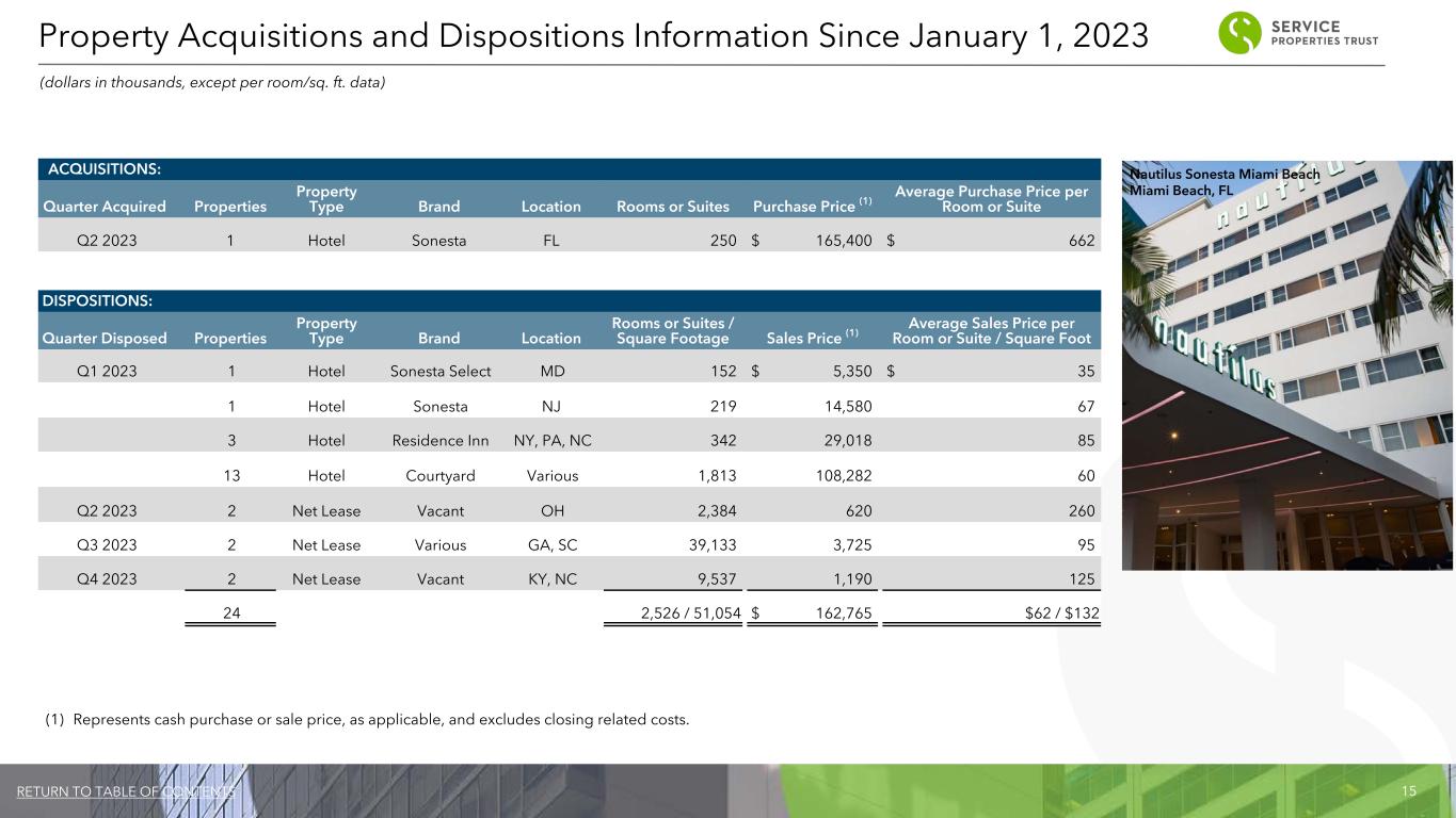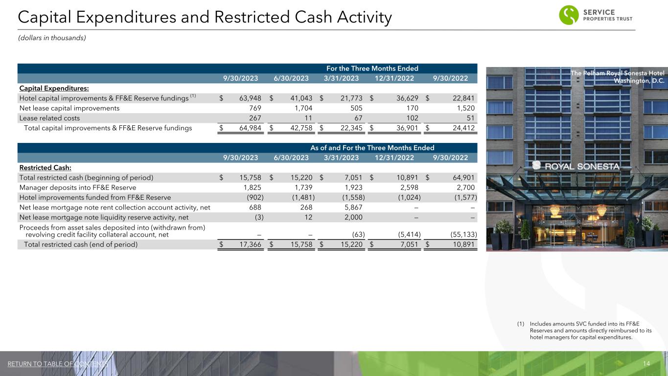 14RETURN TO TABLE OF CONTENTS For the Three Months Ended 9/30/2023 6/30/2023 3/31/2023 12/31/2022 9/30/2022 Capital Expenditures: Hotel capital improvements & FF&E Reserve fundings (1) $ 63,948 $ 41,043 $ 21,773 $ 36,629 $ 22,841 Net lease capital improvements 769 1,704 505 170 1,520 Lease related costs 267 11 67 102 51 Total capital improvements & FF&E Reserve fundings $ 64,984 $ 42,758 $ 22,345 $ 36,901 $ 24,412 As of and For the Three Months Ended 9/30/2023 6/30/2023 3/31/2023 12/31/2022 9/30/2022 Restricted Cash: Total restricted cash (beginning of period) $ 15,758 $ 15,220 $ 7,051 $ 10,891 $ 64,901 Manager deposits into FF&E Reserve 1,825 1,739 1,923 2,598 2,700 Hotel improvements funded from FF&E Reserve (902) (1,481) (1,558) (1,024) (1,577) Net lease mortgage note rent collection account activity, net 688 268 5,867 — — Net lease mortgage note liquidity reserve activity, net (3) 12 2,000 — — Proceeds from asset sales deposited into (withdrawn from) revolving credit facility collateral account, net — — (63) (5,414) (55,133) Total restricted cash (end of period) $ 17,366 $ 15,758 $ 15,220 $ 7,051 $ 10,891 (1) Includes amounts SVC funded into its FF&E Reserves and amounts directly reimbursed to its hotel managers for capital expenditures. (dollars in thousands) Capital Expenditures and Restricted Cash Activity The Pelham Royal Sonesta Hotel Washington, D.C.
