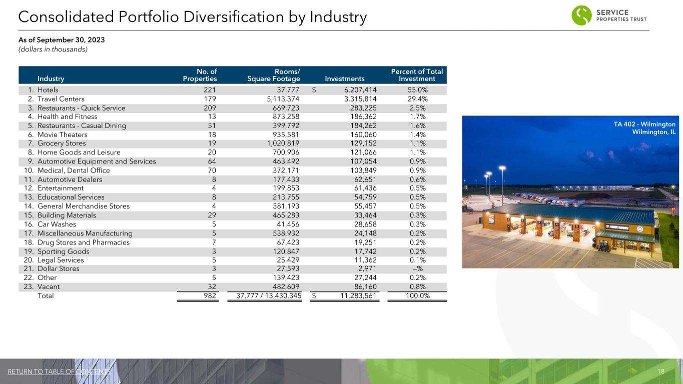 18RETURN TO TABLE OF CONTENTS Industry No. of Properties Rooms/ Square Footage Investments Percent of Total Investment 1. Hotels 221 37,777 $ 6,207,414 55.0% 2. Travel Centers 179 5,113,374 3,315,814 29.4% 3. Restaurants - Quick Service 209 669,723 283,225 2.5% 4. Health and Fitness 13 873,258 186,362 1.7% 5. Restaurants - Casual Dining 51 399,792 184,262 1.6% 6. Movie Theaters 18 935,581 160,060 1.4% 7. Grocery Stores 19 1,020,819 129,152 1.1% 8. Home Goods and Leisure 20 700,906 121,066 1.1% 9. Automotive Equipment and Services 64 463,492 107,054 0.9% 10. Medical, Dental Office 70 372,171 103,849 0.9% 11. Automotive Dealers 8 177,433 62,651 0.6% 12. Entertainment 4 199,853 61,436 0.5% 13. Educational Services 8 213,755 54,759 0.5% 14. General Merchandise Stores 4 381,193 55,457 0.5% 15. Building Materials 29 465,283 33,464 0.3% 16. Car Washes 5 41,456 28,658 0.3% 17. Miscellaneous Manufacturing 5 538,932 24,148 0.2% 18. Drug Stores and Pharmacies 7 67,423 19,251 0.2% 19. Sporting Goods 3 120,847 17,742 0.2% 20. Legal Services 5 25,429 11,362 0.1% 21. Dollar Stores 3 27,593 2,971 —% 22. Other 5 139,423 27,244 0.2% 23. Vacant 32 482,609 86,160 0.8% Total 982 37,777 / 13,430,345 $ 11,283,561 100.0% Consolidated Portfolio Diversification by Industry As of September 30, 2023 (dollars in thousands) TA 402 - Wilmington Wilmington, IL