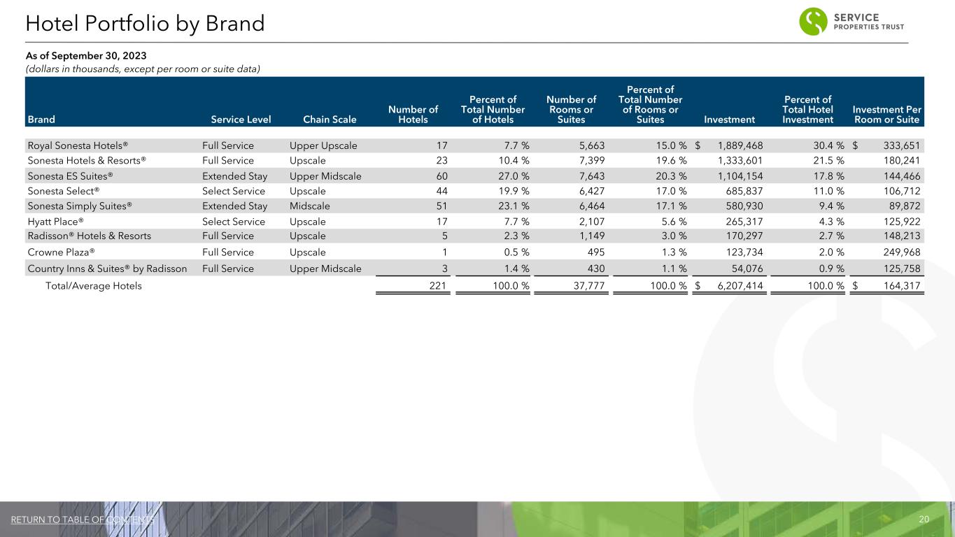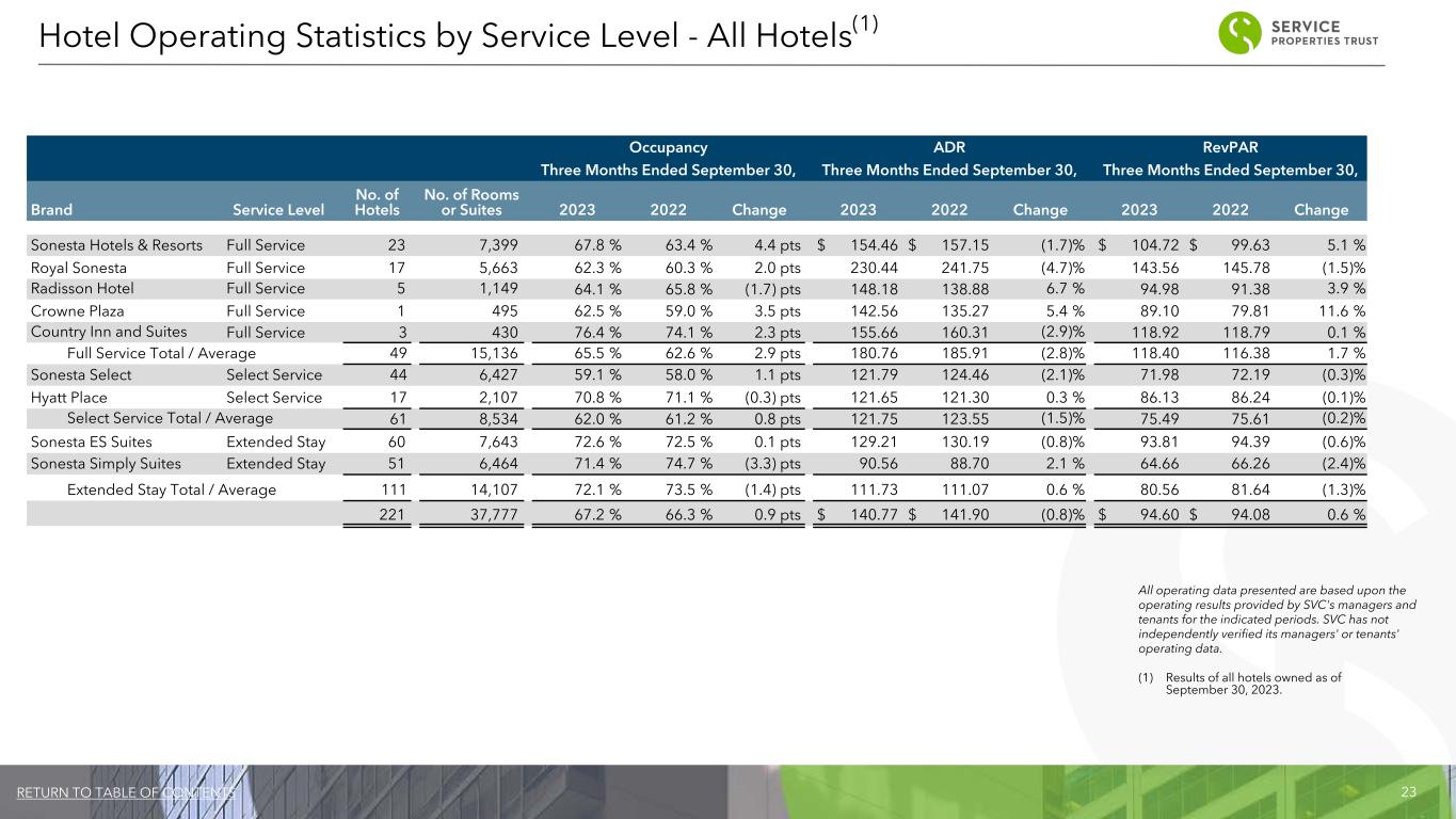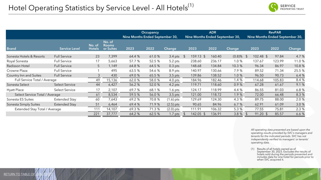 23RETURN TO TABLE OF CONTENTS Occupancy ADR RevPAR Three Months Ended September 30, Three Months Ended September 30, Three Months Ended September 30, Brand Service Level No. of Hotels No. of Rooms or Suites 2023 2022 Change 2023 2022 Change 2023 2022 Change Sonesta Hotels & Resorts Full Service 23 7,399 67.8 % 63.4 % 4.4 pts $ 154.46 $ 157.15 (1.7) % $ 104.72 $ 99.63 5.1 % Royal Sonesta Full Service 17 5,663 62.3 % 60.3 % 2.0 pts 230.44 241.75 (4.7) % 143.56 145.78 (1.5) % Radisson Hotel Full Service 5 1,149 64.1 % 65.8 % (1.7) pts 148.18 138.88 6.7 % 94.98 91.38 3.9 % Crowne Plaza Full Service 1 495 62.5 % 59.0 % 3.5 pts 142.56 135.27 5.4 % 89.10 79.81 11.6 % Country Inn and Suites Full Service 3 430 76.4 % 74.1 % 2.3 pts 155.66 160.31 (2.9) % 118.92 118.79 0.1 % Full Service Total / Average 49 15,136 65.5 % 62.6 % 2.9 pts 180.76 185.91 (2.8) % 118.40 116.38 1.7 % Sonesta Select Select Service 44 6,427 59.1 % 58.0 % 1.1 pts 121.79 124.46 (2.1) % 71.98 72.19 (0.3) % Hyatt Place Select Service 17 2,107 70.8 % 71.1 % (0.3) pts 121.65 121.30 0.3 % 86.13 86.24 (0.1) % Select Service Total / Average 61 8,534 62.0 % 61.2 % 0.8 pts 121.75 123.55 (1.5) % 75.49 75.61 (0.2) % Sonesta ES Suites Extended Stay 60 7,643 72.6 % 72.5 % 0.1 pts 129.21 130.19 (0.8) % 93.81 94.39 (0.6) % Sonesta Simply Suites Extended Stay 51 6,464 71.4 % 74.7 % (3.3) pts 90.56 88.70 2.1 % 64.66 66.26 (2.4) % Extended Stay Total / Average 111 14,107 72.1 % 73.5 % (1.4) pts 111.73 111.07 0.6 % 80.56 81.64 (1.3) % 221 37,777 67.2 % 66.3 % 0.9 pts $ 140.77 $ 141.90 (0.8) % $ 94.60 $ 94.08 0.6 % Hotel Operating Statistics by Service Level - All Hotels(1) All operating data presented are based upon the operating results provided by SVC's managers and tenants for the indicated periods. SVC has not independently verified its managers' or tenants' operating data. (1) Results of all hotels owned as of September 30, 2023.