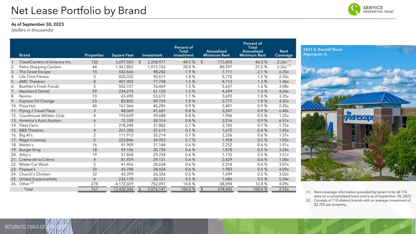 25RETURN TO TABLE OF CONTENTS Brand Properties Square Feet Investment Percent of Total Investment Annualized Minimum Rent Percent of Total Annualized Minimum Rent Rent Coverage 1. TravelCenters of America Inc. 132 3,697,503 $ 2,258,977 44.5 % $ 173,403 46.3 % 2.26x (1) 2. Petro Stopping Centers 44 1,367,802 1,015,156 20.0 % 80,597 21.5 % 2.26x (1) 3. The Great Escape 14 542,666 98,242 1.9 % 7,711 2.1 % 6.20x 4. Life Time Fitness 3 420,335 92,617 1.8 % 5,770 1.5 % 2.35x 5. AMC Theatres 8 401,403 77,738 1.5 % 4,713 1.3 % 1.46x 6. Buehler's Fresh Foods 5 502,727 76,469 1.5 % 5,657 1.5 % 3.08x 7. Heartland Dental 59 234,274 61,120 1.2 % 4,699 1.3 % 4.24x 8. Norms 10 63,490 53,673 1.1 % 3,693 1.0 % 3.35x 9. Express Oil Change 23 83,825 49,724 1.0 % 3,717 1.0 % 4.32x 10. Pizza Hut 40 167,366 45,285 0.9 % 3,401 0.9 % 2.35x 11. Flying J Travel Plaza 3 48,069 41,681 0.8 % 3,247 0.9 % 6.40x 12. Courthouse Athletic Club 4 193,659 39,688 0.8 % 1,906 0.5 % 1.25x 13. America's Auto Auction 6 72,338 38,314 0.8 % 3,216 0.9 % 6.57x 14. Fleet Farm 1 218,248 37,802 0.7 % 2,783 0.7 % 1.75x 15. B&B Theatres 4 261,300 37,619 0.7 % 1,670 0.4 % 1.45x 16. Big Al's 2 111,912 35,214 0.7 % 2,336 0.6 % 1.37x 17. Regal Cinemas 5 223,846 34,953 0.7 % 1,958 0.5 % 1.92x 18. Martin's 16 81,909 31,144 0.6 % 2,252 0.6 % 1.91x 19. Burger King 18 59,106 30,730 0.6 % 1,878 0.5 % 3.28x 20. Arby's 19 57,868 29,234 0.6 % 1,733 0.5 % 3.51x 21. Crème de la Crème 4 81,929 29,131 0.6 % 2,429 0.6 % 1.08x 22. Mister Car Wash 5 41,456 28,658 0.6 % 2,214 0.6 % 3.07x 23. Popeye's 20 45,708 28,434 0.6 % 1,983 0.5 % 4.09x 24. Church's Chicken 32 43,399 26,326 0.5 % 1,699 0.5 % 3.02x 25. United Supermarkets 6 236,178 26,121 0.5 % 1,686 0.5 % 5.34x 26. Other (2) 278 4,172,029 752,097 14.8 % 48,094 12.8 % 4.09x Total 761 13,430,345 $ 5,076,147 100.0 % $ 374,445 100.0 % 2.72x (1) Rent coverage information provided by tenant is for all 176 sites on a consolidated basis and is as of September 30, 2023. (2) Consists of 110 distinct brands with an average investment of $2,705 per property. Net Lease Portfolio by Brand As of September 30, 2023 (dollars in thousands) 2421 S. Randall Road Algonquin, IL