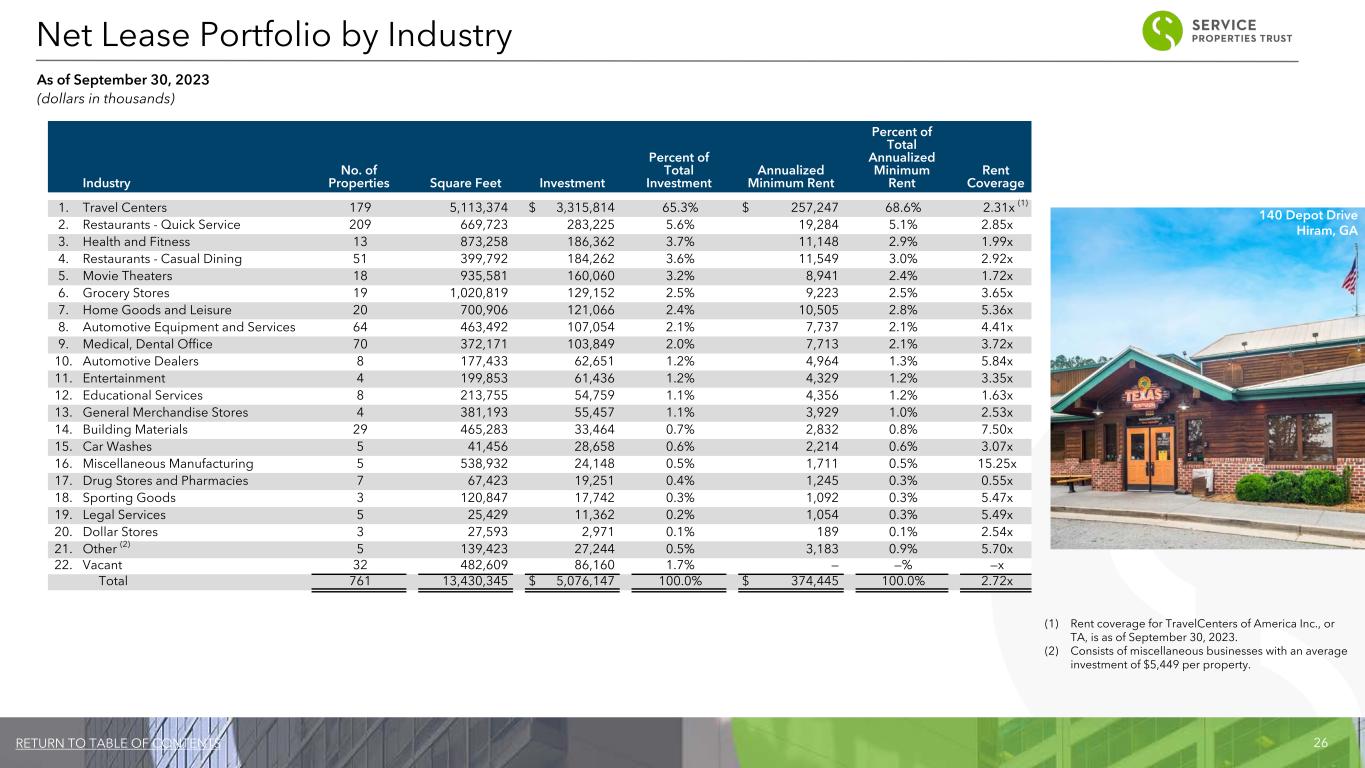 26RETURN TO TABLE OF CONTENTS Industry No. of Properties Square Feet Investment Percent of Total Investment Annualized Minimum Rent Percent of Total Annualized Minimum Rent Rent Coverage 1. Travel Centers 179 5,113,374 $ 3,315,814 65.3% $ 257,247 68.6% 2.31x (1) 2. Restaurants - Quick Service 209 669,723 283,225 5.6% 19,284 5.1% 2.85x 3. Health and Fitness 13 873,258 186,362 3.7% 11,148 2.9% 1.99x 4. Restaurants - Casual Dining 51 399,792 184,262 3.6% 11,549 3.0% 2.92x 5. Movie Theaters 18 935,581 160,060 3.2% 8,941 2.4% 1.72x 6. Grocery Stores 19 1,020,819 129,152 2.5% 9,223 2.5% 3.65x 7. Home Goods and Leisure 20 700,906 121,066 2.4% 10,505 2.8% 5.36x 8. Automotive Equipment and Services 64 463,492 107,054 2.1% 7,737 2.1% 4.41x 9. Medical, Dental Office 70 372,171 103,849 2.0% 7,713 2.1% 3.72x 10. Automotive Dealers 8 177,433 62,651 1.2% 4,964 1.3% 5.84x 11. Entertainment 4 199,853 61,436 1.2% 4,329 1.2% 3.35x 12. Educational Services 8 213,755 54,759 1.1% 4,356 1.2% 1.63x 13. General Merchandise Stores 4 381,193 55,457 1.1% 3,929 1.0% 2.53x 14. Building Materials 29 465,283 33,464 0.7% 2,832 0.8% 7.50x 15. Car Washes 5 41,456 28,658 0.6% 2,214 0.6% 3.07x 16. Miscellaneous Manufacturing 5 538,932 24,148 0.5% 1,711 0.5% 15.25x 17. Drug Stores and Pharmacies 7 67,423 19,251 0.4% 1,245 0.3% 0.55x 18. Sporting Goods 3 120,847 17,742 0.3% 1,092 0.3% 5.47x 19. Legal Services 5 25,429 11,362 0.2% 1,054 0.3% 5.49x 20. Dollar Stores 3 27,593 2,971 0.1% 189 0.1% 2.54x 21. Other (2) 5 139,423 27,244 0.5% 3,183 0.9% 5.70x 22. Vacant 32 482,609 86,160 1.7% — —% —x Total 761 13,430,345 $ 5,076,147 100.0% $ 374,445 100.0% 2.72x (1) Rent coverage for TravelCenters of America Inc., or TA, is as of September 30, 2023. (2) Consists of miscellaneous businesses with an average investment of $5,449 per property. Net Lease Portfolio by Industry As of September 30, 2023 (dollars in thousands) 140 Depot Drive Hiram, GA