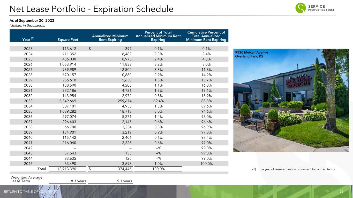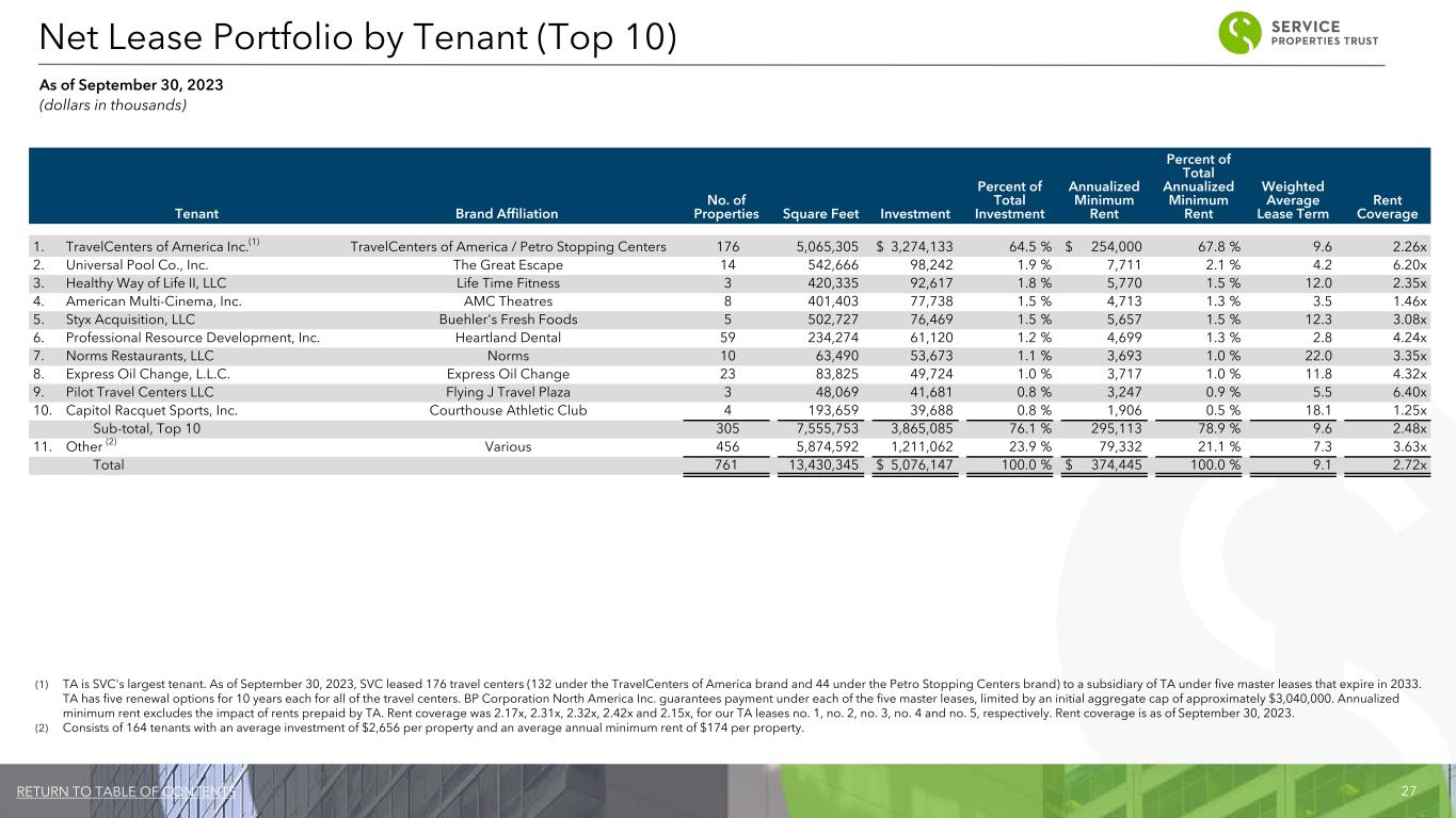 27RETURN TO TABLE OF CONTENTS Tenant Brand Affiliation No. of Properties Square Feet Investment Percent of Total Investment Annualized Minimum Rent Percent of Total Annualized Minimum Rent Weighted Average Lease Term Rent Coverage 1. TravelCenters of America Inc.(1) TravelCenters of America / Petro Stopping Centers 176 5,065,305 $ 3,274,133 64.5 % $ 254,000 67.8 % 9.6 2.26x 2. Universal Pool Co., Inc. The Great Escape 14 542,666 98,242 1.9 % 7,711 2.1 % 4.2 6.20x 3. Healthy Way of Life II, LLC Life Time Fitness 3 420,335 92,617 1.8 % 5,770 1.5 % 12.0 2.35x 4. American Multi-Cinema, Inc. AMC Theatres 8 401,403 77,738 1.5 % 4,713 1.3 % 3.5 1.46x 5. Styx Acquisition, LLC Buehler's Fresh Foods 5 502,727 76,469 1.5 % 5,657 1.5 % 12.3 3.08x 6. Professional Resource Development, Inc. Heartland Dental 59 234,274 61,120 1.2 % 4,699 1.3 % 2.8 4.24x 7. Norms Restaurants, LLC Norms 10 63,490 53,673 1.1 % 3,693 1.0 % 22.0 3.35x 8. Express Oil Change, L.L.C. Express Oil Change 23 83,825 49,724 1.0 % 3,717 1.0 % 11.8 4.32x 9. Pilot Travel Centers LLC Flying J Travel Plaza 3 48,069 41,681 0.8 % 3,247 0.9 % 5.5 6.40x 10. Capitol Racquet Sports, Inc. Courthouse Athletic Club 4 193,659 39,688 0.8 % 1,906 0.5 % 18.1 1.25x Sub-total, Top 10 305 7,555,753 3,865,085 76.1 % 295,113 78.9 % 9.6 2.48x 11. Other (2) Various 456 5,874,592 1,211,062 23.9 % 79,332 21.1 % 7.3 3.63x Total 761 13,430,345 $ 5,076,147 100.0 % $ 374,445 100.0 % 9.1 2.72x (1) TA is SVC's largest tenant. As of September 30, 2023, SVC leased 176 travel centers (132 under the TravelCenters of America brand and 44 under the Petro Stopping Centers brand) to a subsidiary of TA under five master leases that expire in 2033. TA has five renewal options for 10 years each for all of the travel centers. BP Corporation North America Inc. guarantees payment under each of the five master leases, limited by an initial aggregate cap of approximately $3,040,000. Annualized minimum rent excludes the impact of rents prepaid by TA. Rent coverage was 2.17x, 2.31x, 2.32x, 2.42x and 2.15x, for our TA leases no. 1, no. 2, no. 3, no. 4 and no. 5, respectively. Rent coverage is as of September 30, 2023. (2) Consists of 164 tenants with an average investment of $2,656 per property and an average annual minimum rent of $174 per property. Net Lease Portfolio by Tenant (Top 10) As of September 30, 2023 (dollars in thousands)