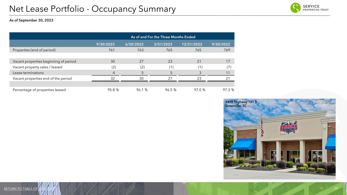 29RETURN TO TABLE OF CONTENTS As of and For the Three Months Ended 9/30/2023 6/30/2023 3/31/2023 12/31/2022 9/30/2022 Properties (end of period) 761 763 765 765 769 Vacant properties beginning of period 30 27 23 21 17 Vacant property sales / leased (2) (2) (1) (1) (7) Lease terminations 4 5 5 3 11 Vacant properties end of the period 32 30 27 23 21 Percentage of properties leased 95.8 % 96.1 % 96.5 % 97.0 % 97.3 % Net Lease Portfolio - Occupancy Summary As of September 30, 2023 2415 Highway 101 S Greenville, SC