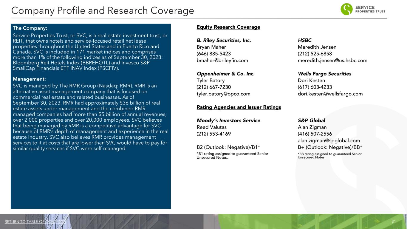 31RETURN TO TABLE OF CONTENTS Company Profile and Research Coverage The Company: Service Properties Trust, or SVC, is a real estate investment trust, or REIT, that owns hotels and service-focused retail net lease properties throughout the United States and in Puerto Rico and Canada. SVC is included in 171 market indices and comprises more than 1% of the following indices as of September 30, 2023: Bloomberg Reit Hotels Index (BBREHOTL) and Invesco S&P SmallCap Financials ETF INAV Index (PSCFIV). Management: SVC is managed by The RMR Group (Nasdaq: RMR). RMR is an alternative asset management company that is focused on commercial real estate and related businesses. As of September 30, 2023, RMR had approximately $36 billion of real estate assets under management and the combined RMR managed companies had more than $5 billion of annual revenues, over 2,000 properties and over 20,000 employees. SVC believes that being managed by RMR is a competitive advantage for SVC because of RMR’s depth of management and experience in the real estate industry. SVC also believes RMR provides management services to it at costs that are lower than SVC would have to pay for similar quality services if SVC were self-managed. Equity Research Coverage B. Riley Securities, Inc. HSBC Bryan Maher Meredith Jensen (646) 885-5423 (212) 525-6858 bmaher@brileyfin.com meredith.jensen@us.hsbc.com Oppenheimer & Co. Inc. Wells Fargo Securities Tyler Batory Dori Kesten (212) 667-7230 (617) 603-4233 tyler.batory@opco.com dori.kesten@wellsfargo.com Rating Agencies and Issuer Ratings Moody’s Investors Service S&P Global Reed Valutas Alan Zigman (212) 553-4169 (416) 507-2556 alan.zigman@spglobal.com B2 (Outlook: Negative)/B1* B+ (Outlook: Negative)/BB* *B1 rating assigned to guaranteed Senior Unsecured Notes. *BB rating assigned to guaranteed Senior Unsecured Notes.