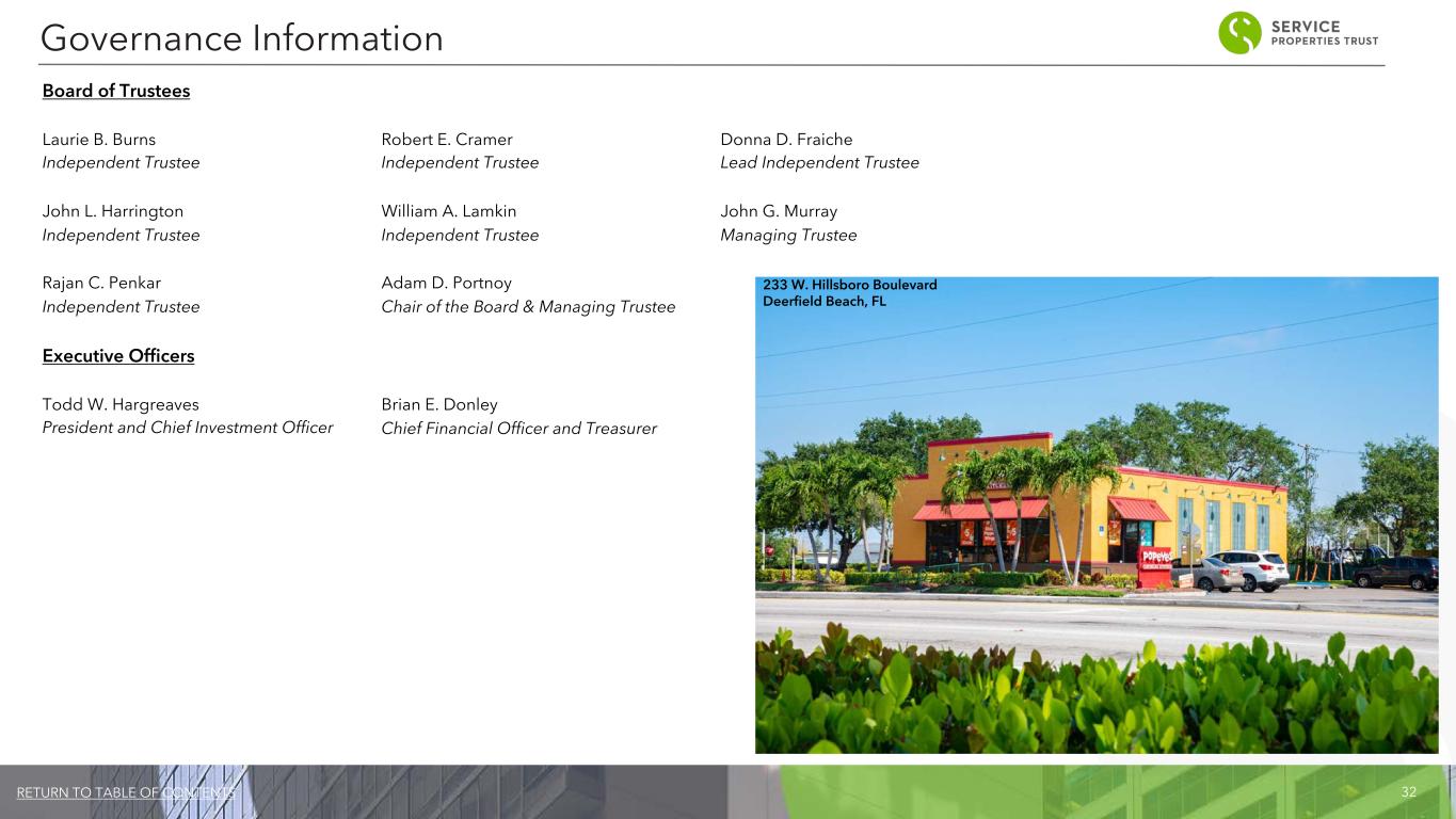 32RETURN TO TABLE OF CONTENTS Board of Trustees Laurie B. Burns Robert E. Cramer Donna D. Fraiche Independent Trustee Independent Trustee Lead Independent Trustee John L. Harrington William A. Lamkin John G. Murray Independent Trustee Independent Trustee Managing Trustee Rajan C. Penkar Adam D. Portnoy Independent Trustee Chair of the Board & Managing Trustee Executive Officers Todd W. Hargreaves Brian E. Donley President and Chief Investment Officer Chief Financial Officer and Treasurer Governance Information 233 W. Hillsboro Boulevard Deerfield Beach, FL