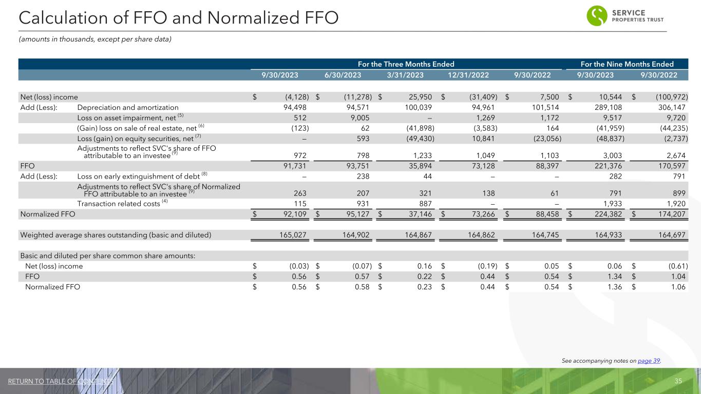 35RETURN TO TABLE OF CONTENTS For the Three Months Ended For the Nine Months Ended 9/30/2023 6/30/2023 3/31/2023 12/31/2022 9/30/2022 9/30/2023 9/30/2022 Net (loss) income $ (4,128) $ (11,278) $ 25,950 $ (31,409) $ 7,500 $ 10,544 $ (100,972) Add (Less): Depreciation and amortization 94,498 94,571 100,039 94,961 101,514 289,108 306,147 Loss on asset impairment, net (5) 512 9,005 — 1,269 1,172 9,517 9,720 (Gain) loss on sale of real estate, net (6) (123) 62 (41,898) (3,583) 164 (41,959) (44,235) Loss (gain) on equity securities, net (7) — 593 (49,430) 10,841 (23,056) (48,837) (2,737) Adjustments to reflect SVC's share of FFO attributable to an investee (9) 972 798 1,233 1,049 1,103 3,003 2,674 FFO 91,731 93,751 35,894 73,128 88,397 221,376 170,597 Add (Less): Loss on early extinguishment of debt (8) — 238 44 — — 282 791 Adjustments to reflect SVC's share of Normalized FFO attributable to an investee (9) 263 207 321 138 61 791 899 Transaction related costs (4) 115 931 887 — — 1,933 1,920 Normalized FFO $ 92,109 $ 95,127 $ 37,146 $ 73,266 $ 88,458 $ 224,382 $ 174,207 Weighted average shares outstanding (basic and diluted) 165,027 164,902 164,867 164,862 164,745 164,933 164,697 Basic and diluted per share common share amounts: Net (loss) income $ (0.03) $ (0.07) $ 0.16 $ (0.19) $ 0.05 $ 0.06 $ (0.61) FFO $ 0.56 $ 0.57 $ 0.22 $ 0.44 $ 0.54 $ 1.34 $ 1.04 Normalized FFO $ 0.56 $ 0.58 $ 0.23 $ 0.44 $ 0.54 $ 1.36 $ 1.06 Calculation of FFO and Normalized FFO (amounts in thousands, except per share data) See accompanying notes on page 39.