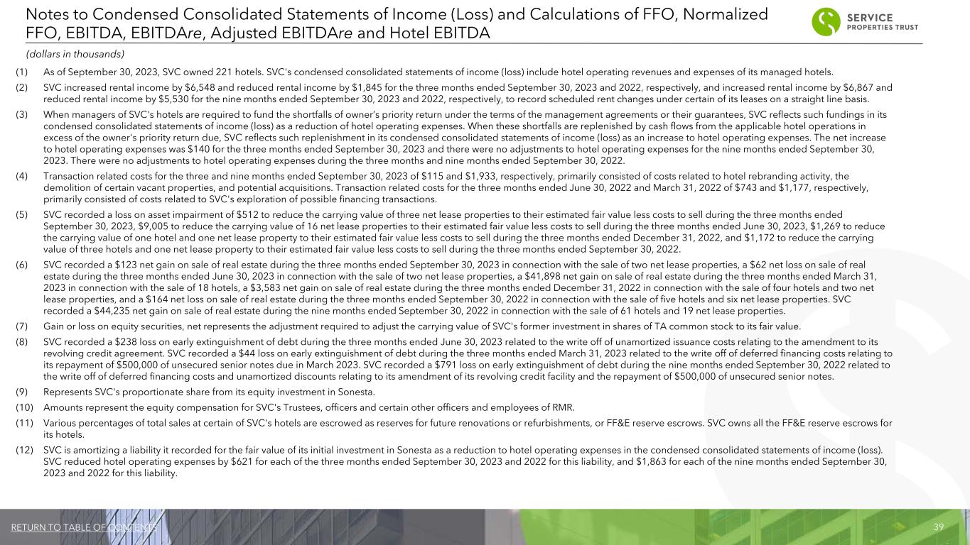39RETURN TO TABLE OF CONTENTS Notes to Condensed Consolidated Statements of Income (Loss) and Calculations of FFO, Normalized FFO, EBITDA, EBITDAre, Adjusted EBITDAre and Hotel EBITDA (dollars in thousands) (1) As of September 30, 2023, SVC owned 221 hotels. SVC's condensed consolidated statements of income (loss) include hotel operating revenues and expenses of its managed hotels. (2) SVC increased rental income by $6,548 and reduced rental income by $1,845 for the three months ended September 30, 2023 and 2022, respectively, and increased rental income by $6,867 and reduced rental income by $5,530 for the nine months ended September 30, 2023 and 2022, respectively, to record scheduled rent changes under certain of its leases on a straight line basis. (3) When managers of SVC's hotels are required to fund the shortfalls of owner’s priority return under the terms of the management agreements or their guarantees, SVC reflects such fundings in its condensed consolidated statements of income (loss) as a reduction of hotel operating expenses. When these shortfalls are replenished by cash flows from the applicable hotel operations in excess of the owner's priority return due, SVC reflects such replenishment in its condensed consolidated statements of income (loss) as an increase to hotel operating expenses. The net increase to hotel operating expenses was $140 for the three months ended September 30, 2023 and there were no adjustments to hotel operating expenses for the nine months ended September 30, 2023. There were no adjustments to hotel operating expenses during the three months and nine months ended September 30, 2022. (4) Transaction related costs for the three and nine months ended September 30, 2023 of $115 and $1,933, respectively, primarily consisted of costs related to hotel rebranding activity, the demolition of certain vacant properties, and potential acquisitions. Transaction related costs for the three months ended June 30, 2022 and March 31, 2022 of $743 and $1,177, respectively, primarily consisted of costs related to SVC's exploration of possible financing transactions. (5) SVC recorded a loss on asset impairment of $512 to reduce the carrying value of three net lease properties to their estimated fair value less costs to sell during the three months ended September 30, 2023, $9,005 to reduce the carrying value of 16 net lease properties to their estimated fair value less costs to sell during the three months ended June 30, 2023, $1,269 to reduce the carrying value of one hotel and one net lease property to their estimated fair value less costs to sell during the three months ended December 31, 2022, and $1,172 to reduce the carrying value of three hotels and one net lease property to their estimated fair value less costs to sell during the three months ended September 30, 2022. (6) SVC recorded a $123 net gain on sale of real estate during the three months ended September 30, 2023 in connection with the sale of two net lease properties, a $62 net loss on sale of real estate during the three months ended June 30, 2023 in connection with the sale of two net lease properties, a $41,898 net gain on sale of real estate during the three months ended March 31, 2023 in connection with the sale of 18 hotels, a $3,583 net gain on sale of real estate during the three months ended December 31, 2022 in connection with the sale of four hotels and two net lease properties, and a $164 net loss on sale of real estate during the three months ended September 30, 2022 in connection with the sale of five hotels and six net lease properties. SVC recorded a $44,235 net gain on sale of real estate during the nine months ended September 30, 2022 in connection with the sale of 61 hotels and 19 net lease properties. (7) Gain or loss on equity securities, net represents the adjustment required to adjust the carrying value of SVC's former investment in shares of TA common stock to its fair value. (8) SVC recorded a $238 loss on early extinguishment of debt during the three months ended June 30, 2023 related to the write off of unamortized issuance costs relating to the amendment to its revolving credit agreement. SVC recorded a $44 loss on early extinguishment of debt during the three months ended March 31, 2023 related to the write off of deferred financing costs relating to its repayment of $500,000 of unsecured senior notes due in March 2023. SVC recorded a $791 loss on early extinguishment of debt during the nine months ended September 30, 2022 related to the write off of deferred financing costs and unamortized discounts relating to its amendment of its revolving credit facility and the repayment of $500,000 of unsecured senior notes. (9) Represents SVC's proportionate share from its equity investment in Sonesta. (10) Amounts represent the equity compensation for SVC's Trustees, officers and certain other officers and employees of RMR. (11) Various percentages of total sales at certain of SVC's hotels are escrowed as reserves for future renovations or refurbishments, or FF&E reserve escrows. SVC owns all the FF&E reserve escrows for its hotels. (12) SVC is amortizing a liability it recorded for the fair value of its initial investment in Sonesta as a reduction to hotel operating expenses in the condensed consolidated statements of income (loss). SVC reduced hotel operating expenses by $621 for each of the three months ended September 30, 2023 and 2022 for this liability, and $1,863 for each of the nine months ended September 30, 2023 and 2022 for this liability.