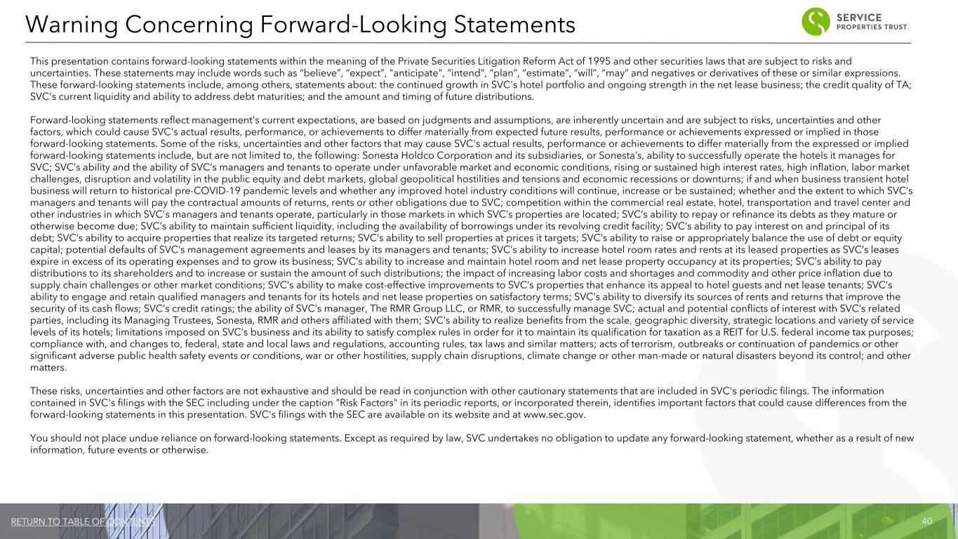 40RETURN TO TABLE OF CONTENTS This presentation contains forward-looking statements within the meaning of the Private Securities Litigation Reform Act of 1995 and other securities laws that are subject to risks and uncertainties. These statements may include words such as “believe”, “expect”, "anticipate", “intend”, “plan”, “estimate”, “will”, “may” and negatives or derivatives of these or similar expressions. These forward-looking statements include, among others, statements about: the continued growth in SVC's hotel portfolio and ongoing strength in the net lease business; the credit quality of TA; SVC's current liquidity and ability to address debt maturities; and the amount and timing of future distributions. Forward-looking statements reflect management's current expectations, are based on judgments and assumptions, are inherently uncertain and are subject to risks, uncertainties and other factors, which could cause SVC's actual results, performance, or achievements to differ materially from expected future results, performance or achievements expressed or implied in those forward-looking statements. Some of the risks, uncertainties and other factors that may cause SVC's actual results, performance or achievements to differ materially from the expressed or implied forward-looking statements include, but are not limited to, the following: Sonesta Holdco Corporation and its subsidiaries, or Sonesta’s, ability to successfully operate the hotels it manages for SVC; SVC’s ability and the ability of SVC’s managers and tenants to operate under unfavorable market and economic conditions, rising or sustained high interest rates, high inflation, labor market challenges, disruption and volatility in the public equity and debt markets, global geopolitical hostilities and tensions and economic recessions or downturns; if and when business transient hotel business will return to historical pre-COVID-19 pandemic levels and whether any improved hotel industry conditions will continue, increase or be sustained; whether and the extent to which SVC’s managers and tenants will pay the contractual amounts of returns, rents or other obligations due to SVC; competition within the commercial real estate, hotel, transportation and travel center and other industries in which SVC's managers and tenants operate, particularly in those markets in which SVC’s properties are located; SVC’s ability to repay or refinance its debts as they mature or otherwise become due; SVC’s ability to maintain sufficient liquidity, including the availability of borrowings under its revolving credit facility; SVC’s ability to pay interest on and principal of its debt; SVC’s ability to acquire properties that realize its targeted returns; SVC’s ability to sell properties at prices it targets; SVC’s ability to raise or appropriately balance the use of debt or equity capital; potential defaults of SVC’s management agreements and leases by its managers and tenants; SVC’s ability to increase hotel room rates and rents at its leased properties as SVC’s leases expire in excess of its operating expenses and to grow its business; SVC’s ability to increase and maintain hotel room and net lease property occupancy at its properties; SVC’s ability to pay distributions to its shareholders and to increase or sustain the amount of such distributions; the impact of increasing labor costs and shortages and commodity and other price inflation due to supply chain challenges or other market conditions; SVC’s ability to make cost-effective improvements to SVC’s properties that enhance its appeal to hotel guests and net lease tenants; SVC’s ability to engage and retain qualified managers and tenants for its hotels and net lease properties on satisfactory terms; SVC’s ability to diversify its sources of rents and returns that improve the security of its cash flows; SVC’s credit ratings; the ability of SVC’s manager, The RMR Group LLC, or RMR, to successfully manage SVC; actual and potential conflicts of interest with SVC’s related parties, including its Managing Trustees, Sonesta, RMR and others affiliated with them; SVC’s ability to realize benefits from the scale, geographic diversity, strategic locations and variety of service levels of its hotels; limitations imposed on SVC’s business and its ability to satisfy complex rules in order for it to maintain its qualification for taxation as a REIT for U.S. federal income tax purposes; compliance with, and changes to, federal, state and local laws and regulations, accounting rules, tax laws and similar matters; acts of terrorism, outbreaks or continuation of pandemics or other significant adverse public health safety events or conditions, war or other hostilities, supply chain disruptions, climate change or other man-made or natural disasters beyond its control; and other matters. These risks, uncertainties and other factors are not exhaustive and should be read in conjunction with other cautionary statements that are included in SVC's periodic filings. The information contained in SVC's filings with the SEC including under the caption "Risk Factors" in its periodic reports, or incorporated therein, identifies important factors that could cause differences from the forward-looking statements in this presentation. SVC's filings with the SEC are available on its website and at www.sec.gov. You should not place undue reliance on forward-looking statements. Except as required by law, SVC undertakes no obligation to update any forward-looking statement, whether as a result of new information, future events or otherwise. Warning Concerning Forward-Looking Statements
