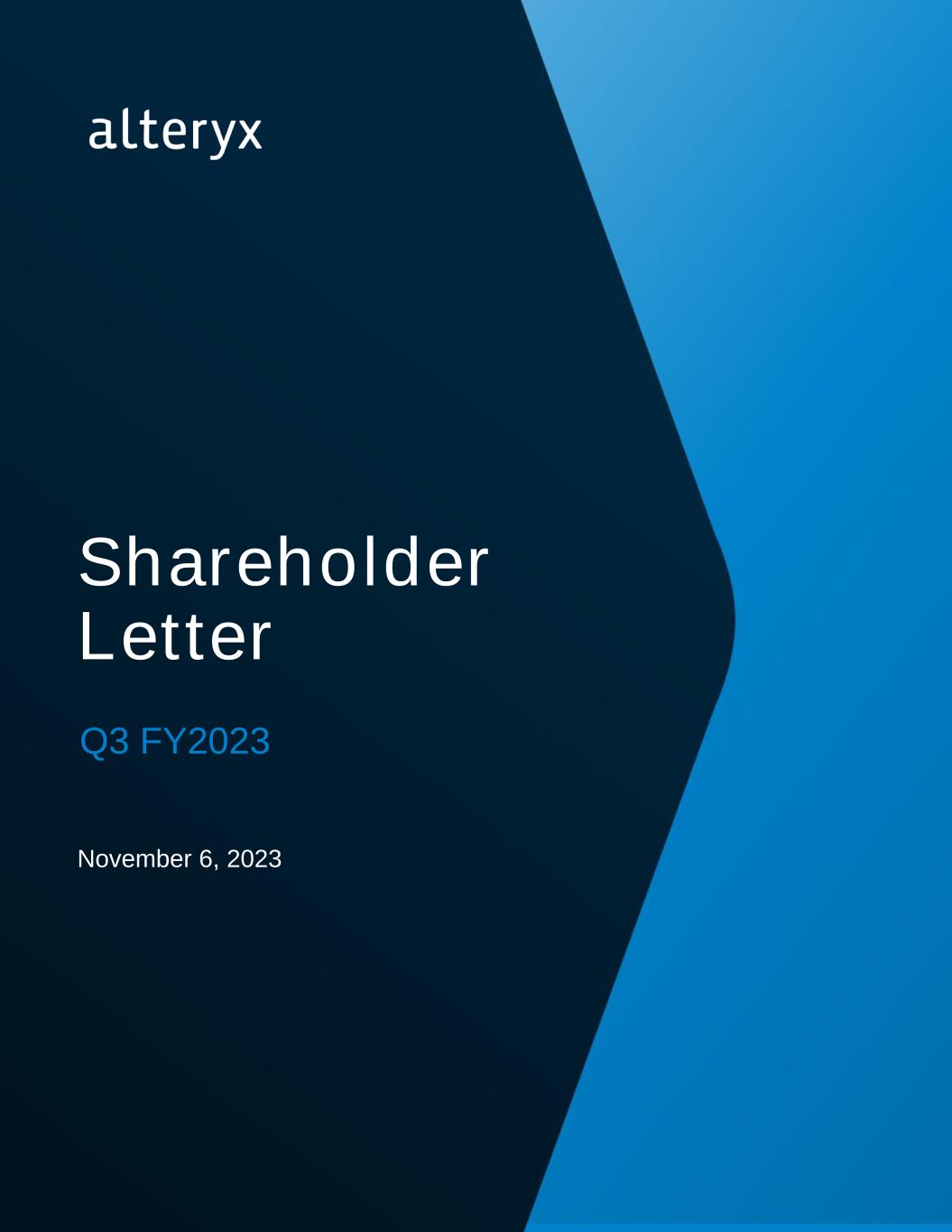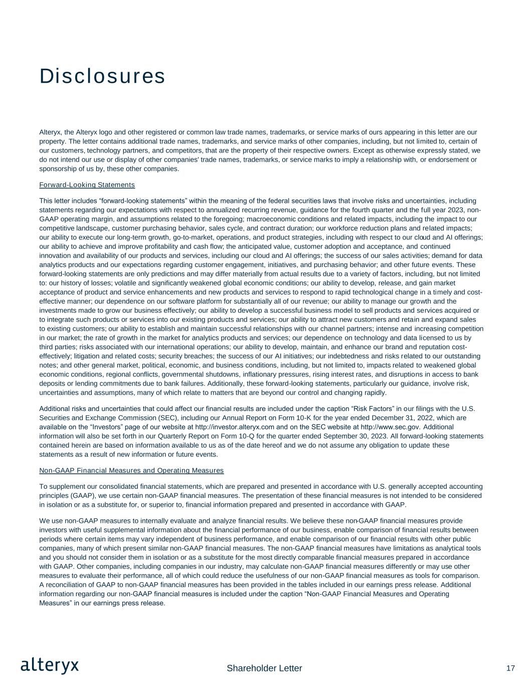 Disclosures Alteryx, the Alteryx logo and other registered or common law trade names, trademarks, or service marks of ours appearing in this letter are our property. The letter contains additional trade names, trademarks, and service marks of other companies, including, but not limited to, certain of our customers, technology partners, and competitors, that are the property of their respective owners. Except as otherwise expressly stated, we do not intend our use or display of other companies' trade names, trademarks, or service marks to imply a relationship with, or endorsement or sponsorship of us by, these other companies. Forward-Looking Statements This letter includes “forward-looking statements” within the meaning of the federal securities laws that involve risks and uncertainties, including statements regarding our expectations with respect to annualized recurring revenue, guidance for the fourth quarter and the full year 2023, non- GAAP operating margin, and assumptions related to the foregoing; macroeconomic conditions and related impacts, including the impact to our competitive landscape, customer purchasing behavior, sales cycle, and contract duration; our workforce reduction plans and related impacts; our ability to execute our long-term growth, go-to-market, operations, and product strategies, including with respect to our cloud and AI offerings; our ability to achieve and improve profitability and cash flow; the anticipated value, customer adoption and acceptance, and continued innovation and availability of our products and services, including our cloud and AI offerings; the success of our sales activities; demand for data analytics products and our expectations regarding customer engagement, initiatives, and purchasing behavior; and other future events. These forward-looking statements are only predictions and may differ materially from actual results due to a variety of factors, including, but not limited to: our history of losses; volatile and significantly weakened global economic conditions; our ability to develop, release, and gain market acceptance of product and service enhancements and new products and services to respond to rapid technological change in a timely and cost- effective manner; our dependence on our software platform for substantially all of our revenue; our ability to manage our growth and the investments made to grow our business effectively; our ability to develop a successful business model to sell products and services acquired or to integrate such products or services into our existing products and services; our ability to attract new customers and retain and expand sales to existing customers; our ability to establish and maintain successful relationships with our channel partners; intense and increasing competition in our market; the rate of growth in the market for analytics products and services; our dependence on technology and data licensed to us by third parties; risks associated with our international operations; our ability to develop, maintain, and enhance our brand and reputation cost- effectively; litigation and related costs; security breaches; the success of our AI initiatives; our indebtedness and risks related to our outstanding notes; and other general market, political, economic, and business conditions, including, but not limited to, impacts related to weakened global economic conditions, regional conflicts, governmental shutdowns, inflationary pressures, rising interest rates, and disruptions in access to bank deposits or lending commitments due to bank failures. Additionally, these forward-looking statements, particularly our guidance, involve risk, uncertainties and assumptions, many of which relate to matters that are beyond our control and changing rapidly. Additional risks and uncertainties that could affect our financial results are included under the caption “Risk Factors” in our filings with the U.S. Securities and Exchange Commission (SEC), including our Annual Report on Form 10-K for the year ended December 31, 2022, which are available on the “Investors” page of our website at http://investor.alteryx.com and on the SEC website at http://www.sec.gov. Additional information will also be set forth in our Quarterly Report on Form 10-Q for the quarter ended September 30, 2023. All forward-looking statements contained herein are based on information available to us as of the date hereof and we do not assume any obligation to update these statements as a result of new information or future events. Non-GAAP Financial Measures and Operating Measures To supplement our consolidated financial statements, which are prepared and presented in accordance with U.S. generally accepted accounting principles (GAAP), we use certain non-GAAP financial measures. The presentation of these financial measures is not intended to be considered in isolation or as a substitute for, or superior to, financial information prepared and presented in accordance with GAAP. We use non-GAAP measures to internally evaluate and analyze financial results. We believe these non-GAAP financial measures provide investors with useful supplemental information about the financial performance of our business, enable comparison of financial results between periods where certain items may vary independent of business performance, and enable comparison of our financial results with other public companies, many of which present similar non-GAAP financial measures. The non-GAAP financial measures have limitations as analytical tools and you should not consider them in isolation or as a substitute for the most directly comparable financial measures prepared in accordance with GAAP. Other companies, including companies in our industry, may calculate non-GAAP financial measures differently or may use other measures to evaluate their performance, all of which could reduce the usefulness of our non-GAAP financial measures as tools for comparison. A reconciliatio