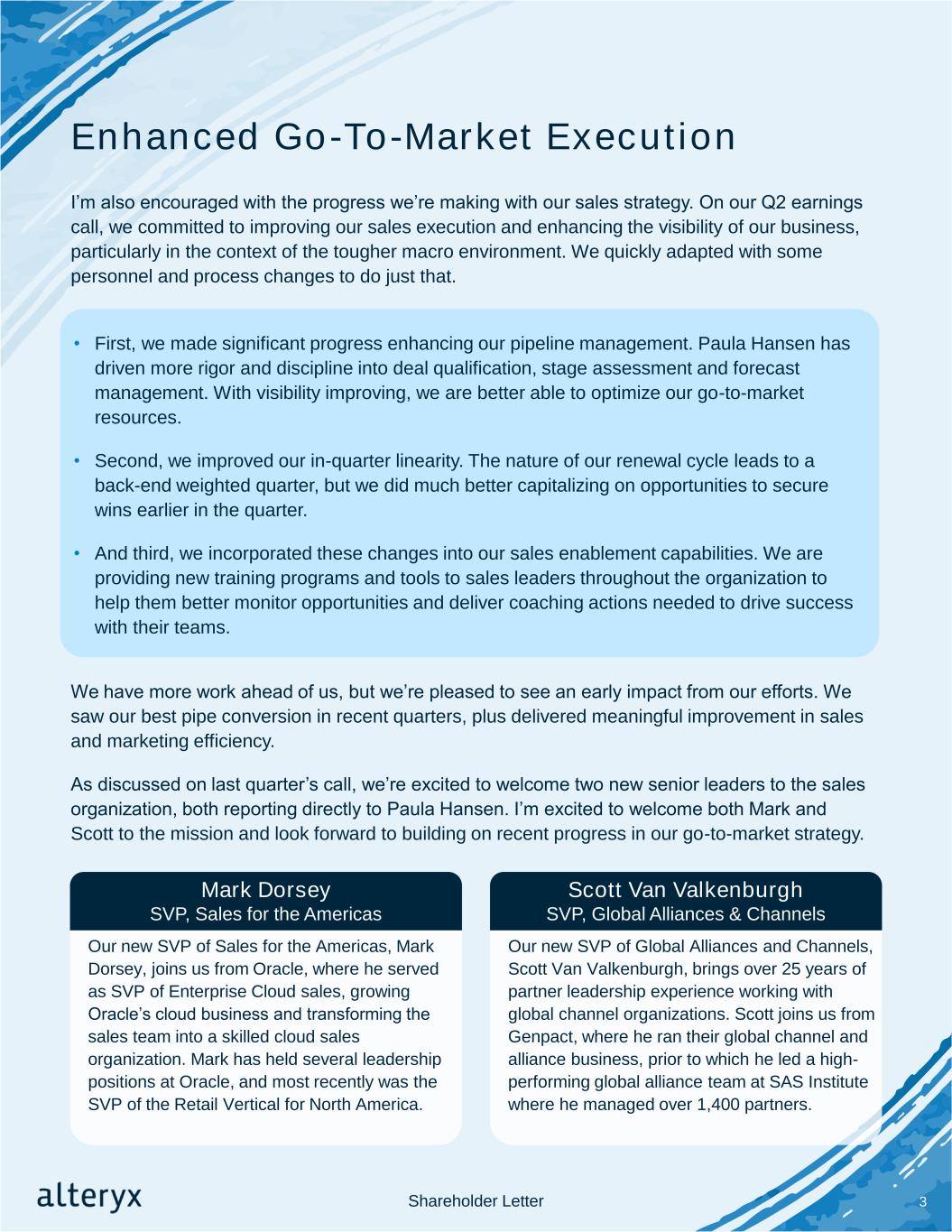 Enhanced Go-To-Market Execution I’m also encouraged with the progress we’re making with our sales strategy. On our Q2 earnings call, we committed to improving our sales execution and enhancing the visibility of our business, particularly in the context of the tougher macro environment. We quickly adapted with some personnel and process changes to do just that. 3 We have more work ahead of us, but we’re pleased to see an early impact from our efforts. We saw our best pipe conversion in recent quarters, plus delivered meaningful improvement in sales and marketing efficiency. As discussed on last quarter’s call, we’re excited to welcome two new senior leaders to the sales organization, both reporting directly to Paula Hansen. I’m excited to welcome both Mark and Scott to the mission and look forward to building on recent progress in our go-to-market strategy. • First, we made significant progress enhancing our pipeline management. Paula Hansen has driven more rigor and discipline into deal qualification, stage assessment and forecast management. With visibility improving, we are better able to optimize our go-to-market resources. • Second, we improved our in-quarter linearity. The nature of our renewal cycle leads to a back-end weighted quarter, but we did much better capitalizing on opportunities to secure wins earlier in the quarter. • And third, we incorporated these changes into our sales enablement capabilities. We are providing new training programs and tools to sales leaders throughout the organization to help them better monitor opportunities and deliver coaching actions needed to drive success with their teams. Shareholder Letter Our new SVP of Global Alliances and Channels, Scott Van Valkenburgh, brings over 25 years of partner leadership experience working with global channel organizations. Scott joins us from Genpact, where he ran their global channel and alliance business, prior to which he led a high- performing global alliance team at SAS Institute where he managed over 1,400 partners. Our new SVP of Sales for the Americas, Mark Dorsey, joins us from Oracle, where he served as SVP of Enterprise Cloud sales, growing Oracle’s cloud business and transforming the sales team into a skilled cloud sales organization. Mark has held several leadership positions at Oracle, and most recently was the SVP of the Retail Vertical for North America. Mark Dorsey SVP, Sales for the Americas Scott Van Valkenburgh SVP, Global Alliances & Channels