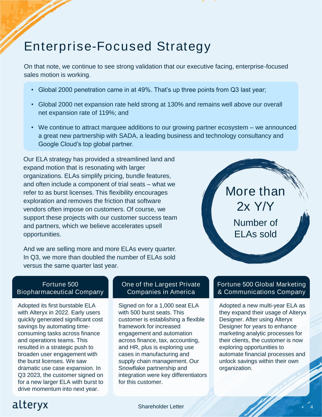 Enterprise-Focused Strategy On that note, we continue to see strong validation that our executive facing, enterprise-focused sales motion is working. Our ELA strategy has provided a streamlined land and expand motion that is resonating with larger organizations. ELAs simplify pricing, bundle features, and often include a component of trial seats – what we refer to as burst licenses. This flexibility encourages exploration and removes the friction that software vendors often impose on customers. Of course, we support these projects with our customer success team and partners, which we believe accelerates upsell opportunities. And we are selling more and more ELAs every quarter. In Q3, we more than doubled the number of ELAs sold versus the same quarter last year. More than 2x Y/Y Number of ELAs sold • Global 2000 penetration came in at 49%. That’s up three points from Q3 last year; • Global 2000 net expansion rate held strong at 130% and remains well above our overall net expansion rate of 119%; and • We continue to attract marquee additions to our growing partner ecosystem – we announced a great new partnership with SADA, a leading business and technology consultancy and Google Cloud’s top global partner. Adopted its first burstable ELA with Alteryx in 2022. Early users quickly generated significant cost savings by automating time- consuming tasks across finance and operations teams. This resulted in a strategic push to broaden user engagement with the burst licenses. We saw dramatic use case expansion. In Q3 2023, the customer signed on for a new larger ELA with burst to drive momentum into next year. Fortune 500 Biopharmaceutical Company Signed on for a 1,000 seat ELA with 500 burst seats. This customer is establishing a flexible framework for increased engagement and automation across finance, tax, accounting, and HR, plus is exploring use cases in manufacturing and supply chain management. Our Snowflake partnership and integration were key differentiators for this customer. One of the Largest Private Companies in America Adopted a new multi-year ELA as they expand their usage of Alteryx Designer. After using Alteryx Designer for years to enhance marketing analytic processes for their clients, the customer is now exploring opportunities to automate financial processes and unlock savings within their own organization. Fortune 500 Global Marketing & Communications Company Shareholder Letter 4