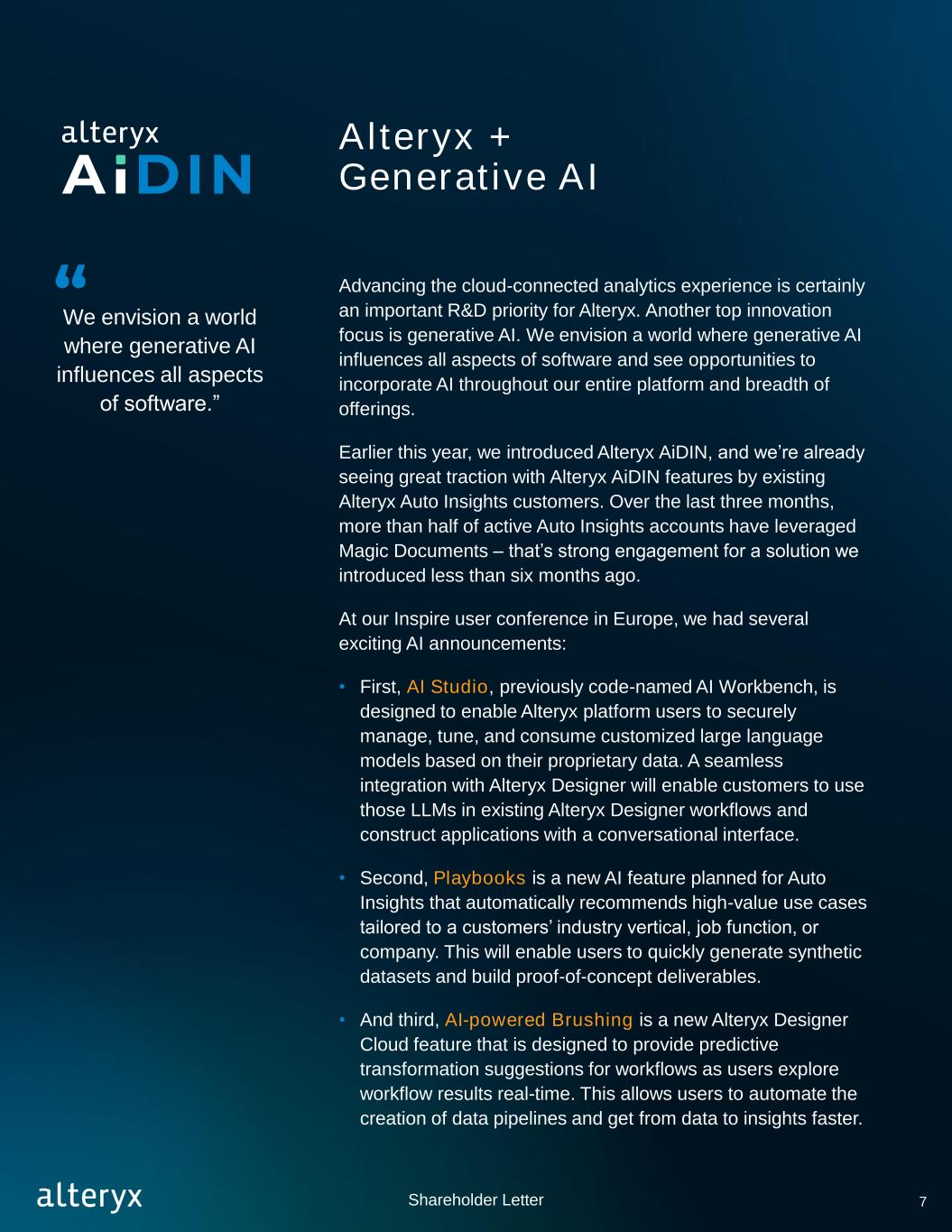 Alteryx + Generative AI Advancing the cloud-connected analytics experience is certainly an important R&D priority for Alteryx. Another top innovation focus is generative AI. We envision a world where generative AI influences all aspects of software and see opportunities to incorporate AI throughout our entire platform and breadth of offerings. Earlier this year, we introduced Alteryx AiDIN, and we’re already seeing great traction with Alteryx AiDIN features by existing Alteryx Auto Insights customers. Over the last three months, more than half of active Auto Insights accounts have leveraged Magic Documents – that’s strong engagement for a solution we introduced less than six months ago. At our Inspire user conference in Europe, we had several exciting AI announcements: • First, AI Studio, previously code-named AI Workbench, is designed to enable Alteryx platform users to securely manage, tune, and consume customized large language models based on their proprietary data. A seamless integration with Alteryx Designer will enable customers to use those LLMs in existing Alteryx Designer workflows and construct applications with a conversational interface. • Second, Playbooks is a new AI feature planned for Auto Insights that automatically recommends high-value use cases tailored to a customers’ industry vertical, job function, or company. This will enable users to quickly generate synthetic datasets and build proof-of-concept deliverables. • And third, AI-powered Brushing is a new Alteryx Designer Cloud feature that is designed to provide predictive transformation suggestions for workflows as users explore workflow results real-time. This allows users to automate the creation of data pipelines and get from data to insights faster. We envision a world where generative AI influences all aspects of software.” 7Shareholder Letter