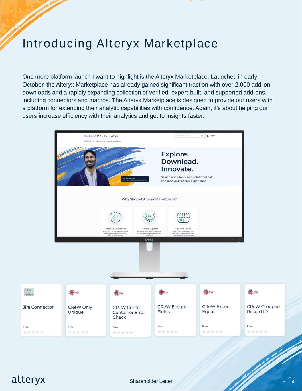 Introducing Alteryx Marketplace 8 One more platform launch I want to highlight is the Alteryx Marketplace. Launched in early October, the Alteryx Marketplace has already gained significant traction with over 2,000 add-on downloads and a rapidly expanding collection of verified, expert-built, and supported add-ons, including connectors and macros. The Alteryx Marketplace is designed to provide our users with a platform for extending their analytic capabilities with confidence. Again, it’s about helping our users increase efficiency with their analytics and get to insights faster. Shareholder Letter