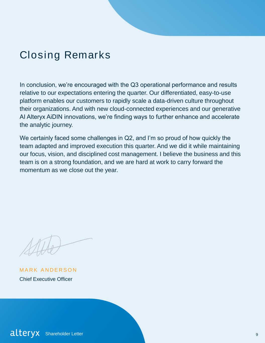Closing Remarks In conclusion, we’re encouraged with the Q3 operational performance and results relative to our expectations entering the quarter. Our differentiated, easy-to-use platform enables our customers to rapidly scale a data-driven culture throughout their organizations. And with new cloud-connected experiences and our generative AI Alteryx AiDIN innovations, we’re finding ways to further enhance and accelerate the analytic journey. We certainly faced some challenges in Q2, and I’m so proud of how quickly the team adapted and improved execution this quarter. And we did it while maintaining our focus, vision, and disciplined cost management. I believe the business and this team is on a strong foundation, and we are hard at work to carry forward the momentum as we close out the year. Chief Executive Officer M AR K AN D E R S O N 9Shareholder Letter