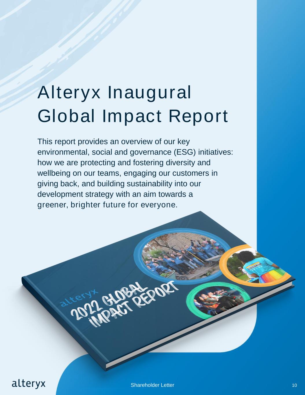 Alteryx Inaugural Global Impact Report This report provides an overview of our key environmental, social and governance (ESG) initiatives: how we are protecting and fostering diversity and wellbeing on our teams, engaging our customers in giving back, and building sustainability into our development strategy with an aim towards a greener, brighter future for everyone. 10Shareholder Letter