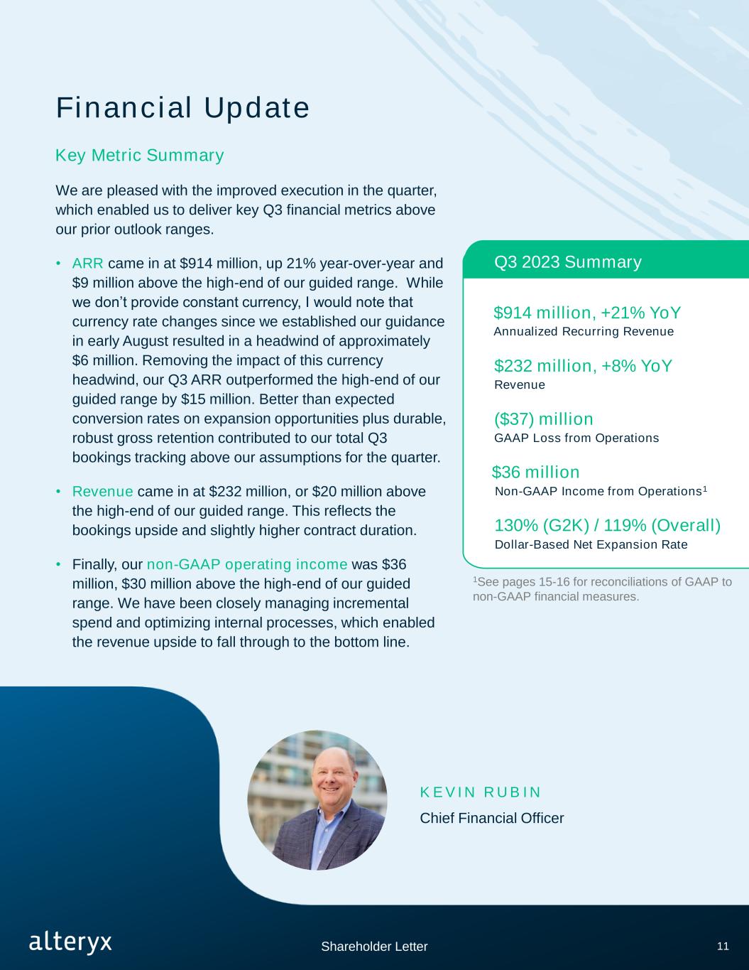Chief Executive Officer M AR K AN D E R S O N From Our CEO Q3 was a solid quarter for Alteryx across the board. Our product team made significant progress with our generative AI infused offerings that we believe will bring high value to our customers. Our business execution improved from the prior quarter, with key financial metrics above the high-end of our guided ranges. These results reflect improved sales execution despite consistent demand trends relative to Q2. Our customers continue to demonstrate a deep, growing commitment to the Alteryx platform. We believe the quest to digitize government entities and businesses around the world is intensifying as we hear our customers look for ways to improve efficiencies and drive automation and analytics across their user communities. We also believe Alteryx is uniquely positioned as the data analytics orchestration layer of an increasingly fragmented data ecosystem. Customers are leveraging our solutions to automate analytic processes to do more with less, and our easy-to-use solutions enable this with improved governance and security features. These are substantial competitive moats that have enabled us to win for years! Fellow Shareholders, 2 • Annualized recurring revenue, or ARR, came in at $914 million, up 21% year-over-year. This includes a currency headwind of approximately $6 million due to rate changes since we established the outlook. • Revenue came in at $232 million, up 8% year-over-year. • And non-GAAP operating income1 of $36 million exceeded the high-end of our guided range by $30 million, driven by both the revenue upside and disciplined cost management. I am so proud of our R&D team as they work to incorporate generative AI throughout our cloud-connected platform, reinforcing this differentiated market position to customers and prospects alike. Alteryx AiDIN, our brand of generative AI and machine learning technologies, is uniquely suited for this time and place. We recently announced several new Alteryx AiDIN capabilities – more on that shortly. Shareholder Letter 1See pages 15-16 for reconciliations of GAAP to non-GAAP financial measures.