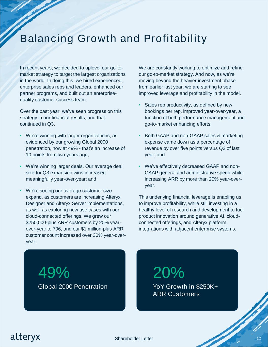 Balancing Growth and Profitability In recent years, we decided to uplevel our go-to- market strategy to target the largest organizations in the world. In doing this, we hired experienced, enterprise sales reps and leaders, enhanced our partner programs, and built out an enterprise- quality customer success team. Over the past year, we’ve seen progress on this strategy in our financial results, and that continued in Q3. • We’re winning with larger organizations, as evidenced by our growing Global 2000 penetration, now at 49% - that’s an increase of 10 points from two years ago; • We’re winning larger deals. Our average deal size for Q3 expansion wins increased meaningfully year-over-year; and • We’re seeing our average customer size expand, as customers are increasing Alteryx Designer and Alteryx Server implementations, as well as exploring new use cases with our cloud-connected offerings. We grew our $250,000-plus ARR customers by 20% year- over-year to 706, and our $1 million-plus ARR customer count increased over 30% year-over- year. We are constantly working to optimize and refine our go-to-market strategy. And now, as we’re moving beyond the heavier investment phase from earlier last year, we are starting to see improved leverage and profitability in the model. • Sales rep productivity, as defined by new bookings per rep, improved year-over-year, a function of both performance management and go-to-market enhancing efforts; • Both GAAP and non-GAAP sales & marketing expense came down as a percentage of revenue by over five points versus Q3 of last year; and • We’ve effectively decreased GAAP and non- GAAP general and administrative spend while increasing ARR by more than 20% year-over- year. This underlying financial leverage is enabling us to improve profitability, while still investing in a healthy level of research and development to fuel product innovation around generative AI, cloud- connected offerings, and Alteryx platform integrations with adjacent enterprise systems. 12 20%49% Global 2000 Penetration YoY Growth in $250K+ ARR Customers Shareholder Letter