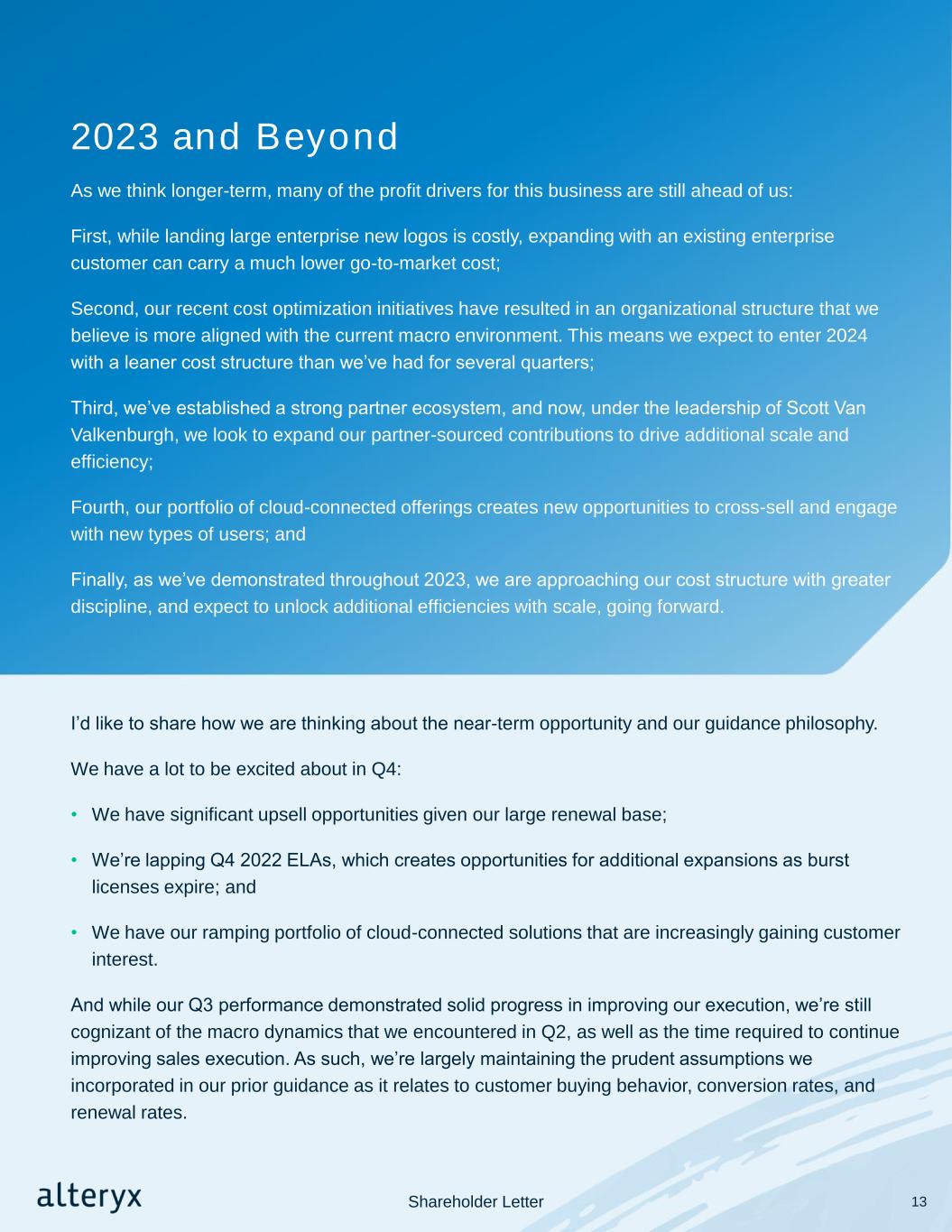 2023 and Beyond As we think longer-term, many of the profit drivers for this business are still ahead of us: First, while landing large enterprise new logos is costly, expanding with an existing enterprise customer can carry a much lower go-to-market cost; Second, our recent cost optimization initiatives have resulted in an organizational structure that we believe is more aligned with the current macro environment. This means we expect to enter 2024 with a leaner cost structure than we’ve had for several quarters; Third, we’ve established a strong partner ecosystem, and now, under the leadership of Scott Van Valkenburgh, we look to expand our partner-sourced contributions to drive additional scale and efficiency; Fourth, our portfolio of cloud-connected offerings creates new opportunities to cross-sell and engage with new types of users; and Finally, as we’ve demonstrated throughout 2023, we are approaching our cost structure with greater discipline, and expect to unlock additional efficiencies with scale, going forward. I’d like to share how we are thinking about the near-term opportunity and our guidance philosophy. We have a lot to be excited about in Q4: • We have significant upsell opportunities given our large renewal base; • We’re lapping Q4 2022 ELAs, which creates opportunities for additional expansions as burst licenses expire; and • We have our ramping portfolio of cloud-connected solutions that are increasingly gaining customer interest. And while our Q3 performance demonstrated solid progress in improving our execution, we’re still cognizant of the macro dynamics that we encountered in Q2, as well as the time required to continue improving sales execution. As such, we’re largely maintaining the prudent assumptions we incorporated in our prior guidance as it relates to customer buying behavior, conversion rates, and renewal rates. Shareholder Letter 13