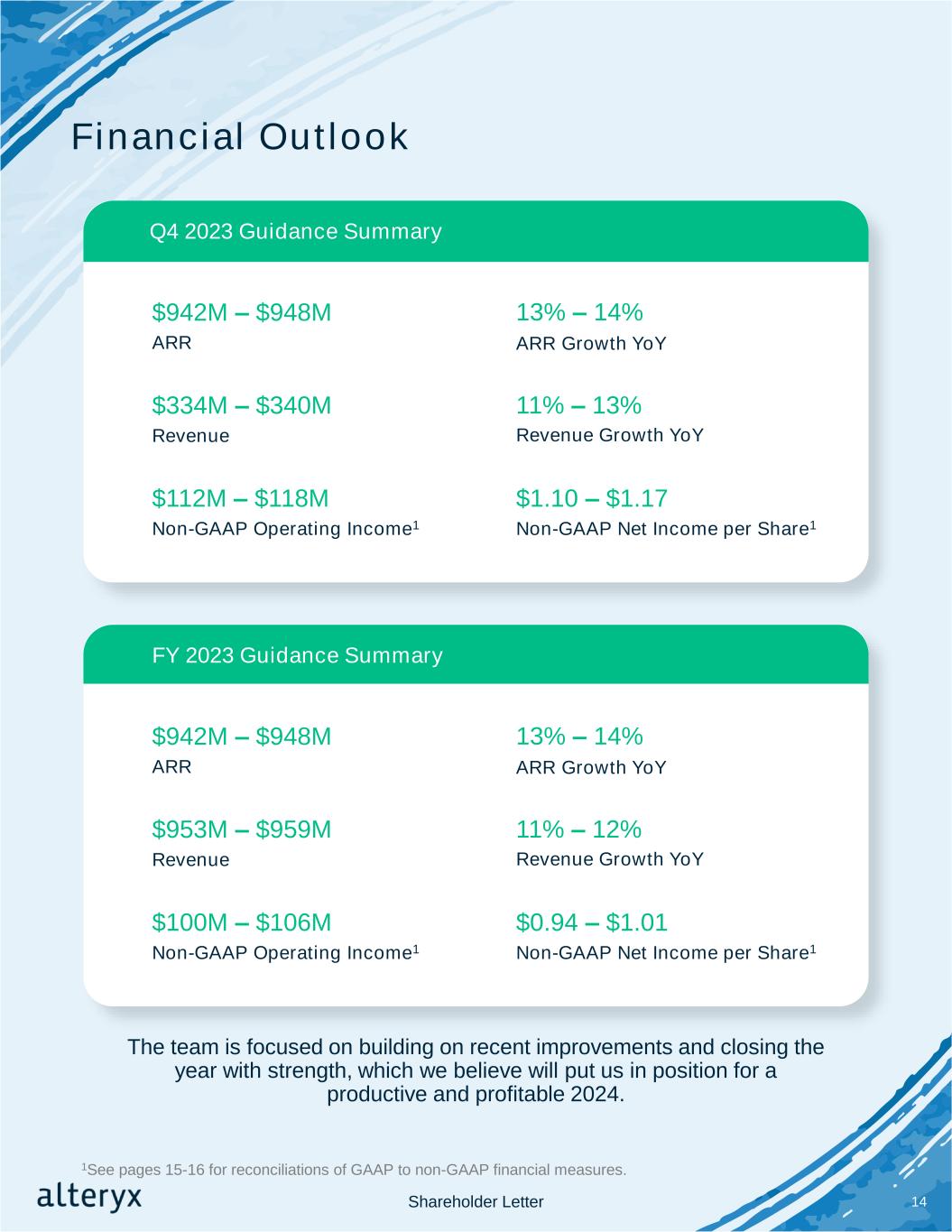 Financial Outlook 14Shareholder Letter Q4 2023 Guidance Summary $942M – $948M ARR 13% – 14% ARR Growth YoY $334M – $340M Revenue 11% – 13% Revenue Growth YoY $112M – $118M Non-GAAP Operating Income1 $1.10 – $1.17 Non-GAAP Net Income per Share1 FY 2023 Guidance Summary $942M – $948M ARR 13% – 14% ARR Growth YoY $953M – $959M Revenue 11% – 12% Revenue Growth YoY $100M – $106M Non-GAAP Operating Income1 $0.94 – $1.01 Non-GAAP Net Income per Share1 The team is focused on building on recent improvements and closing the year with strength, which we believe will put us in position for a productive and profitable 2024. 1See pages 15-16 for reconciliations of GAAP to non-GAAP financial measures.