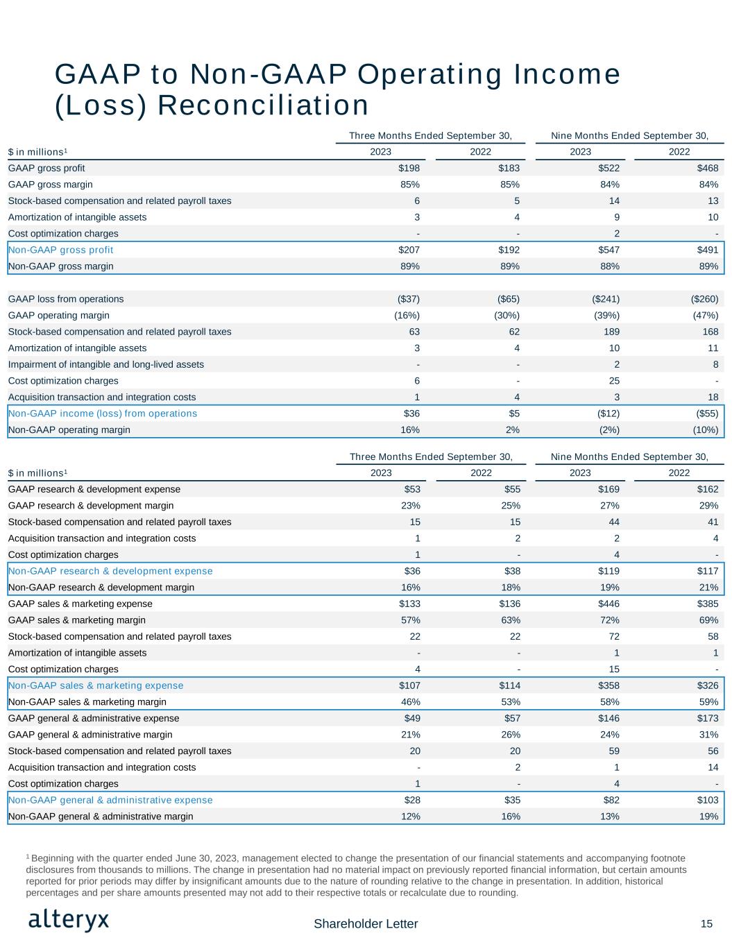 Three Months Ended September 30, Nine Months Ended September 30, $ in millions1 2023 2022 2023 2022 GAAP research & development expense $53 $55 $169 $162 GAAP research & development margin 23% 25% 27% 29% Stock-based compensation and related payroll taxes 15 15 44 41 Acquisition transaction and integration costs 1 2 2 4 Cost optimization charges 1 - 4 - Non-GAAP research & development expense $36 $38 $119 $117 Non-GAAP research & development margin 16% 18% 19% 21% GAAP sales & marketing expense $133 $136 $446 $385 GAAP sales & marketing margin 57% 63% 72% 69% Stock-based compensation and related payroll taxes 22 22 72 58 Amortization of intangible assets - - 1 1 Cost optimization charges 4 - 15 - Non-GAAP sales & marketing expense $107 $114 $358 $326 Non-GAAP sales & marketing margin 46% 53% 58% 59% GAAP general & administrative expense $49 $57 $146 $173 GAAP general & administrative margin 21% 26% 24% 31% Stock-based compensation and related payroll taxes 20 20 59 56 Acquisition transaction and integration costs - 2 1 14 Cost optimization charges 1 - 4 - Non-GAAP general & administrative expense $28 $35 $82 $103 Non-GAAP general & administrative margin 12% 16% 13% 19% Three Months Ended September 30, Nine Months Ended September 30, $ in millions1 2023 2022 2023 2022 GAAP gross profit $198 $183 $522 $468 GAAP gross margin 85% 85% 84% 84% Stock-based compensation and related payroll taxes 6 5 14 13 Amortization of intangible assets 3 4 9 10 Cost optimization charges - - 2 - Non-GAAP gross profit $207 $192 $547 $491 Non-GAAP gross margin 89% 89% 88% 89% GAAP loss from operations ($37) ($65) ($241) ($260) GAAP operating margin (16%) (30%) (39%) (47%) Stock-based compensation and related payroll taxes 63 62 189 168 Amortization of intangible assets 3 4 10 11 Impairment of intangible and long-lived assets - - 2 8 Cost optimization charges 6 - 25 - Acquisition transaction and integration costs 1 4 3 18 Non-GAAP income (loss) from operations $36 $5 ($12) ($55) Non-GAAP operating margin 16% 2% (2%) (10%) GAAP to Non-GAAP Operating Income (Loss) Reconciliation 15 1 Beginning with the quarter ended June 30, 2023, management elected to change the presentation of our financial statements and accompanying footnote disclosures from thousands to millions. The change in presentation had no material impact on previously reported financial information, but certain amounts reported for prior periods may differ by insignificant amounts due to the nature of rounding relative to the change in presentation. In addition, historical percentages and per share amounts presented may not add to their respective totals or recalculate due to rounding. Shareholder Letter