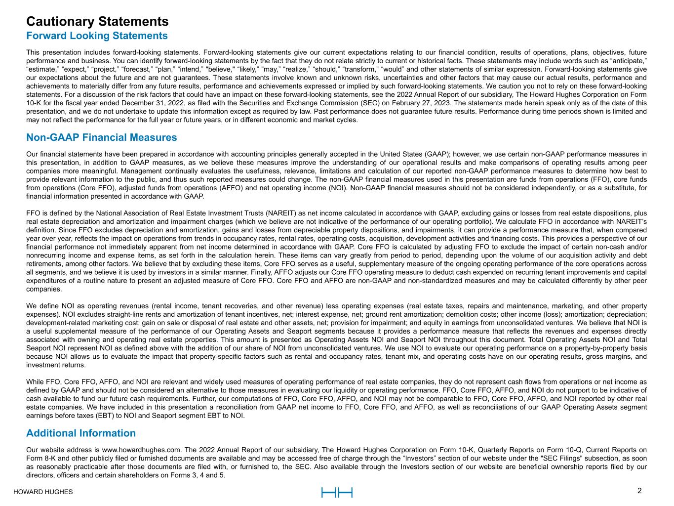 HOWARD HUGHES 2 Cautionary StatementsCautionary Statements Forward Looking Statements This presentation includes forward-looking statements. Forward-looking statements give our current expectations relating to our financial condition, results of operations, plans, objectives, future  performance and business. You can identify forward-looking statements by the fact that they do not relate strictly to current or historical facts. These statements may include words such as “anticipate,”  “estimate,” “expect,” “project,” “forecast,” “plan,” “intend,” "believe," “likely,” “may,” “realize,” “should,” “transform,” “would” and other statements of similar expression. Forward-looking statements give  our expectations about the future and are not guarantees. These statements involve known and unknown risks, uncertainties and other factors that may cause our actual results, performance and  achievements to materially differ from any future results, performance and achievements expressed or implied by such forward-looking statements. We caution you not to rely on these forward-looking  statements. For a discussion of the risk factors that could have an impact on these forward-looking statements, see the 2022 Annual Report of our subsidiary, The Howard Hughes Corporation on Form  10-K for the fiscal year ended December 31, 2022, as filed with the Securities and Exchange Commission (SEC) on February 27, 2023. The statements made herein speak only as of the date of this  presentation, and we do not undertake to update this information except as required by law. Past performance does not guarantee future results. Performance during time periods shown is limited and  may not reflect the performance for the full year or future years, or in different economic and market cycles. Non-GAAP Financial Measures Our financial statements have been prepared in accordance with accounting principles generally accepted in the United States (GAAP); however, we use certain non-GAAP performance measures in  this presentation, in addition to GAAP measures, as we believe these measures improve the understanding of our operational results and make comparisons of operating results among peer  companies more meaningful. Management continually evaluates the usefulness, relevance, limitations and calculation of our reported non-GAAP performance measures to determine how best to  provide relevant information to the public, and thus such reported measures could change. The non-GAAP financial measures used in this presentation are funds from operations (FFO), core funds  from operations (Core FFO), adjusted funds from operations (AFFO) and net operating income (NOI). Non-GAAP financial measures should not be considered independently, or as a substitute, for  financial information presented in accordance with GAAP. FFO is defined by the National Association of Real Estate Investment Trusts (NAREIT) as net income calculated in accordance with GAAP, excluding gains or losses from real estate dispositions, plus  real estate depreciation and amortization and impairment charges (which we believe are not indicative of the performance of our operating portfolio). We calculate FFO in accordance with NAREIT’s  definition. Since FFO excludes depreciation and amortization, gains and losses from depreciable property dispositions, and impairments, it can provide a performance measure that, when compared  year over year, reflects the impact on operations from trends in occupancy rates, rental rates, operating costs, acquisition, development activities and financing costs. This provides a perspective of our  financial performance not immediately apparent from net income determined in accordance with GAAP. Core FFO is calculated by adjusting FFO to exclude the impact of certain non-cash and/or  nonrecurring income and expense items, as set forth in the calculation herein. These items can vary greatly from period to period, depending upon the volume of our acquisition activity and debt  retirements, among other factors. We believe that by excluding these items, Core FFO serves as a useful, supplementary measure of the ongoing operating performance of the core operations across  all segments, and we believe it is used by investors in a similar manner. Finally, AFFO adjusts our Core FFO operating measure to deduct cash expended on recurring tenant improvements and capital  expenditures of a routine nature to present an adjusted measure of Core FFO. Core FFO and AFFO are non-GAAP and non-standardized measures and may be calculated differently by other peer  companies. We define NOI as operating revenues (rental income, tenant recoveries, and other revenue) less operating expenses (real estate taxes, repairs and maintenance, marketing, and other property  expenses). NOI excludes straight-line rents and amortization of tenant incentives, net; interest expense, net; ground rent amortization; demolition costs; other income (loss); amortization; depreciation;  development-related marketing cost; gain on sale or disposal of real estate and other assets, net; provision for impairment; and equity in earnings from unconsolidated ventures. We believe that NOI is  a useful supplemental measure of the performance of our Operating Assets and Seaport segments because it provides a performance measure that reflects the revenues and expenses directly  associated with owning and operating real estate properties. This amount is presented as Operating Assets NOI and Seaport NOI throughout this document. Total Operating Assets NOI and Total  Seaport NOI represent NOI as defined above with the addition of our share of NOI from unconsolidated ventures. We use NOI to evaluate our operating performance on a property-by-property basis  because NOI allows us to evaluate the impact that property-specific factors such as rental and occupancy rates, tenant mix, and operating costs have on our operating results, gross margins, a