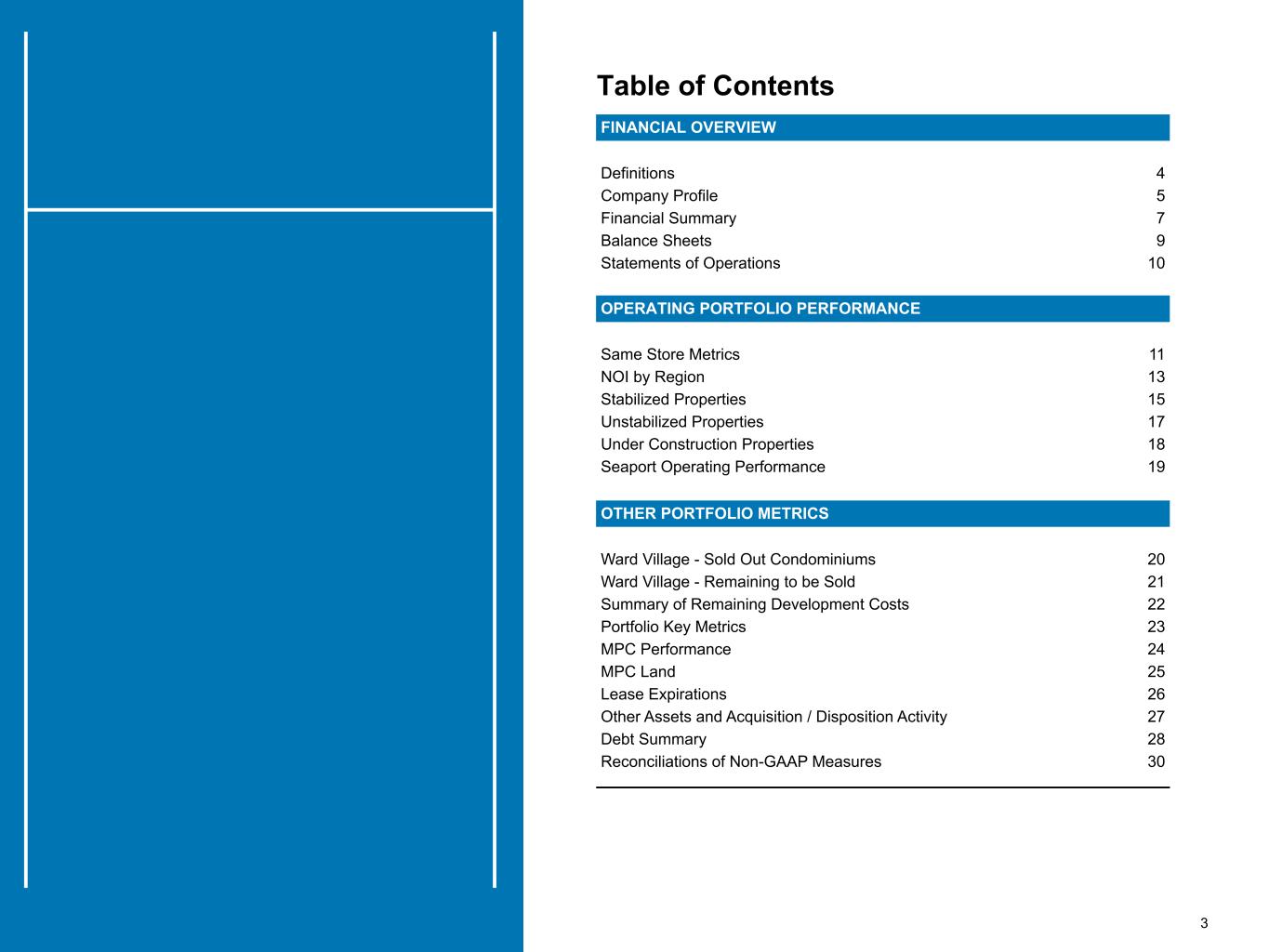 3 Table of Contents Table of Contents FINANCIAL OVERVIEW Definitions 4 Company Profile 5 Financial Summary 7 Balance Sheets 9 Statements of Operations 10 OPERATING PORTFOLIO PERFORMANCE Same Store Metrics 11 NOI by Region 13 Stabilized Properties 15 Unstabilized Properties 17 Under Construction Properties 18 Seaport Operating Performance 19 OTHER PORTFOLIO METRICS Ward Village - Sold Out Condominiums 20 Ward Village - Remaining to be Sold 21 Summary of Remaining Development Costs 22 Portfolio Key Metrics 23 MPC Performance 24 MPC Land 25 Lease Expirations 26 Other Assets and Acquisition / Disposition Activity 27 Debt Summary 28 Reconciliations of Non-GAAP Measures 30