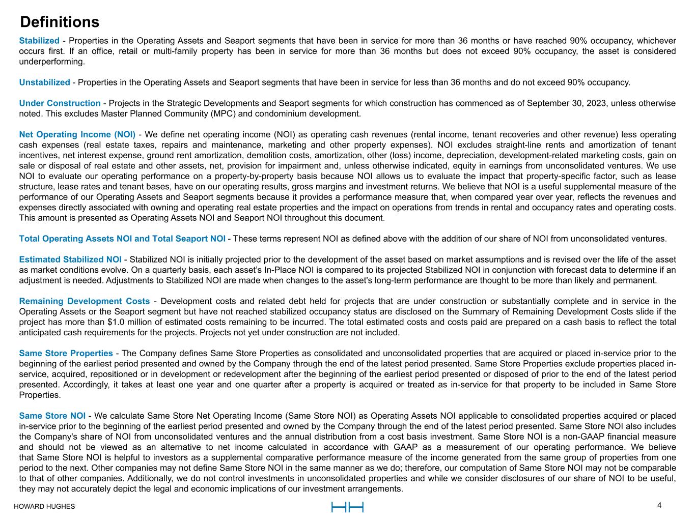 HOWARD HUGHES 4 Stabilized - Properties in the Operating Assets and Seaport segments that have been in service for more than 36 months or have reached 90% occupancy, whichever  occurs first. If an office, retail or multi-family property has been in service for more than 36 months but does not exceed 90% occupancy, the asset is considered  underperforming. Unstabilized - Properties in the Operating Assets and Seaport segments that have been in service for less than 36 months and do not exceed 90% occupancy.  Under Construction - Projects in the Strategic Developments and Seaport segments for which construction has commenced as of September 30, 2023, unless otherwise  noted. This excludes Master Planned Community (MPC) and condominium development. Net Operating Income (NOI) - We define net operating income (NOI) as operating cash revenues (rental income, tenant recoveries and other revenue) less operating  cash expenses (real estate taxes, repairs and maintenance, marketing and other property expenses). NOI excludes straight-line rents and amortization of tenant  incentives, net interest expense, ground rent amortization, demolition costs, amortization, other (loss) income, depreciation, development-related marketing costs, gain on  sale or disposal of real estate and other assets, net, provision for impairment and, unless otherwise indicated, equity in earnings from unconsolidated ventures. We use  NOI to evaluate our operating performance on a property-by-property basis because NOI allows us to evaluate the impact that property-specific factor, such as lease  structure, lease rates and tenant bases, have on our operating results, gross margins and investment returns. We believe that NOI is a useful supplemental measure of the  performance of our Operating Assets and Seaport segments because it provides a performance measure that, when compared year over year, reflects the revenues and  expenses directly associated with owning and operating real estate properties and the impact on operations from trends in rental and occupancy rates and operating costs.  This amount is presented as Operating Assets NOI and Seaport NOI throughout this document.  Total Operating Assets NOI and Total Seaport NOI - These terms represent NOI as defined above with the addition of our share of NOI from unconsolidated ventures. Estimated Stabilized NOI - Stabilized NOI is initially projected prior to the development of the asset based on market assumptions and is revised over the life of the asset  as market conditions evolve. On a quarterly basis, each asset’s In-Place NOI is compared to its projected Stabilized NOI in conjunction with forecast data to determine if an  adjustment is needed. Adjustments to Stabilized NOI are made when changes to the asset's long-term performance are thought to be more than likely and permanent. Remaining Development Costs - Development costs and related debt held for projects that are under construction or substantially complete and in service in the  Operating Assets or the Seaport segment but have not reached stabilized occupancy status are disclosed on the Summary of Remaining Development Costs slide if the  project has more than $1.0 million of estimated costs remaining to be incurred. The total estimated costs and costs paid are prepared on a cash basis to reflect the total  anticipated cash requirements for the projects. Projects not yet under construction are not included.  Same Store Properties - The Company defines Same Store Properties as consolidated and unconsolidated properties that are acquired or placed in-service prior to the  beginning of the earliest period presented and owned by the Company through the end of the latest period presented. Same Store Properties exclude properties placed in- service, acquired, repositioned or in development or redevelopment after the beginning of the earliest period presented or disposed of prior to the end of the latest period  presented. Accordingly, it takes at least one year and one quarter after a property is acquired or treated as in-service for that property to be included in Same Store  Properties. Same Store NOI - We calculate Same Store Net Operating Income (Same Store NOI) as Operating Assets NOI applicable to consolidated properties acquired or placed  in-service prior to the beginning of the earliest period presented and owned by the Company through the end of the latest period presented. Same Store NOI also includes  the Company's share of NOI from unconsolidated ventures and the annual distribution from a cost basis investment. Same Store NOI is a non-GAAP financial measure  and should not be viewed as an alternative to net income calculated in accordance with GAAP as a measurement of our operating performance. We believe  that Same Store NOI is helpful to investors as a supplemental comparative performance measure of the income generated from the same group of properties from one  period to the next. Other companies may not define Same Store NOI in the same manner as we do; therefore, our computation of Same Store NOI may not be comparable  to that of other companies. Additionally, we do not control investments in unconsolidated properties and while we consider disclosures of our share of NOI to be useful,  they may not accurately depict the legal and economic implications of our investment arrangements. DefinitionsDefinitions