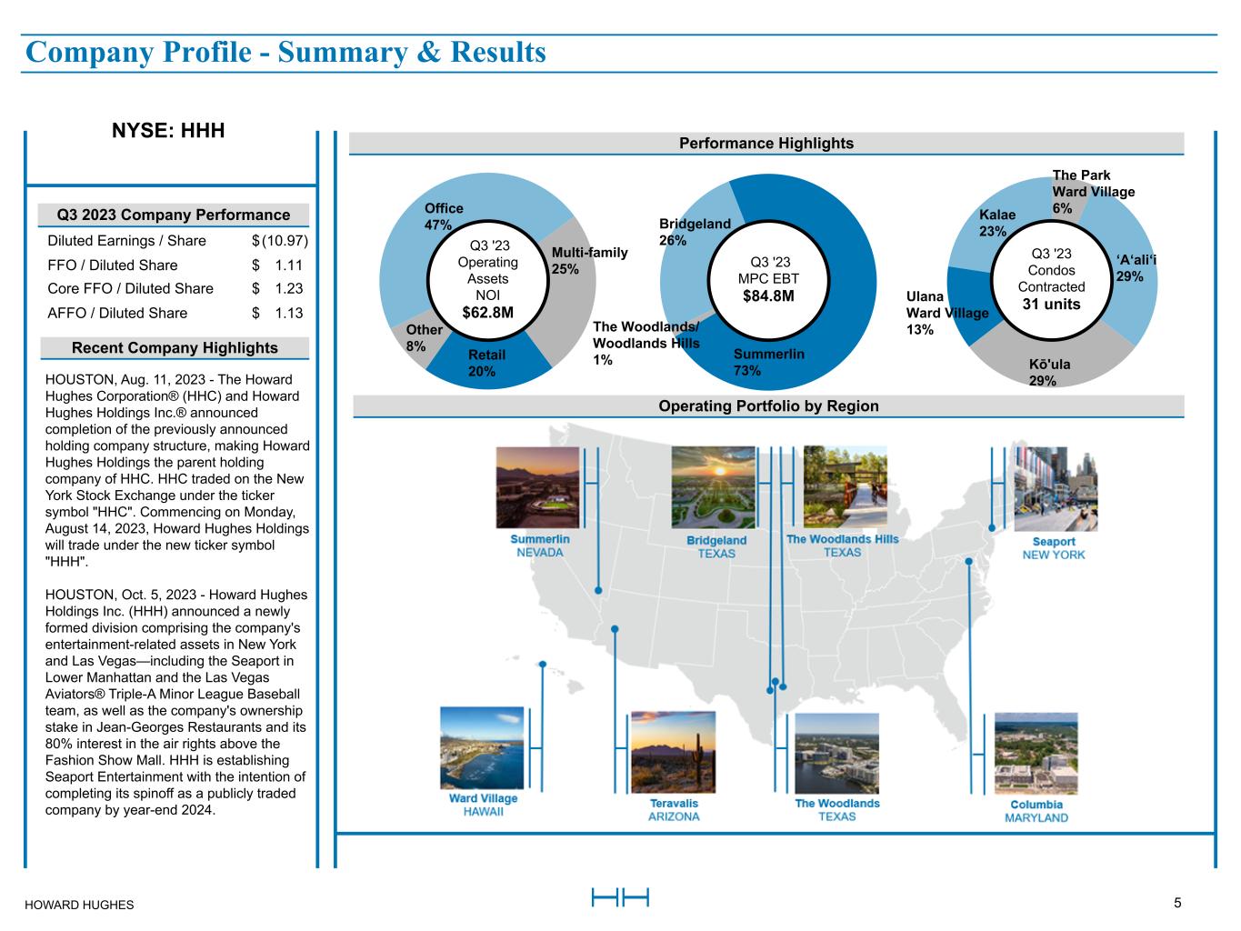 HOWARD HUGHES 5 The Park  Ward Village 6% ‘A‘ali‘i 29% Kō'ula 29% Ulana Ward Village 13% Kalae 23%Bridgeland 26% Summerlin 73% The Woodlands/ Woodlands Hills 1% Recent Company Highlights Q3 2023 Company Performance Diluted Earnings / Share $ (10.97)  FFO / Diluted Share $ 1.11  Core FFO / Diluted Share $ 1.23  AFFO / Diluted Share $ 1.13  Operating Portfolio by Region  Q3 '23 MPC EBT $84.8M  Q3 '23  Condos  Contracted 31 units NYSE: HHH Company Profile - Summary & Results HOUSTON, Aug. 11, 2023 - The Howard  Hughes Corporation® (HHC) and Howard  Hughes Holdings Inc.® announced  completion of the previously announced  holding company structure, making Howard  Hughes Holdings the parent holding  company of HHC. HHC traded on the New  York Stock Exchange under the ticker  symbol "HHC". Commencing on Monday,  August 14, 2023, Howard Hughes Holdings  will trade under the new ticker symbol  "HHH". HOUSTON, Oct. 5, 2023 - Howard Hughes  Holdings Inc. (HHH) announced a newly  formed division comprising the company's  entertainment-related assets in New York  and Las Vegas—including the Seaport in  Lower Manhattan and the Las Vegas  Aviators® Triple-A Minor League Baseball  team, as well as the company's ownership  stake in Jean-Georges Restaurants and its  80% interest in the air rights above the  Fashion Show Mall. HHH is establishing  Seaport Entertainment with the intention of  completing its spinoff as a publicly traded  company by year-end 2024.  Office 47% Multi-family 25% Retail 20% Other 8%  Q3 '23 Operating  Assets  NOI $62.8M  Performance Highlights