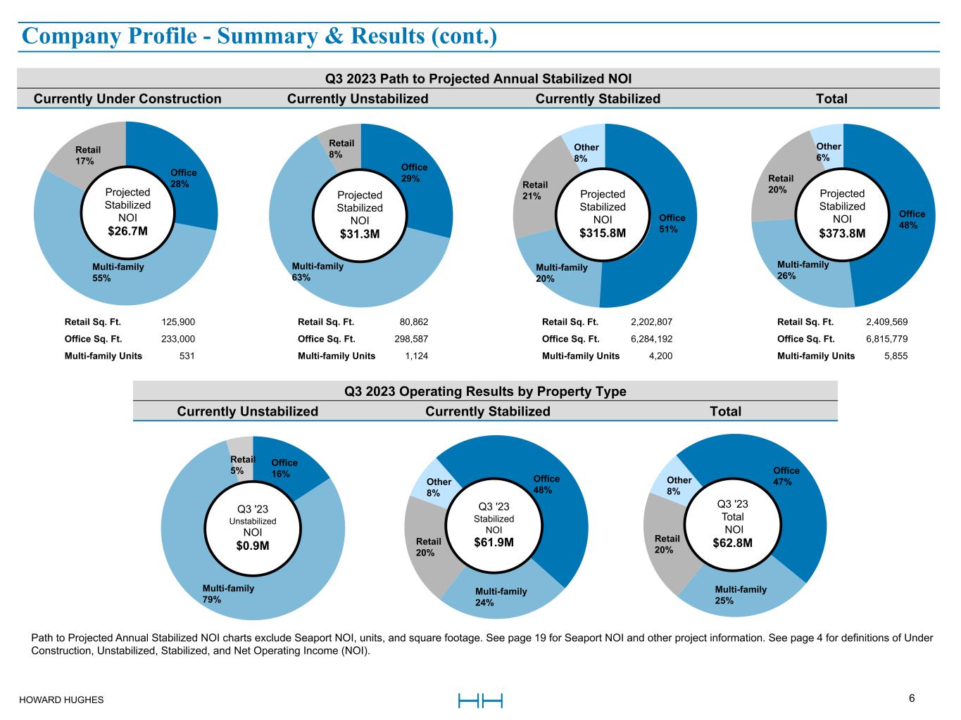 HOWARD HUGHES 6 Office 28% Multi-family 55% Retail 17% Office 16% Multi-family 79% Retail 5% Office 48% Multi-family 26% Retail 20% Other 6% Office 51% Multi-family 20% Retail 21% Other 8% Office 29% Multi-family 63% Retail 8% Q3 2023 Path to Projected Annual Stabilized NOI Currently Under Construction Currently Unstabilized Currently Stabilized Total Projected  Stabilized  NOI $31.3M Projected  Stabilized  NOI $315.8M Projected  Stabilized  NOI $373.8M  Office 48% Multi-family 24% Retail 20% Other 8% Office 47% Multi-family 25% Retail 20% Other 8% Path to Projected Annual Stabilized NOI charts exclude Seaport NOI, units, and square footage. See page 19 for Seaport NOI and other project information. See page 4 for definitions of Under  Construction, Unstabilized, Stabilized, and Net Operating Income (NOI). Q3 '23 Stabilized  NOI $61.9M Q3 '23 Unstabilized  NOI $0.9M Q3 '23  Total  NOI $62.8M Projected  Stabilized  NOI $26.7M Retail Sq. Ft.  125,900 Retail Sq. Ft.  80,862 Retail Sq. Ft.  2,202,807 Retail Sq. Ft.  2,409,569  Office Sq. Ft.  233,000 Office Sq. Ft.  298,587 Office Sq. Ft.  6,284,192 Office Sq. Ft.  6,815,779  Multi-family Units  531 Multi-family Units  1,124 Multi-family Units  4,200 Multi-family Units  5,855  Q3 2023 Operating Results by Property Type Currently Unstabilized Currently Stabilized Total Company Profile - Summary & Results (cont.)