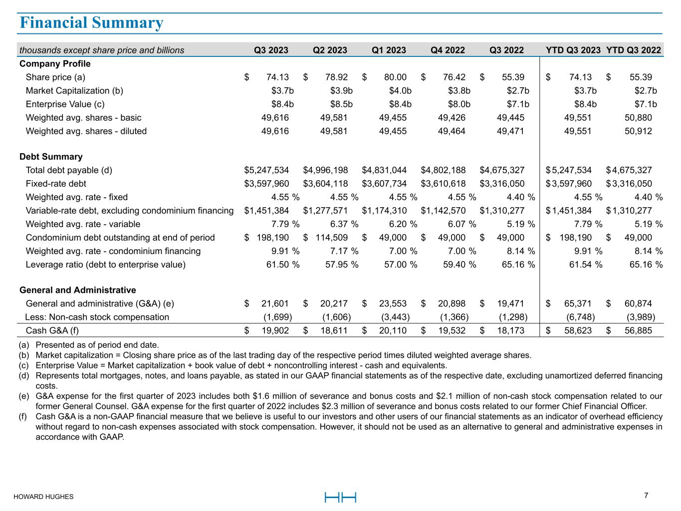HOWARD HUGHES 7 thousands except share price and billions Q3 2023 Q2 2023 Q1 2023 Q4 2022 Q3 2022 YTD Q3 2023 YTD Q3 2022 Company Profile Share price (a) $ 74.13 $ 78.92 $ 80.00 $ 76.42 $ 55.39 $ 74.13 $ 55.39  Market Capitalization (b)  $3.7b  $3.9b  $4.0b  $3.8b  $2.7b  $3.7b  $2.7b  Enterprise Value (c)  $8.4b  $8.5b  $8.4b  $8.0b  $7.1b  $8.4b  $7.1b  Weighted avg. shares - basic  49,616  49,581  49,455  49,426  49,445  49,551  50,880  Weighted avg. shares - diluted  49,616  49,581  49,455  49,464  49,471  49,551  50,912  Debt Summary Total debt payable (d) $ 5,247,534 $ 4,996,198 $ 4,831,044 $ 4,802,188 $ 4,675,327 $ 5,247,534 $ 4,675,327  Fixed-rate debt $ 3,597,960 $ 3,604,118 $ 3,607,734 $ 3,610,618 $ 3,316,050 $ 3,597,960 $ 3,316,050  Weighted avg. rate - fixed  4.55 %  4.55 %  4.55 %  4.55 %  4.40 %  4.55 %  4.40 % Variable-rate debt, excluding condominium financing $ 1,451,384 $ 1,277,571 $ 1,174,310 $ 1,142,570 $ 1,310,277 $ 1,451,384 $ 1,310,277  Weighted avg. rate - variable  7.79 %  6.37 %  6.20 %  6.07 %  5.19 %  7.79 %  5.19 % Condominium debt outstanding at end of period $ 198,190 $ 114,509 $ 49,000 $ 49,000 $ 49,000 $ 198,190 $ 49,000  Weighted avg. rate - condominium financing  9.91 %  7.17 %  7.00 %  7.00 %  8.14 %  9.91 %  8.14 % Leverage ratio (debt to enterprise value)  61.50 %  57.95 %  57.00 %  59.40 %  65.16 %  61.54 %  65.16 % General and Administrative General and administrative (G&A) (e) $ 21,601 $ 20,217 $ 23,553 $ 20,898 $ 19,471 $ 65,371 $ 60,874  Less: Non-cash stock compensation  (1,699)  (1,606)  (3,443)  (1,366)  (1,298)  (6,748)  (3,989)  Cash G&A (f) $ 19,902 $ 18,611 $ 20,110 $ 19,532 $ 18,173 $ 58,623 $ 56,885  Financial Summary (a) Presented as of period end date. (b) Market capitalization = Closing share price as of the last trading day of the respective period times diluted weighted average shares. (c) Enterprise Value = Market capitalization + book value of debt + noncontrolling interest - cash and equivalents. (d) Represents total mortgages, notes, and loans payable, as stated in our GAAP financial statements as of the respective date, excluding unamortized deferred financing  costs. (e) G&A expense for the first quarter of 2023 includes both $1.6 million of severance and bonus costs and $2.1 million of non-cash stock compensation related to our  former General Counsel. G&A expense for the first quarter of 2022 includes $2.3 million of severance and bonus costs related to our former Chief Financial Officer. (f) Cash G&A is a non-GAAP financial measure that we believe is useful to our investors and other users of our financial statements as an indicator of overhead efficiency  without regard to non-cash expenses associated with stock compensation. However, it should not be used as an alternative to general and administrative expenses in  accordance with GAAP. Financial Summary
