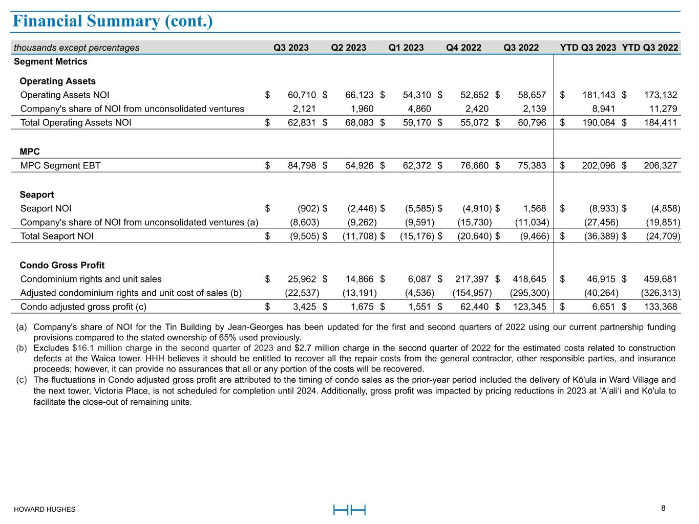 HOWARD HUGHES 8 Financial Summary (a) Company's share of NOI for the Tin Building by Jean-Georges has been updated for the first and second quarters of 2022 using our current partnership funding  provisions compared to the stated ownership of 65% used previously. (b) Excludes $16.1 million charge in the second quarter of 2023 and $2.7 million charge in the second quarter of 2022 for the estimated costs related to construction  defects at the Waiea tower. HHH believes it should be entitled to recover all the repair costs from the general contractor, other responsible parties, and insurance  proceeds; however, it can provide no assurances that all or any portion of the costs will be recovered. (c) The fluctuations in Condo adjusted gross profit are attributed to the timing of condo sales as the prior-year period included the delivery of Kō'ula in Ward Village and  the next tower, Victoria Place, is not scheduled for completion until 2024. Additionally, gross profit was impacted by pricing reductions in 2023 at ‘A‘ali‘i and Kō'ula to  facilitate the close-out of remaining units. thousands except percentages Q3 2023 Q2 2023 Q1 2023 Q4 2022 Q3 2022 YTD Q3 2023 YTD Q3 2022 Segment Metrics Operating Assets Operating Assets NOI $ 60,710 $ 66,123 $ 54,310 $ 52,652 $ 58,657 $ 181,143 $ 173,132  Company's share of NOI from unconsolidated ventures  2,121  1,960  4,860  2,420  2,139  8,941  11,279  Total Operating Assets NOI $ 62,831 $ 68,083 $ 59,170 $ 55,072 $ 60,796 $ 190,084 $ 184,411  MPC MPC Segment EBT $ 84,798 $ 54,926 $ 62,372 $ 76,660 $ 75,383 $ 202,096 $ 206,327  Seaport Seaport NOI $ (902) $ (2,446) $ (5,585) $ (4,910) $ 1,568 $ (8,933) $ (4,858)  Company's share of NOI from unconsolidated ventures (a)  (8,603)  (9,262)  (9,591)  (15,730)  (11,034)  (27,456)  (19,851)  Total Seaport NOI $ (9,505) $ (11,708) $ (15,176) $ (20,640) $ (9,466) $ (36,389) $ (24,709)  Condo Gross Profit Condominium rights and unit sales $ 25,962 $ 14,866 $ 6,087 $ 217,397 $ 418,645 $ 46,915 $ 459,681  Adjusted condominium rights and unit cost of sales (b)  (22,537)  (13,191)  (4,536)  (154,957)  (295,300)  (40,264)  (326,313)  Condo adjusted gross profit (c) $ 3,425 $ 1,675 $ 1,551 $ 62,440 $ 123,345 $ 6,651 $ 133,368  Financial Summary (cont.)