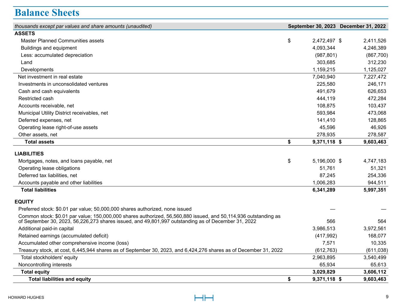HOWARD HUGHES 9 thousands except par values and share amounts (unaudited) September 30, 2023 December 31, 2022 ASSETS Master Planned Communities assets $ 2,472,497 $ 2,411,526  Buildings and equipment  4,093,344  4,246,389  Less: accumulated depreciation  (987,801)  (867,700)  Land  303,685  312,230  Developments  1,159,215  1,125,027  Net investment in real estate  7,040,940  7,227,472  Investments in unconsolidated ventures  225,580  246,171  Cash and cash equivalents  491,679  626,653  Restricted cash  444,119  472,284  Accounts receivable, net  108,875  103,437  Municipal Utility District receivables, net  593,984  473,068  Deferred expenses, net  141,410  128,865  Operating lease right-of-use assets  45,596  46,926  Other assets, net  278,935  278,587  Total assets $ 9,371,118 $ 9,603,463  LIABILITIES Mortgages, notes, and loans payable, net $ 5,196,000 $ 4,747,183  Operating lease obligations  51,761  51,321  Deferred tax liabilities, net  87,245  254,336  Accounts payable and other liabilities  1,006,283  944,511  Total liabilities  6,341,289  5,997,351  EQUITY Preferred stock: $0.01 par value; 50,000,000 shares authorized, none issued  —  —  Common stock: $0.01 par value; 150,000,000 shares authorized, 56,560,880 issued, and 50,114,936 outstanding as  of September 30, 2023, 56,226,273 shares issued, and 49,801,997 outstanding as of December 31, 2022  566  564  Additional paid-in capital  3,986,513  3,972,561  Retained earnings (accumulated deficit)  (417,992)  168,077  Accumulated other comprehensive income (loss)  7,571  10,335  Treasury stock, at cost, 6,445,944 shares as of September 30, 2023, and 6,424,276 shares as of December 31, 2022  (612,763)  (611,038)  Total stockholders' equity  2,963,895  3,540,499  Noncontrolling interests  65,934  65,613  Total equity  3,029,829  3,606,112  Total liabilities and equity $ 9,371,118 $ 9,603,463  Balance Sheets