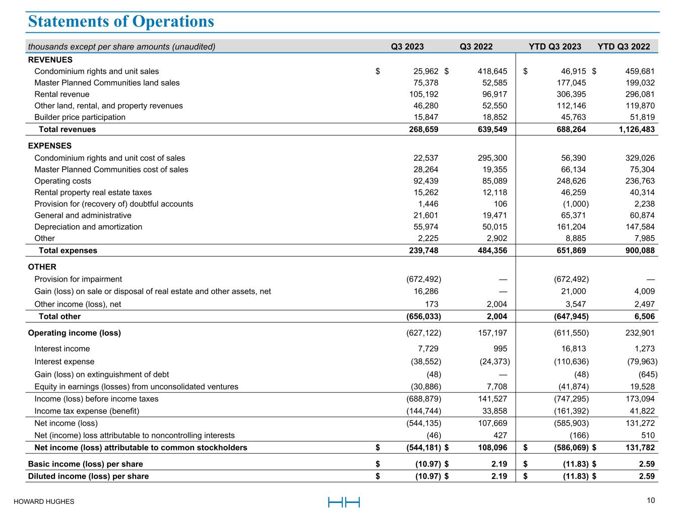 HOWARD HUGHES 10 thousands except per share amounts (unaudited) Q3 2023 Q3 2022 YTD Q3 2023 YTD Q3 2022 REVENUES Condominium rights and unit sales $ 25,962 $ 418,645 $ 46,915 $ 459,681  Master Planned Communities land sales  75,378  52,585  177,045  199,032  Rental revenue  105,192  96,917  306,395  296,081  Other land, rental, and property revenues  46,280  52,550  112,146  119,870  Builder price participation  15,847  18,852  45,763  51,819  Total revenues  268,659  639,549  688,264  1,126,483  EXPENSES Condominium rights and unit cost of sales  22,537  295,300  56,390  329,026  Master Planned Communities cost of sales  28,264  19,355  66,134  75,304  Operating costs  92,439  85,089  248,626  236,763  Rental property real estate taxes  15,262  12,118  46,259  40,314  Provision for (recovery of) doubtful accounts  1,446  106  (1,000)  2,238  General and administrative  21,601  19,471  65,371  60,874  Depreciation and amortization  55,974  50,015  161,204  147,584  Other  2,225  2,902  8,885  7,985  Total expenses  239,748  484,356  651,869  900,088  OTHER Provision for impairment  (672,492)  —  (672,492)  —  Gain (loss) on sale or disposal of real estate and other assets, net  16,286  —  21,000  4,009  Other income (loss), net  173  2,004  3,547  2,497  Total other  (656,033)  2,004  (647,945)  6,506  Operating income (loss)  (627,122)  157,197  (611,550)  232,901  Interest income  7,729  995  16,813  1,273  Interest expense  (38,552)  (24,373)  (110,636)  (79,963)  Gain (loss) on extinguishment of debt  (48)  —  (48)  (645)  Equity in earnings (losses) from unconsolidated ventures  (30,886)  7,708  (41,874)  19,528  Income (loss) before income taxes  (688,879)  141,527  (747,295)  173,094  Income tax expense (benefit)  (144,744)  33,858  (161,392)  41,822  Net income (loss)  (544,135)  107,669  (585,903)  131,272  Net (income) loss attributable to noncontrolling interests  (46)  427  (166)  510  Net income (loss) attributable to common stockholders $ (544,181) $ 108,096 $ (586,069) $ 131,782  Basic income (loss) per share $ (10.97) $ 2.19 $ (11.83) $ 2.59  Diluted income (loss) per share $ (10.97) $ 2.19 $ (11.83) $ 2.59  Statements of Operations