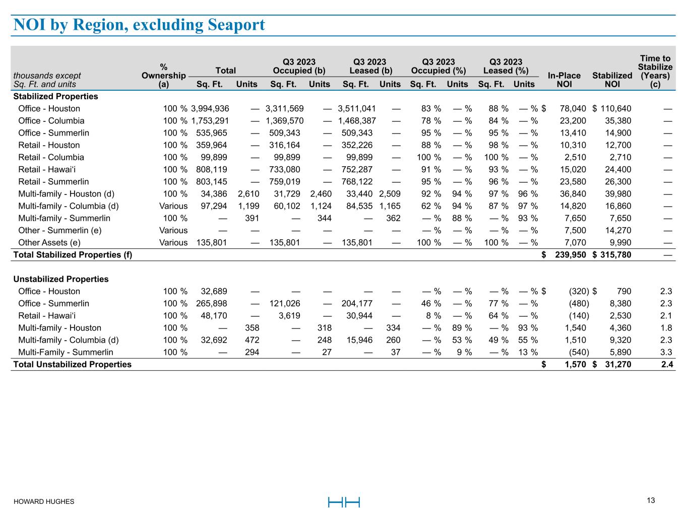 HOWARD HUGHES 13 thousands except  Sq. Ft. and units %  Ownership  (a) Total Q3 2023  Occupied (b) Q3 2023  Leased (b) Q3 2023  Occupied (%) Q3 2023  Leased (%) In-Place  NOI Stabilized  NOI  Time to  Stabilize  (Years)  (c)Sq. Ft. Units Sq. Ft. Units Sq. Ft. Units Sq. Ft. Units Sq. Ft. Units Stabilized Properties Office - Houston  100 %  3,994,936  —  3,311,569  —  3,511,041  —  83 %  — %  88 %  — % $ 78,040 $ 110,640  —  Office - Columbia  100 %  1,753,291  —  1,369,570  —  1,468,387  —  78 %  — %  84 %  — %  23,200  35,380  —  Office - Summerlin  100 %  535,965  —  509,343  —  509,343  —  95 %  — %  95 %  — %  13,410  14,900  —  Retail - Houston  100 %  359,964  —  316,164  —  352,226  —  88 %  — %  98 %  — %  10,310  12,700  —  Retail - Columbia  100 %  99,899  —  99,899  —  99,899  —  100 %  — %  100 %  — %  2,510  2,710  —  Retail - Hawai‘i  100 %  808,119  —  733,080  —  752,287  —  91 %  — %  93 %  — %  15,020  24,400  —  Retail - Summerlin  100 %  803,145  —  759,019  —  768,122  —  95 %  — %  96 %  — %  23,580  26,300  —  Multi-family - Houston (d)  100 %  34,386  2,610  31,729  2,460  33,440  2,509  92 %  94 %  97 %  96 %  36,840  39,980  —  Multi-family - Columbia (d) Various  97,294  1,199  60,102  1,124  84,535  1,165  62 %  94 %  87 %  97 %  14,820  16,860  —  Multi-family - Summerlin  100 %  —  391  —  344  —  362  — %  88 %  — %  93 %  7,650  7,650  —  Other - Summerlin (e) Various  —  —  —  —  —  —  — %  — %  — %  — %  7,500  14,270  —  Other Assets (e) Various  135,801  —  135,801  —  135,801  —  100 %  — %  100 %  — %  7,070  9,990  —  Total Stabilized Properties (f) $ 239,950 $ 315,780  —  Unstabilized Properties Office - Houston  100 %  32,689  —  —  —  —  —  — %  — %  — %  — % $ (320) $ 790  2.3  Office - Summerlin  100 %  265,898  —  121,026  —  204,177  —  46 %  — %  77 %  — %  (480)  8,380  2.3  Retail - Hawai‘i  100 %  48,170  —  3,619  —  30,944  —  8 %  — %  64 %  — %  (140)  2,530  2.1  Multi-family - Houston  100 %  —  358  —  318  —  334  — %  89 %  — %  93 %  1,540  4,360  1.8  Multi-family - Columbia (d)  100 %  32,692  472  —  248  15,946  260  — %  53 %  49 %  55 %  1,510  9,320  2.3  Multi-Family - Summerlin  100 %  —  294  —  27  —  37  — %  9 %  — %  13 %  (540)  5,890  3.3  Total Unstabilized Properties $ 1,570 $ 31,270 2.4 NOI by Region, excluding Seaport