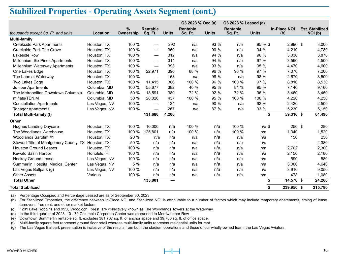 HOWARD HUGHES 16 Q3 2023 % Occ.(a) Q3 2023 % Leased (a) thousands except Sq. Ft. and units Location %  Ownership Rentable  Sq. Ft. Units Rentable  Sq. Ft. Units Rentable  Sq. Ft. Units In-Place NOI  (b) Est. Stabilized  NOI (b) Multi-family Creekside Park Apartments Houston, TX  100 %  — 292 n/a  93 % n/a  95 % $ 2,990 $ 3,000  Creekside Park The Grove Houston, TX  100 %  —  360 n/a  90 % n/a  94 %  4,210  4,780  Lakeside Row Houston, TX  100 %  —  312 n/a  94 % n/a  96 %  3,030  3,870  Millennium Six Pines Apartments Houston, TX  100 %  —  314 n/a  94 % n/a  97 %  3,590  4,500  Millennium Waterway Apartments Houston, TX  100 %  —  393 n/a  93 % n/a  95 %  4,470  4,600  One Lakes Edge Houston, TX  100 %  22,971  390  88 %  96 %  96 %  97 %  7,070  7,200  The Lane at Waterway Houston, TX  100 %  —  163 n/a  98 % n/a  98 %  2,670  3,500  Two Lakes Edge Houston, TX  100 %  11,415  386  100 %  96 %  100 %  97 %  8,810  8,530  Juniper Apartments Columbia, MD  100 %  55,677  382  40 %  95 %  84 %  95 %  7,140  9,160  The Metropolitan Downtown Columbia Columbia, MD  50 %  13,591  380  72 %  92 %  72 %  96 %  3,460  3,450  m.flats/TEN.M Columbia, MD  50 %  28,026  437  100 %  95 %  100 %  100 %  4,220  4,250  Constellation Apartments Las Vegas, NV  100 %  —  124 n/a  90 % n/a  92 %  2,420  2,500  Tanager Apartments Las Vegas, NV  100 %  —  267 n/a  87 % n/a  93 %  5,230  5,150  Total Multi-family (f)  131,680  4,200 $ 59,310 $ 64,490  Other Hughes Landing Daycare Houston, TX  100 %  10,000 n/a  100 % n/a  100 % n/a $ 250 $ 280  The Woodlands Warehouse Houston, TX  100 %  125,801 n/a  100 % n/a  100 % n/a  1,340  1,520  Woodlands Sarofim #1 Houston, TX  20 % n/a n/a n/a n/a n/a n/a  150  250  Stewart Title of Montgomery County, TX Houston, TX  50 % n/a n/a n/a n/a n/a n/a  —  2,380  Houston Ground Leases Houston, TX  100 % n/a n/a n/a n/a n/a n/a  2,702  2,300  Kewalo Basin Harbor Honolulu, HI  100 % n/a n/a n/a n/a n/a n/a  2,150  2,180  Hockey Ground Lease Las Vegas, NV  100 % n/a n/a n/a n/a n/a n/a  590  580  Summerlin Hospital Medical Center Las Vegas, NV  5 % n/a n/a n/a n/a n/a n/a  3,000  4,640  Las Vegas Ballpark (g) Las Vegas, NV  100 % n/a n/a n/a n/a n/a n/a  3,910  9,050  Other Assets Various  100 % n/a n/a n/a n/a n/a n/a  478  1,080  Total Other  135,801  — $ 14,570 $ 24,260  Total Stabilized $ 239,950 $ 315,780  (a) Percentage Occupied and Percentage Leased are as of September 30, 2023. (b) For Stabilized Properties, the difference between In-Place NOI and Stabilized NOI is attributable to a number of factors which may include temporary abatements, timing of lease  turnovers, free rent, and other market factors.  (c) 1201 Lake Robbins and 9950 Woodloch Forest, are collectively known as The Woodlands Towers at the Waterway. (d) In the third quarter of 2023, 10 - 70 Columbia Corporate Center was rebranded to Merriweather Row.  (e) Downtown Summerlin rentable sq. ft. excludes 381,767 sq. ft. of anchor space and 39,700 sq. ft. of office space.  (f) Multi-family square feet represent ground floor retail whereas multi-family units represent residential units for rent.  (g) The Las Vegas Ballpark presentation is inclusive of the results from both the stadium operations and those of our wholly owned team, the Las Vegas Aviators. Stabilized Properties - Operating Assets Segment (cont.)
