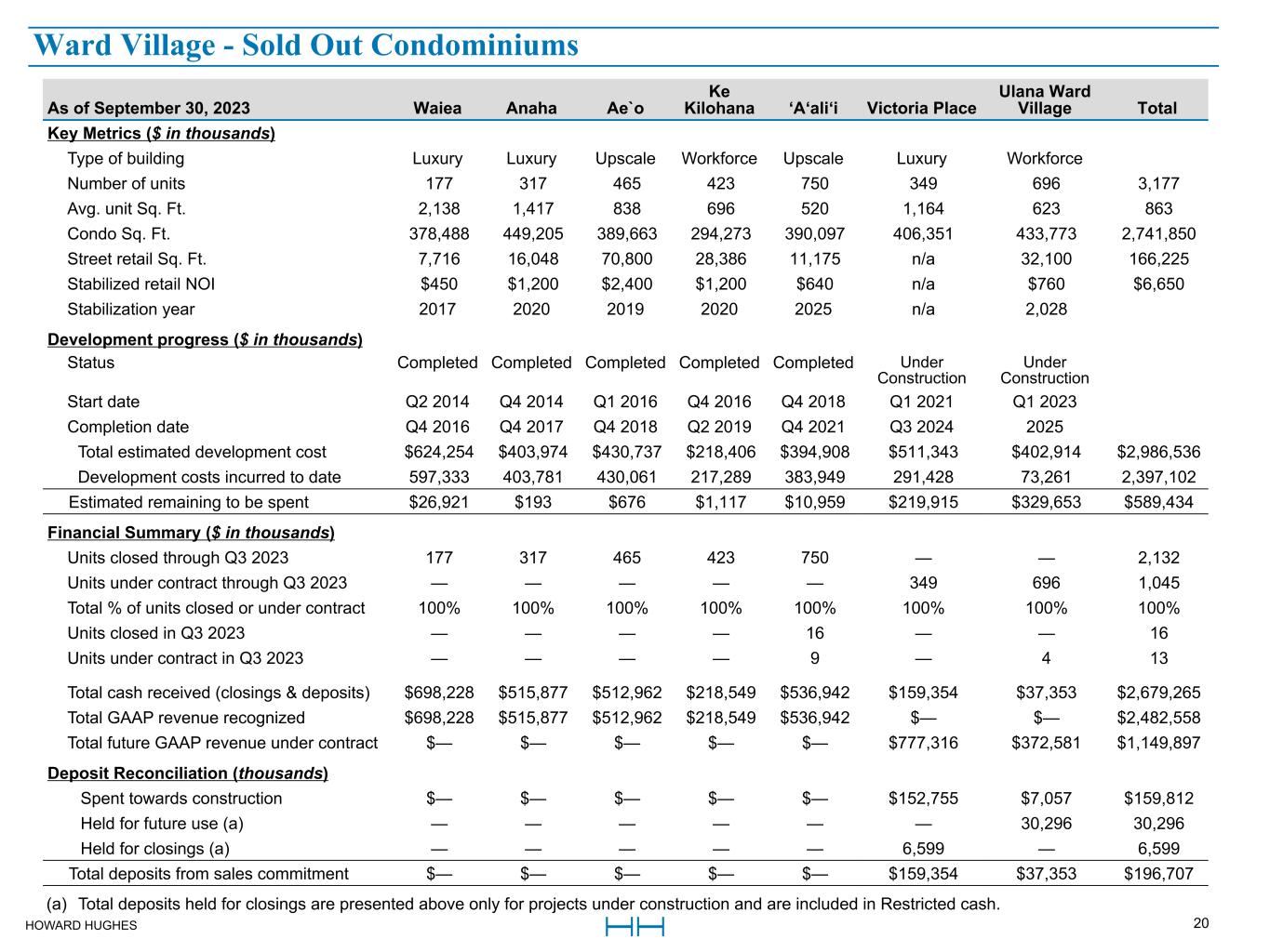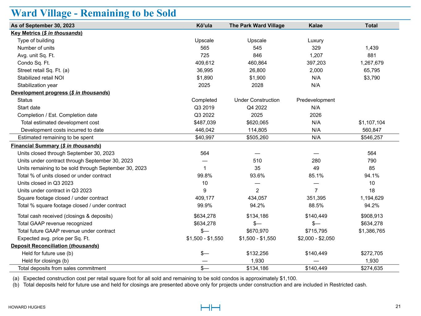 HOWARD HUGHES 20 As of September 30, 2023 Waiea Anaha Ae`o Ke  Kilohana ‘A‘ali‘i Victoria Place Ulana Ward  Village Total Key Metrics ($ in thousands) Type of building Luxury Luxury Upscale Workforce Upscale Luxury Workforce Number of units 177 317 465 423 750 349 696 3,177 Avg. unit Sq. Ft. 2,138 1,417 838 696 520 1,164 623 863 Condo Sq. Ft. 378,488 449,205 389,663 294,273 390,097 406,351 433,773 2,741,850 Street retail Sq. Ft. 7,716 16,048 70,800 28,386 11,175 n/a 32,100 166,225 Stabilized retail NOI $450 $1,200 $2,400 $1,200 $640 n/a $760 $6,650 Stabilization year 2017 2020 2019 2020 2025 n/a 2,028 Development progress ($ in thousands) Status Completed Completed Completed Completed Completed Under  Construction Under  Construction Start date Q2 2014 Q4 2014 Q1 2016 Q4 2016 Q4 2018 Q1 2021 Q1 2023 Completion date Q4 2016 Q4 2017 Q4 2018 Q2 2019 Q4 2021 Q3 2024 2025 Total estimated development cost $624,254 $403,974 $430,737 $218,406 $394,908 $511,343 $402,914 $2,986,536 Development costs incurred to date 597,333 403,781 430,061 217,289 383,949 291,428 73,261 2,397,102 Estimated remaining to be spent $26,921 $193 $676 $1,117 $10,959 $219,915 $329,653 $589,434 Financial Summary ($ in thousands) Units closed through Q3 2023 177 317 465 423 750 — — 2,132 Units under contract through Q3 2023 — — — — — 349 696 1,045 Total % of units closed or under contract 100% 100% 100% 100% 100% 100% 100% 100% Units closed in Q3 2023 — — — — 16 — — 16 Units under contract in Q3 2023 — — — — 9 — 4 13 Total cash received (closings & deposits) $698,228 $515,877 $512,962 $218,549 $536,942 $159,354 $37,353 $2,679,265 Total GAAP revenue recognized $698,228 $515,877 $512,962 $218,549 $536,942 $— $— $2,482,558 Total future GAAP revenue under contract $— $— $— $— $— $777,316 $372,581 $1,149,897 Deposit Reconciliation (thousands) Spent towards construction $— $— $— $— $— $152,755 $7,057 $159,812 Held for future use (a) — — — — — — 30,296 30,296 Held for closings (a) — — — — — 6,599 — 6,599 Total deposits from sales commitment $— $— $— $— $— $159,354 $37,353 $196,707 (a) Total deposits held for closings are presented above only for projects under construction and are included in Restricted cash. Ward Village - Sold Out Condominiums