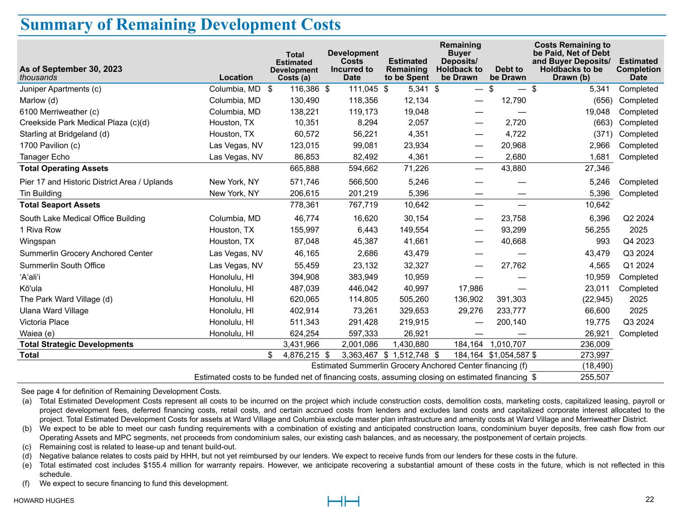 HOWARD HUGHES 22 As of September 30, 2023 thousands Location  Total  Estimated  Development  Costs (a)   Development  Costs  Incurred to  Date  Estimated  Remaining  to be Spent   Remaining  Buyer  Deposits/ Holdback to  be Drawn   Debt to  be Drawn  Costs Remaining to  be Paid, Net of Debt  and Buyer Deposits/ Holdbacks to be  Drawn (b)  Estimated  Completion  Date Juniper Apartments (c) Columbia, MD $ 116,386 $ 111,045 $ 5,341 $ — $ — $ 5,341 Completed Marlow (d) Columbia, MD  130,490  118,356  12,134  —  12,790  (656) Completed 6100 Merriweather (c) Columbia, MD  138,221  119,173  19,048  —  —  19,048 Completed Creekside Park Medical Plaza (c)(d) Houston, TX  10,351  8,294  2,057  —  2,720  (663) Completed Starling at Bridgeland (d) Houston, TX  60,572  56,221  4,351  —  4,722  (371) Completed 1700 Pavilion (c) Las Vegas, NV  123,015  99,081  23,934  —  20,968  2,966 Completed Tanager Echo Las Vegas, NV  86,853  82,492  4,361  —  2,680  1,681 Completed Total Operating Assets  665,888  594,662  71,226  —  43,880  27,346  Pier 17 and Historic District Area / Uplands New York, NY  571,746  566,500  5,246  —  —  5,246 Completed Tin Building New York, NY  206,615  201,219  5,396  —  —  5,396 Completed Total Seaport Assets  778,361  767,719  10,642  —  —  10,642  South Lake Medical Office Building Columbia, MD  46,774  16,620  30,154  —  23,758  6,396 Q2 2024 1 Riva Row Houston, TX  155,997  6,443  149,554  —  93,299  56,255 2025 Wingspan Houston, TX  87,048  45,387  41,661  —  40,668  993 Q4 2023 Summerlin Grocery Anchored Center Las Vegas, NV  46,165  2,686  43,479  —  —  43,479 Q3 2024 Summerlin South Office Las Vegas, NV  55,459  23,132  32,327  —  27,762  4,565 Q1 2024 ‘A‘ali‘i Honolulu, HI  394,908  383,949  10,959  —  —  10,959 Completed Kō'ula Honolulu, HI  487,039  446,042  40,997  17,986  —  23,011 Completed The Park Ward Village (d) Honolulu, HI  620,065  114,805  505,260  136,902  391,303  (22,945) 2025 Ulana Ward Village Honolulu, HI  402,914  73,261  329,653  29,276  233,777  66,600 2025 Victoria Place Honolulu, HI  511,343  291,428  219,915  —  200,140  19,775 Q3 2024 Waiea (e) Honolulu, HI  624,254  597,333  26,921  —  —  26,921 Completed Total Strategic Developments  3,431,966  2,001,086  1,430,880  184,164  1,010,707  236,009  Total $ 4,876,215 $ 3,363,467 $ 1,512,748 $ 184,164 $ 1,054,587 $ 273,997  Estimated Summerlin Grocery Anchored Center financing (f)  (18,490)  Estimated costs to be funded net of financing costs, assuming closing on estimated financing $ 255,507         See page 4 for definition of Remaining Development Costs.  (a) Total Estimated Development Costs represent all costs to be incurred on the project which include construction costs, demolition costs, marketing costs, capitalized leasing, payroll or  project development fees, deferred financing costs, retail costs, and certain accrued costs from lenders and excludes land costs and capitalized corporate interest allocated to the  project. Total Estimated Development Costs for assets at Ward Village and Columbia exclude master plan infrastructure and amenity costs at Ward Village and Merriweather District. (b) We expect to be able to meet our cash funding requirements with a combination of existing and anticipated construction loans, condominium buyer deposits, free cash flow from our  Operating Assets and MPC segments, net proceeds from condominium sales, our existing cash balances, and as necessary, the postponement of certain projects. (c) Remaining cost is related to lease-up and tenant build-out. (d) Negative balance relates to costs paid by HHH, but not yet reimbursed by our lenders. We expect to receive funds from our lenders for these costs in the future. (e) Total estimated cost includes $155.4 million for warranty repairs. However, we anticipate recovering a substantial amount of these costs in the future, which is not reflected in this  schedule. (f) We expect to secure financing to fund this development.    Summary of Remaining Development Costs