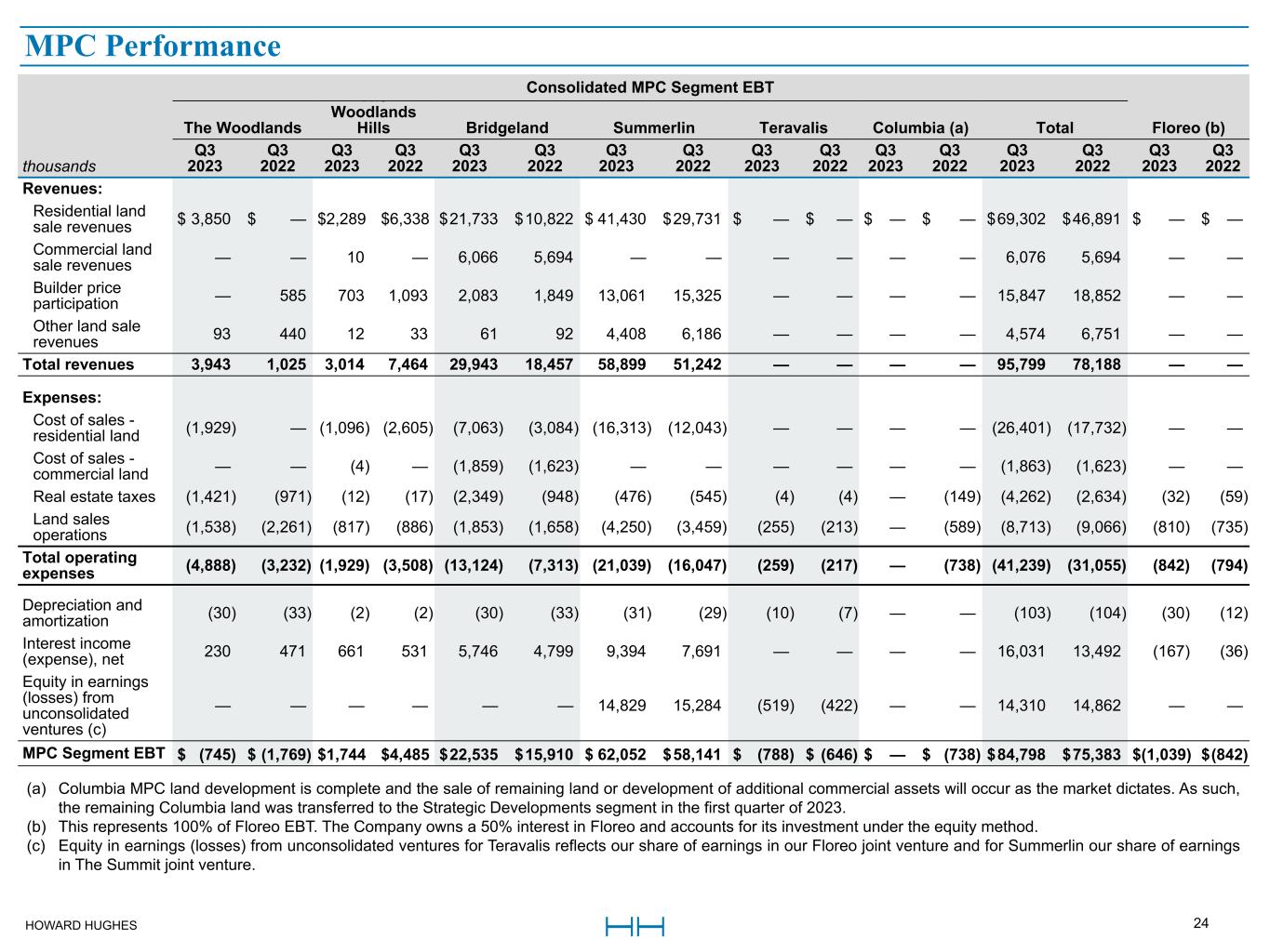 HOWARD HUGHES 24 Master Planned Community Land Consolidated MPC Segment EBT The Woodlands The  Woodlands  Hills Bridgeland Summerlin Teravalis Columbia (a) Total Floreo (b) thousands Q3  2023 Q3  2022 Q3  2023 Q3  2022 Q3  2023 Q3  2022 Q3 2023 Q3  2022 Q3 2023 Q3  2022 Q3  2023 Q3  2022 Q3 2023 Q3 2022 Q3 2023 Q3 2022 Revenues: Residential land  sale revenues $ 3,850 $ — $ 2,289 $ 6,338 $ 21,733 $ 10,822 $ 41,430 $ 29,731 $ — $ — $ — $ — $ 69,302 $ 46,891 $ — $ —  Commercial land  sale revenues  —  —  10  —  6,066  5,694  —  —  —  —  —  —  6,076  5,694  —  —  Builder price  participation  —  585  703  1,093  2,083  1,849  13,061  15,325  —  —  —  —  15,847  18,852  —  —  Other land sale  revenues  93  440  12  33  61  92  4,408  6,186  —  —  —  —  4,574  6,751  —  —  Total revenues  3,943  1,025  3,014  7,464  29,943  18,457  58,899  51,242  —  —  —  —  95,799  78,188  —  —  Expenses: Cost of sales -  residential land  (1,929)  —  (1,096)  (2,605)  (7,063)  (3,084)  (16,313)  (12,043)  —  —  —  —  (26,401)  (17,732)  —  —  Cost of sales -  commercial land  —  —  (4)  —  (1,859)  (1,623)  —  —  —  —  —  —  (1,863)  (1,623)  —  —  Real estate taxes  (1,421)  (971)  (12)  (17)  (2,349)  (948)  (476)  (545)  (4)  (4)  —  (149)  (4,262)  (2,634)  (32)  (59)  Land sales  operations  (1,538)  (2,261)  (817)  (886)  (1,853)  (1,658)  (4,250)  (3,459)  (255)  (213)  —  (589)  (8,713)  (9,066)  (810)  (735)  Total operating  expenses  (4,888)  (3,232)  (1,929)  (3,508)  (13,124)  (7,313)  (21,039)  (16,047)  (259)  (217)  —  (738)  (41,239)  (31,055)  (842)  (794)  Depreciation and  amortization  (30)  (33)  (2)  (2)  (30)  (33)  (31)  (29)  (10)  (7)  —  —  (103)  (104)  (30)  (12)  Interest income  (expense), net  230  471  661  531  5,746  4,799  9,394  7,691  —  —  —  —  16,031  13,492  (167)  (36)  Equity in earnings  (losses) from  unconsolidated  ventures (c)  —  —  —  —  —  —  14,829  15,284  (519)  (422)  —  —  14,310  14,862  —  —  MPC Segment EBT $ (745) $ (1,769) $ 1,744 $ 4,485 $ 22,535 $ 15,910 $ 62,052 $ 58,141 $ (788) $ (646) $ — $ (738) $ 84,798 $ 75,383 $ (1,039) $ (842)  (a) Columbia MPC land development is complete and the sale of remaining land or development of additional commercial assets will occur as the market dictates. As such,  the remaining Columbia land was transferred to the Strategic Developments segment in the first quarter of 2023. (b) This represents 100% of Floreo EBT. The Company owns a 50% interest in Floreo and accounts for its investment under the equity method.  (c) Equity in earnings (losses) from unconsolidated ventures for Teravalis reflects our share of earnings in our Floreo joint venture and for Summerlin our share of earnings  in The Summit joint venture. MPC Performance