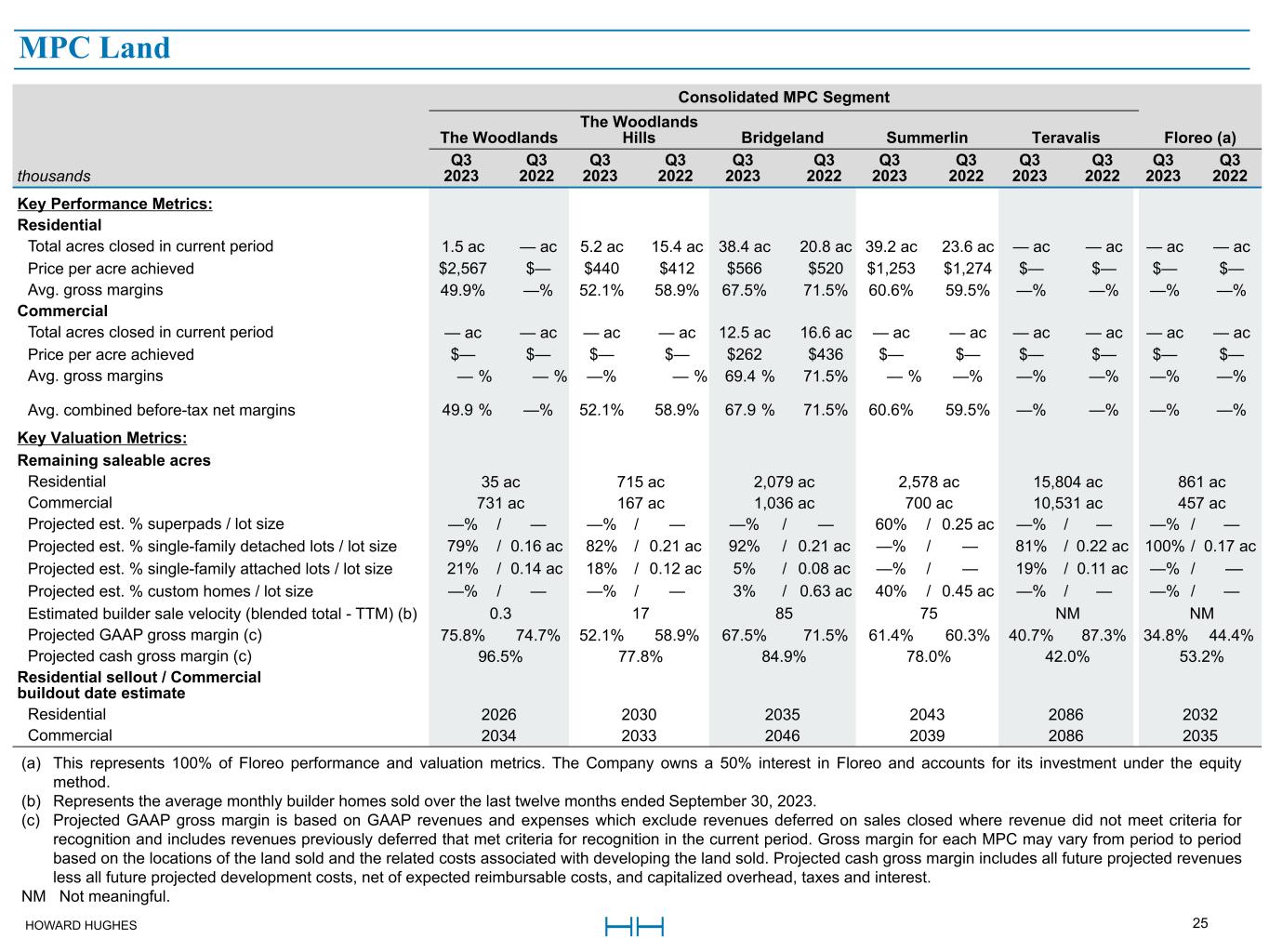 HOWARD HUGHES 25 Master Planned Community Land Consolidated MPC Segment The Woodlands The Woodlands  Hills Bridgeland Summerlin Teravalis Floreo (a) thousands Q3  2023 Q3  2022 Q3  2023 Q3  2022 Q3  2023 Q3  2022 Q3 2023 Q3  2022 Q3 2023 Q3  2022 Q3  2023 Q3  2022 Key Performance Metrics: Residential Total acres closed in current period 1.5 ac — ac 5.2 ac 15.4 ac 38.4 ac 20.8 ac 39.2 ac 23.6 ac — ac — ac — ac — ac Price per acre achieved $2,567 $— $440 $412 $566 $520 $1,253 $1,274 $— $— $— $— Avg. gross margins 49.9% —% 52.1% 58.9% 67.5% 71.5% 60.6% 59.5% —% —% —% —% Commercial Total acres closed in current period — ac — ac — ac — ac 12.5 ac 16.6 ac — ac — ac — ac — ac — ac — ac Price per acre achieved $— $— $— $— $262 $436 $— $— $— $— $— $— Avg. gross margins  — %  — % —%  — %  69.4 % 71.5%  — % —% —% —% —% —% Avg. combined before-tax net margins  49.9 % —% 52.1% 58.9%  67.9 % 71.5% 60.6% 59.5% —% —% —% —% Key Valuation Metrics: Remaining saleable acres Residential 35 ac 715 ac 2,079 ac 2,578 ac 15,804 ac 861 ac Commercial 731 ac 167 ac 1,036 ac 700 ac 10,531 ac 457 ac Projected est. % superpads / lot size —% / — —% / — —% / — 60% / 0.25 ac —% / — —% / — Projected est. % single-family detached lots / lot size 79% / 0.16 ac 82% / 0.21 ac 92% / 0.21 ac —% /  — 81% / 0.22 ac 100% / 0.17 ac Projected est. % single-family attached lots / lot size 21% / 0.14 ac 18% / 0.12 ac 5% / 0.08 ac —% /  — 19% / 0.11 ac —% /  —  Projected est. % custom homes / lot size —% / — —% / — 3% / 0.63 ac 40% / 0.45 ac —% / — —% / — Estimated builder sale velocity (blended total - TTM) (b) 0.3 17 85 75 NM NM Projected GAAP gross margin (c) 75.8% 74.7% 52.1% 58.9% 67.5% 71.5% 61.4% 60.3% 40.7% 87.3% 34.8% 44.4% Projected cash gross margin (c) 96.5% 77.8% 84.9% 78.0% 42.0% 53.2% Residential sellout / Commercial  buildout date estimate Residential 2026 2030 2035 2043 2086 2032 Commercial 2034 2033 2046 2039 2086 2035 (a) This represents 100% of Floreo performance and valuation metrics. The Company owns a 50% interest in Floreo and accounts for its investment under the equity  method.  (b) Represents the average monthly builder homes sold over the last twelve months ended September 30, 2023.       (c) Projected GAAP gross margin is based on GAAP revenues and expenses which exclude revenues deferred on sales closed where revenue did not meet criteria for  recognition and includes revenues previously deferred that met criteria for recognition in the current period. Gross margin for each MPC may vary from period to period  based on the locations of the land sold and the related costs associated with developing the land sold. Projected cash gross margin includes all future projected revenues  less all future projected development costs, net of expected reimbursable costs, and capitalized overhead, taxes and interest. NM   Not meaningful. MPC Land