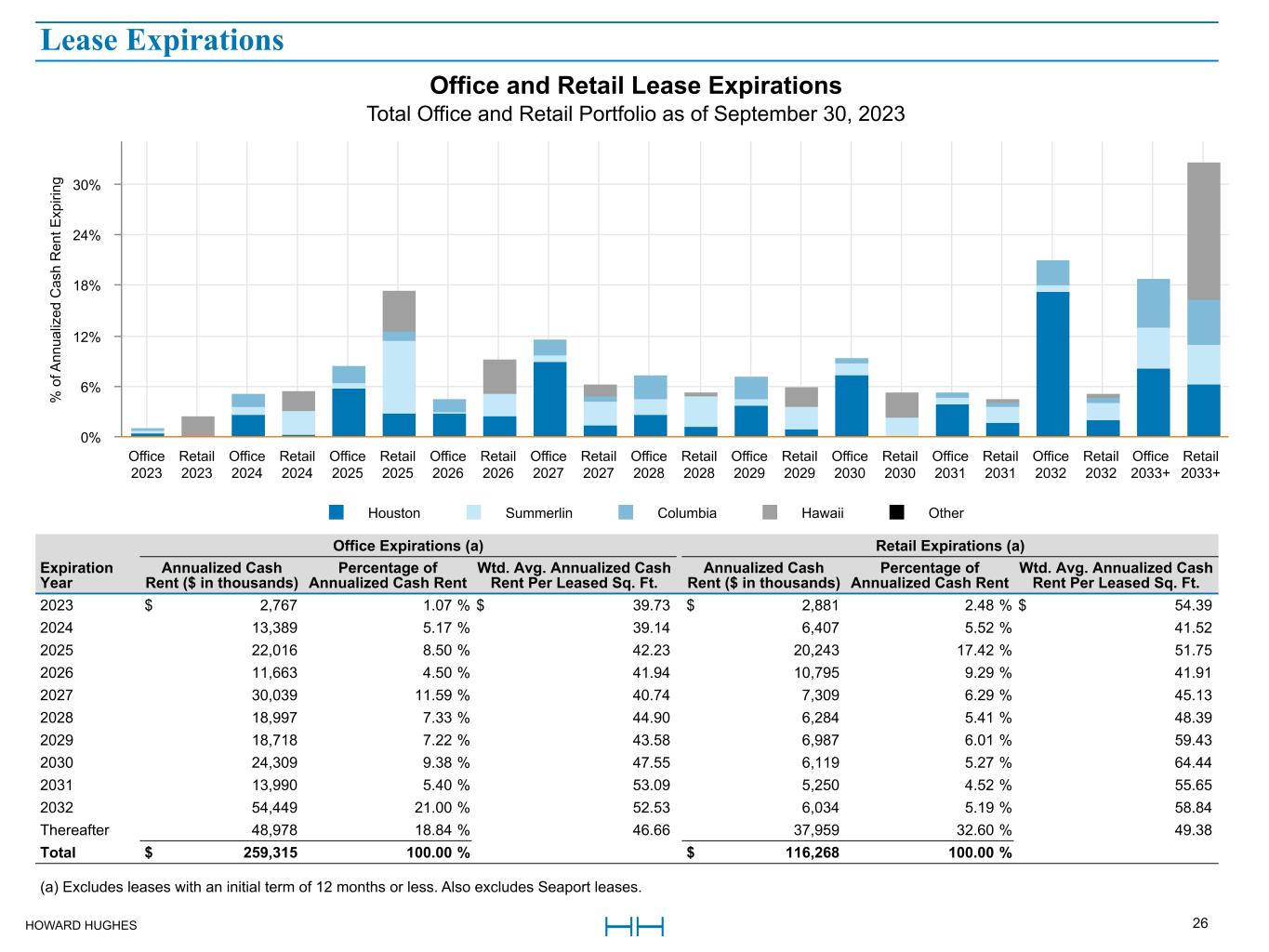 HOWARD HUGHES 26 Office Expirations (a) Retail Expirations (a) Expiration  Year Annualized Cash  Rent ($ in thousands) Percentage of  Annualized Cash Rent Wtd. Avg. Annualized Cash  Rent Per Leased Sq. Ft. Annualized Cash  Rent ($ in thousands) Percentage of  Annualized Cash Rent Wtd. Avg. Annualized Cash  Rent Per Leased Sq. Ft. 2023 $ 2,767  1.07 % $ 39.73 $ 2,881  2.48 % $ 54.39  2024  13,389  5.17 %  39.14  6,407  5.52 %  41.52  2025  22,016  8.50 %  42.23  20,243  17.42 %  51.75  2026  11,663  4.50 %  41.94  10,795  9.29 %  41.91  2027  30,039  11.59 %  40.74  7,309  6.29 %  45.13  2028  18,997  7.33 %  44.90  6,284  5.41 %  48.39  2029  18,718  7.22 %  43.58  6,987  6.01 %  59.43  2030  24,309  9.38 %  47.55  6,119  5.27 %  64.44  2031  13,990  5.40 %  53.09  5,250  4.52 %  55.65  2032  54,449  21.00 %  52.53  6,034  5.19 %  58.84  Thereafter  48,978  18.84 %  46.66  37,959  32.60 %  49.38  Total $ 259,315  100.00 % $ 116,268  100.00 % (a) Excludes leases with an initial term of 12 months or less. Also excludes Seaport leases. Office and Retail Lease Expirations Total Office and Retail Portfolio as of September 30, 2023 %  o f A nn ua liz ed  C as h  R en t E xp iri ng Houston Summerlin Columbia Hawaii Other Office  2023 Retail  2023 Office  2024 Retail  2024 Office  2025 Retail  2025 Office  2026 Retail  2026 Office  2027 Retail  2027 Office  2028 Retail  2028 Office  2029 Retail  2029 Office  2030 Retail  2030 Office  2031 Retail  2031 Office  2032 Retail  2032 Office  2033+ Retail  2033+ 0% 6% 12% 18% 24% 30% Lease Expirations