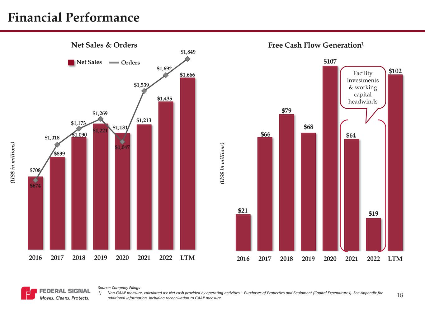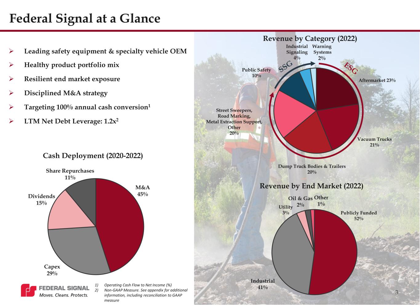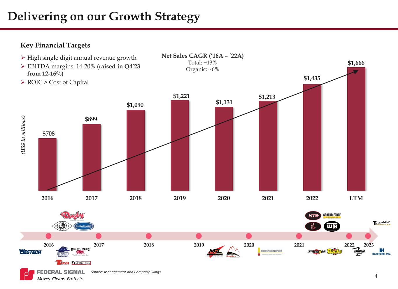 Federal Signal at a Glance Leading safety equipment & specialty vehicle OEM Healthy product portfolio mix Resilient end market exposure Disciplined M&A strategy Targeting 100% annual cash conversion1 LTM Net Debt Leverage: 1.2x2 M&A 45% Capex 29% Dividends 15% Share Repurchases 11% Cash Deployment (2020-2022) Publicly Funded 52% Industrial 41% Utility 3% Oil & Gas 2% Other 1% 3 Aftermarket 23% Vacuum Trucks 21% Dump Truck Bodies & Trailers 20% Public Safety 10% Street Sweepers, Road Marking, Metal Extraction Support, Other 20% Industrial Signaling 4% Warning Systems 2% 1) Operating Cash Flow to Net Income (%) 2) Non-GAAP Measure. See appendix for additional information, including reconciliation to GAAP measure Revenue by Category (2022) Revenue by End Market (2022)