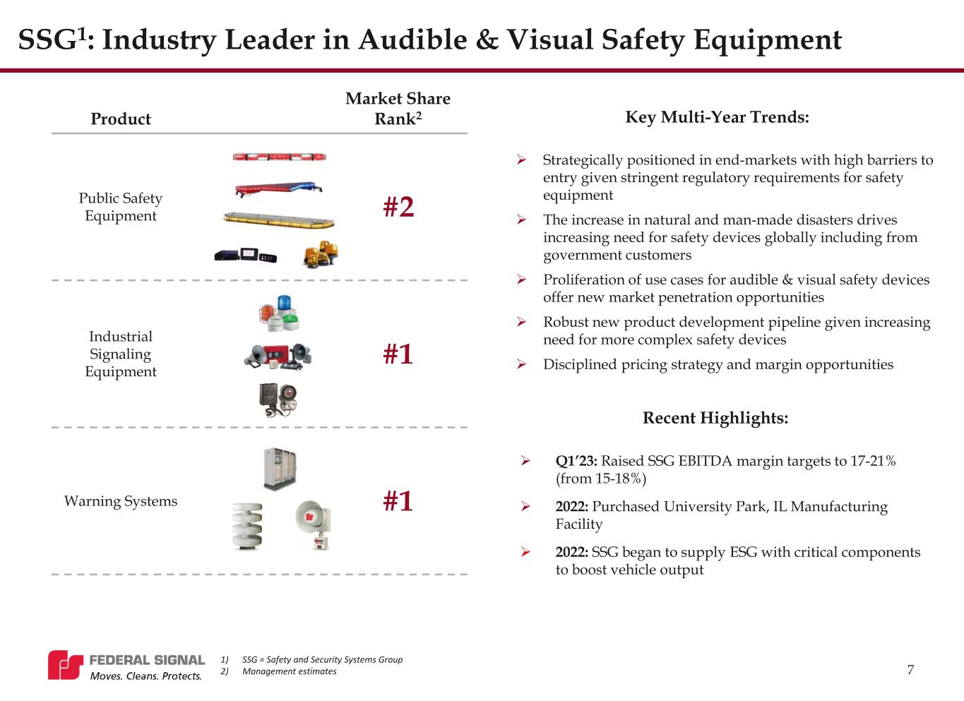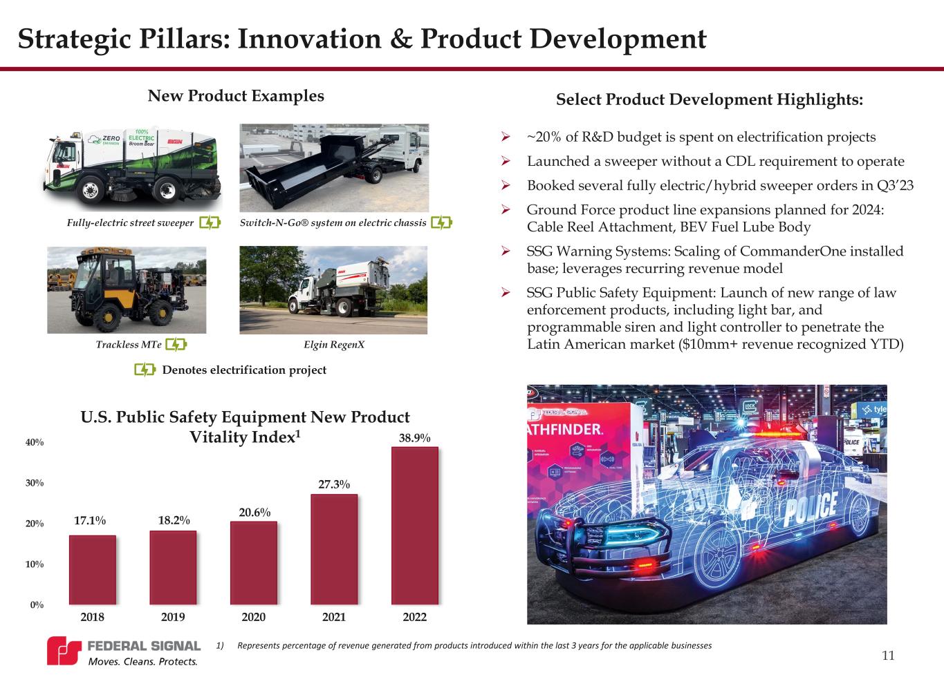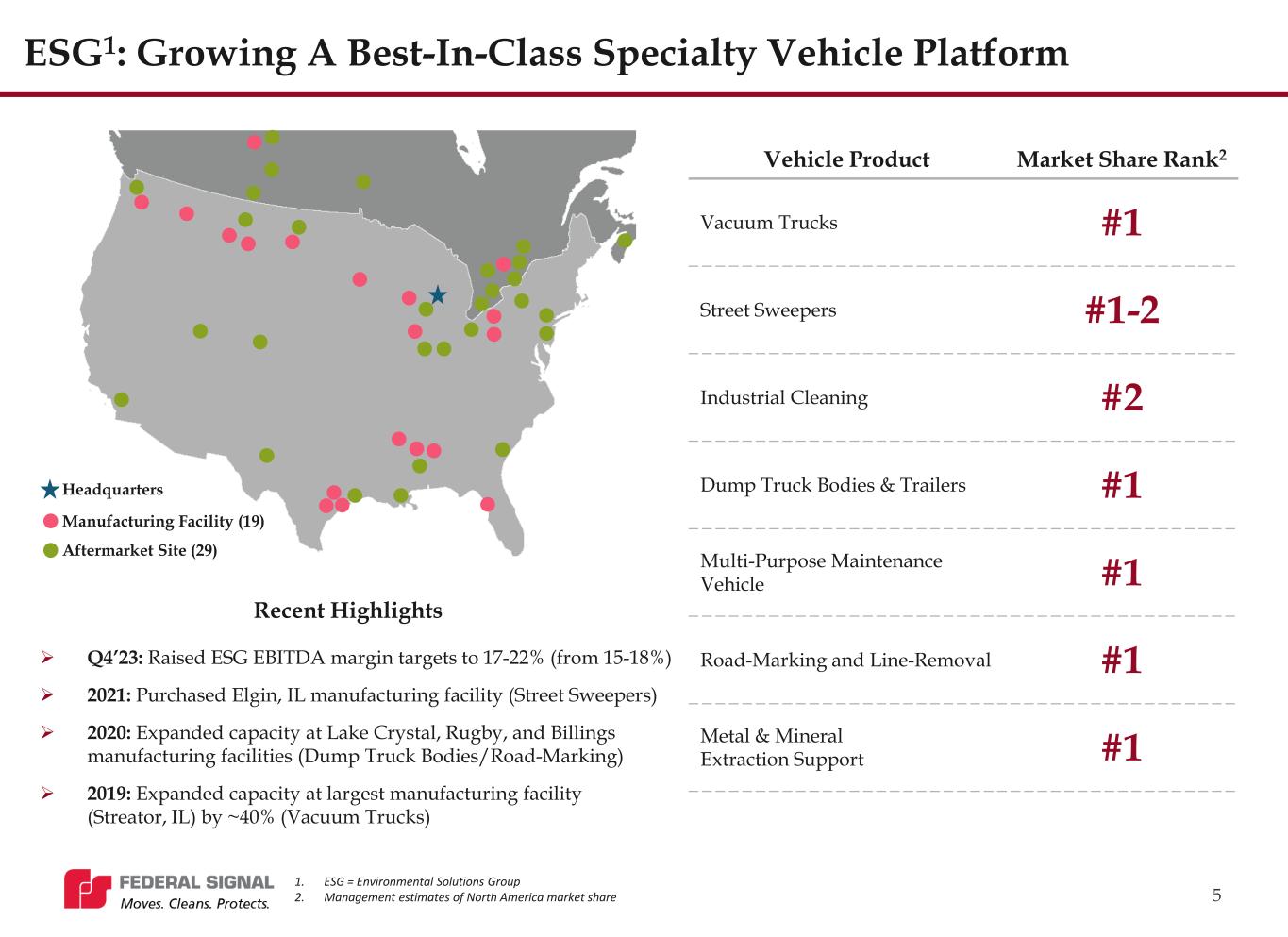 Federal Signal at a Glance Leading safety equipment & specialty vehicle OEM Healthy product portfolio mix Resilient end market exposure Disciplined M&A strategy Targeting 100% annual cash conversion1 LTM Net Debt Leverage: 1.2x2 M&A 45% Capex 29% Dividends 15% Share Repurchases 11% Cash Deployment (2020-2022) Publicly Funded 52% Industrial 41% Utility 3% Oil & Gas 2% Other 1% 3 Aftermarket 23% Vacuum Trucks 21% Dump Truck Bodies & Trailers 20% Public Safety 10% Street Sweepers, Road Marking, Metal Extraction Support, Other 20% Industrial Signaling 4% Warning Systems 2% 1) Operating Cash Flow to Net Income (%) 2) Non-GAAP Measure. See appendix for additional information, including reconciliation to GAAP measure Revenue by Category (2022) Revenue by End Market (2022)