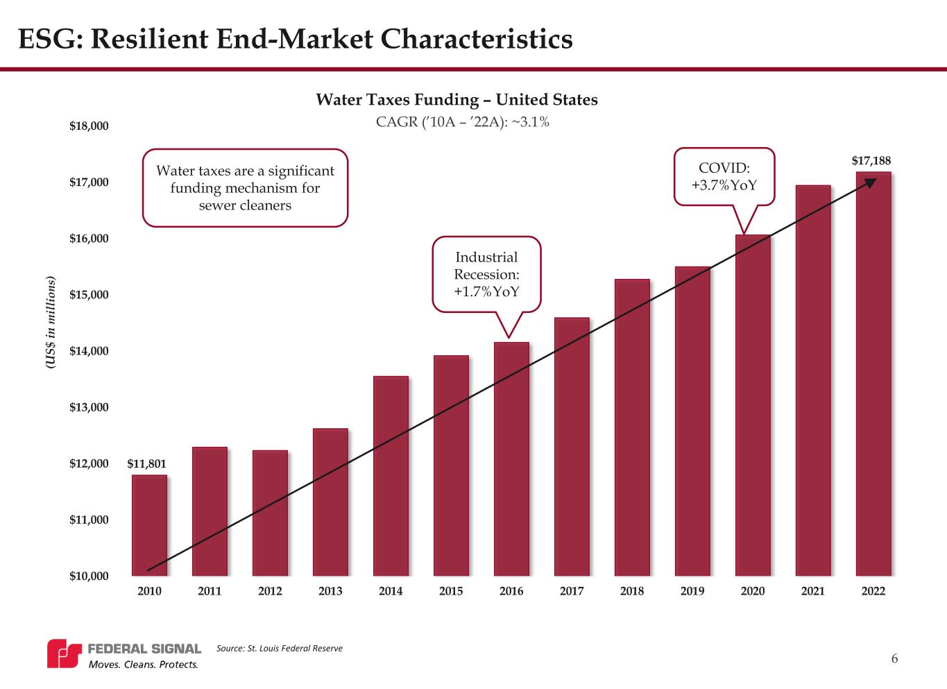 $10,000 $11,000 $12,000 $13,000 $14,000 $15,000 $16,000 $17,000 $18,000 2010 2011 2012 2013 2014 2015 2016 2017 2018 2019 2020 2021 2022 6 ESG: Resilient End-Market Characteristics Water Taxes Funding – United States CAGR (’10A – ’22A): ~3.1% Industrial Recession: +1.7%YoY COVID: +3.7%YoY $11,801 $17,188 Source: St. Louis Federal Reserve Water taxes are a significant funding mechanism for sewer cleaners (U S$ in m ill io ns )