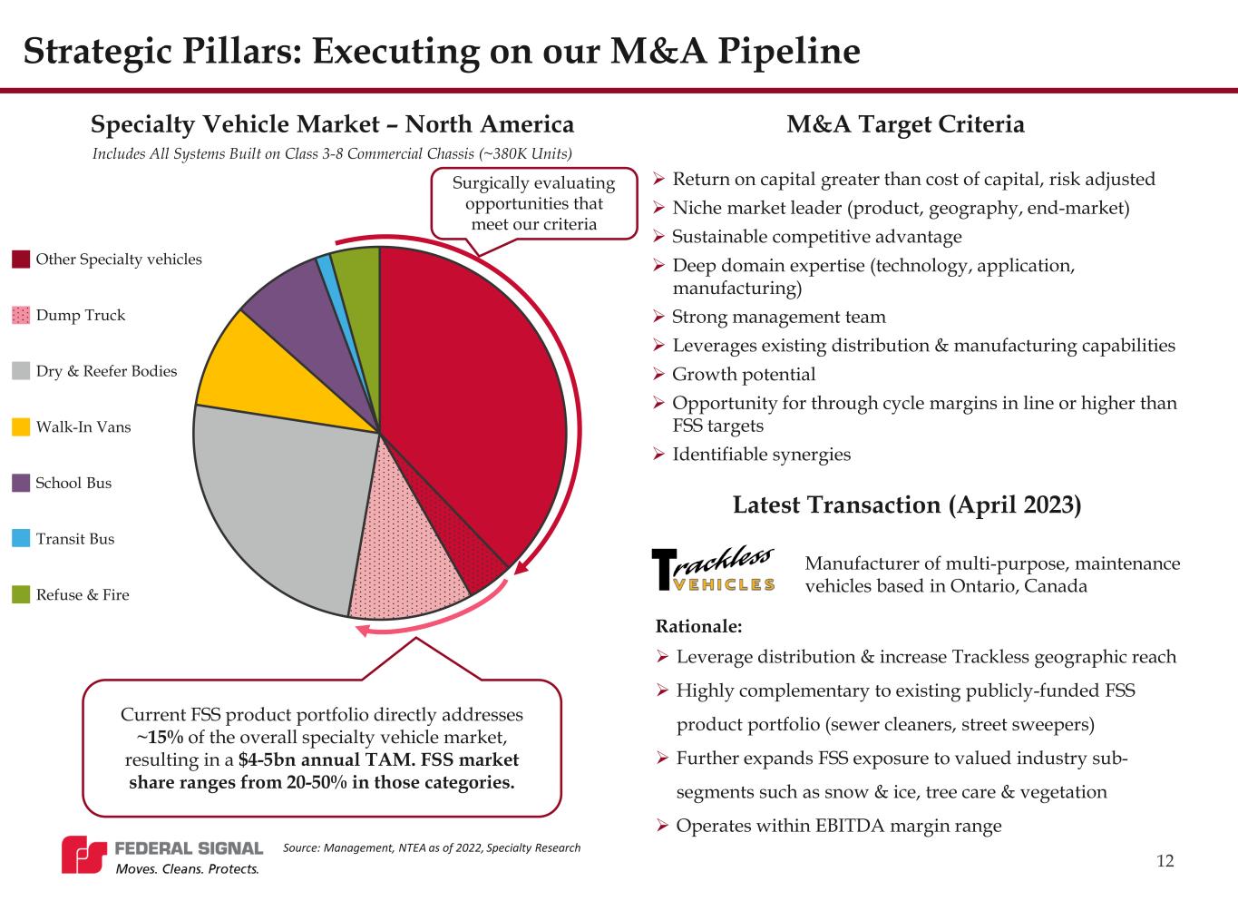 12 Strategic Pillars: Executing on our M&A Pipeline M&A Target Criteria Return on capital greater than cost of capital, risk adjusted Niche market leader (product, geography, end-market) Sustainable competitive advantage Deep domain expertise (technology, application, manufacturing) Strong management team Leverages existing distribution & manufacturing capabilities Growth potential Opportunity for through cycle margins in line or higher than FSS targets Identifiable synergies Latest Transaction (April 2023) Rationale: Leverage distribution & increase Trackless geographic reach Highly complementary to existing publicly-funded FSS product portfolio (sewer cleaners, street sweepers) Further expands FSS exposure to valued industry sub- segments such as snow & ice, tree care & vegetation Operates within EBITDA margin range Manufacturer of multi-purpose, maintenance vehicles based in Ontario, Canada Specialty Vehicle Market – North America Includes All Systems Built on Class 3-8 Commercial Chassis (~380K Units) Current FSS product portfolio directly addresses ~15% of the overall specialty vehicle market, resulting in a $4-5bn annual TAM. FSS market share ranges from 20-50% in those categories. Source: Management, NTEA as of 2022, Specialty Research Surgically evaluating opportunities that meet our criteria Other Specialty vehicles Dump Truck Dry & Reefer Bodies Walk-In Vans School Bus Transit Bus Refuse & Fire