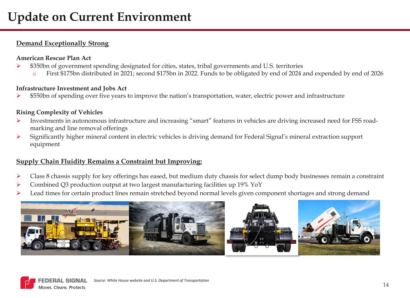 14 Update on Current Environment Demand Exceptionally Strong American Rescue Plan Act $350bn of government spending designated for cities, states, tribal governments and U.S. territories o First $175bn distributed in 2021; second $175bn in 2022. Funds to be obligated by end of 2024 and expended by end of 2026 Infrastructure Investment and Jobs Act $550bn of spending over five years to improve the nation’s transportation, water, electric power and infrastructure Rising Complexity of Vehicles Investments in autonomous infrastructure and increasing “smart” features in vehicles are driving increased need for FSS road- marking and line removal offerings Significantly higher mineral content in electric vehicles is driving demand for Federal Signal’s mineral extraction support equipment Supply Chain Fluidity Remains a Constraint but Improving: Class 8 chassis supply for key offerings has eased, but medium duty chassis for select dump body businesses remain a constraint Combined Q3 production output at two largest manufacturing facilities up 19% YoY Lead times for certain product lines remain stretched beyond normal levels given component shortages and strong demand Source: White House website and U.S. Department of Transportation