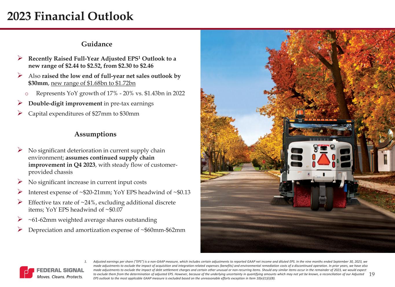 19 2023 Financial Outlook Recently Raised Full-Year Adjusted EPS1 Outlook to a new range of $2.44 to $2.52, from $2.30 to $2.46 Also raised the low end of full-year net sales outlook by $30mm, new range of $1.68bn to $1.72bn o Represents YoY growth of 17% - 20% vs. $1.43bn in 2022 Double-digit improvement in pre-tax earnings Capital expenditures of $27mm to $30mm Guidance Assumptions No significant deterioration in current supply chain environment; assumes continued supply chain improvement in Q4 2023, with steady flow of customer- provided chassis No significant increase in current input costs Interest expense of ~$20-21mm; YoY EPS headwind of ~$0.13 Effective tax rate of ~24%, excluding additional discrete items; YoY EPS headwind of ~$0.07 ~61-62mm weighted average shares outstanding Depreciation and amortization expense of ~$60mm-$62mm 1. Adjusted earnings per share (“EPS”) is a non-GAAP measure, which includes certain adjustments to reported GAAP net income and diluted EPS. In the nine months ended September 30, 2023, we made adjustments to exclude the impact of acquisition and integration-related expenses (benefits) and environmental remediation costs of a discontinued operation. In prior years, we have also made adjustments to exclude the impact of debt settlement charges and certain other unusual or non-recurring items. Should any similar items occur in the remainder of 2023, we would expect to exclude them from the determination of adjusted EPS. However, because of the underlying uncertainty in quantifying amounts which may not yet be known, a reconciliation of our Adjusted EPS outlook to the most applicable GAAP measure is excluded based on the unreasonable efforts exception in Item 10(e)(1)(i)(B).
