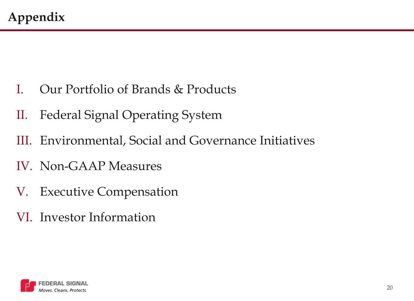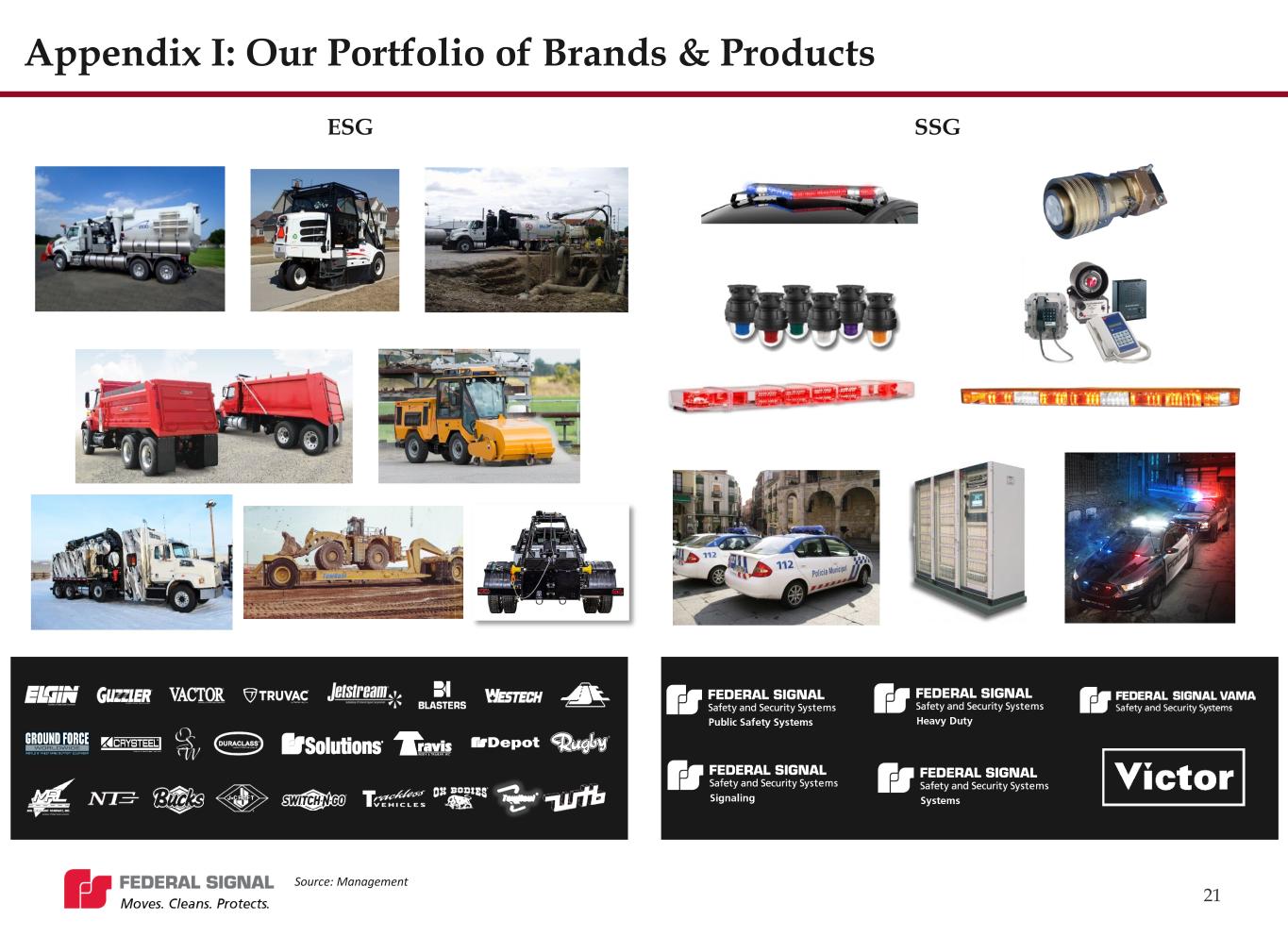 20 Appendix I. Our Portfolio of Brands & Products II. Federal Signal Operating System III. Environmental, Social and Governance Initiatives IV. Non-GAAP Measures V. Executive Compensation VI. Investor Information