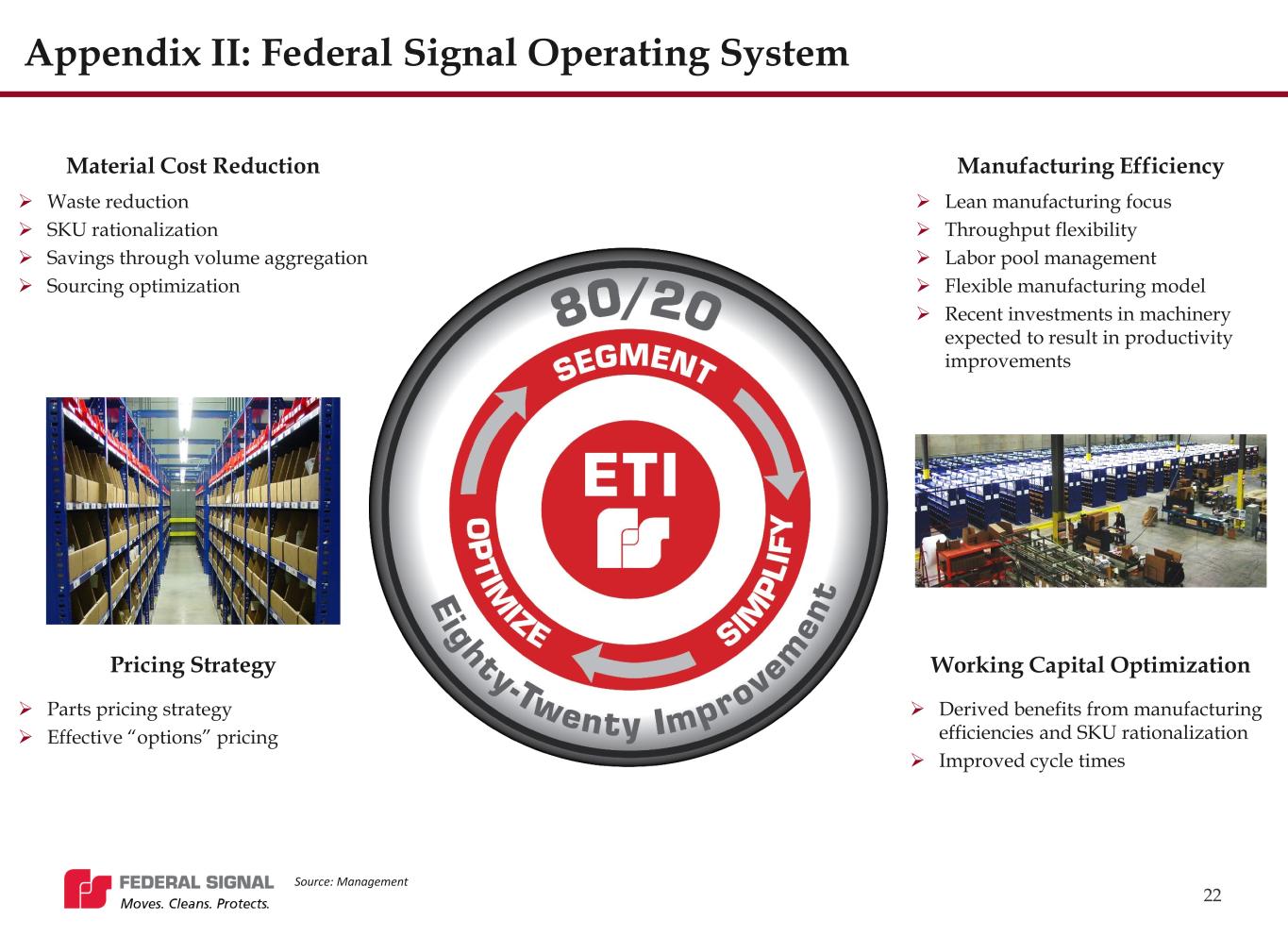 22 Appendix II: Federal Signal Operating System Material Cost Reduction Waste reduction SKU rationalization Savings through volume aggregation Sourcing optimization Manufacturing Efficiency Lean manufacturing focus Throughput flexibility Labor pool management Flexible manufacturing model Recent investments in machinery expected to result in productivity improvements Working Capital Optimization Derived benefits from manufacturing efficiencies and SKU rationalization Improved cycle times Pricing Strategy Parts pricing strategy Effective “options” pricing Source: Management