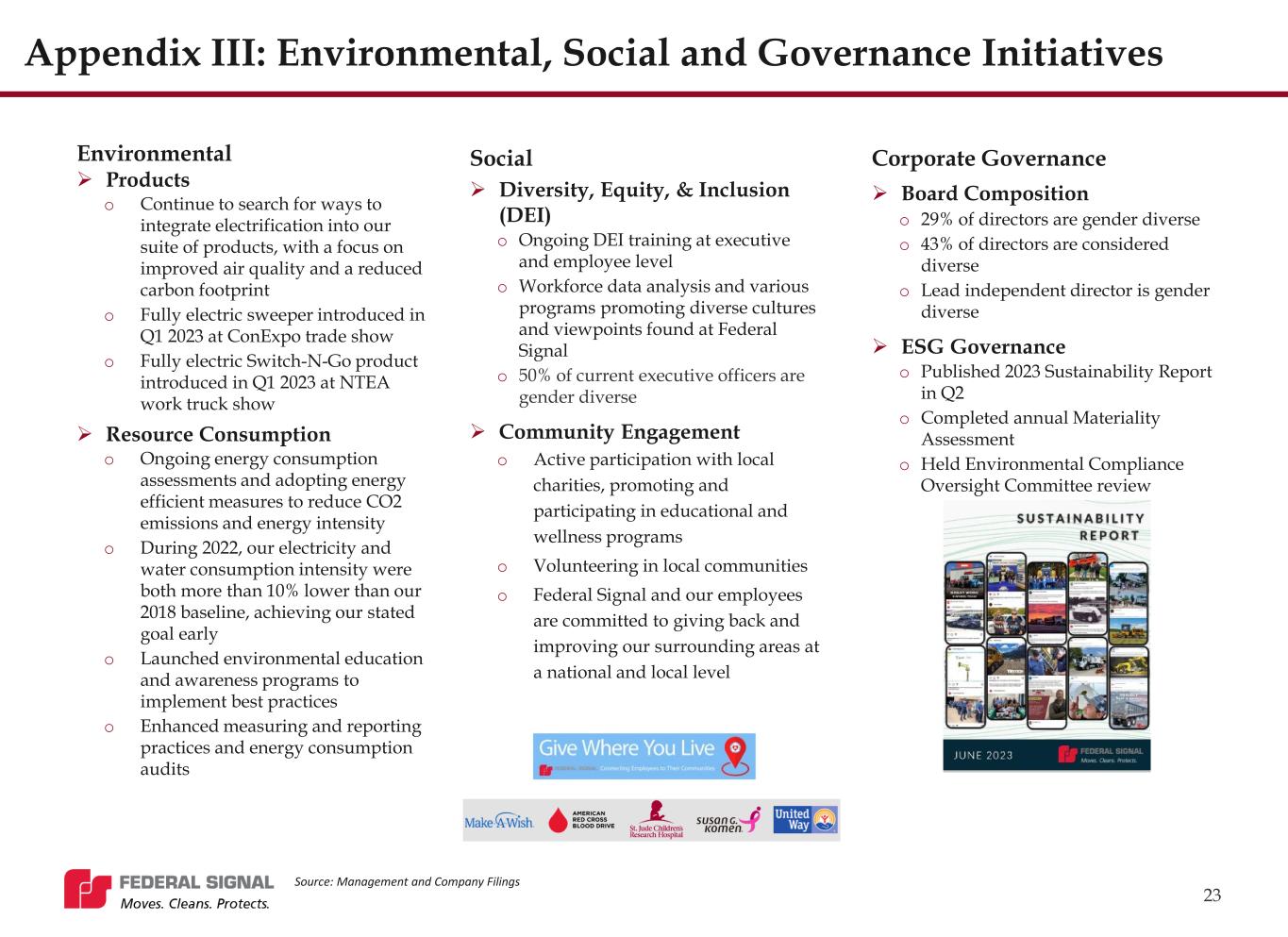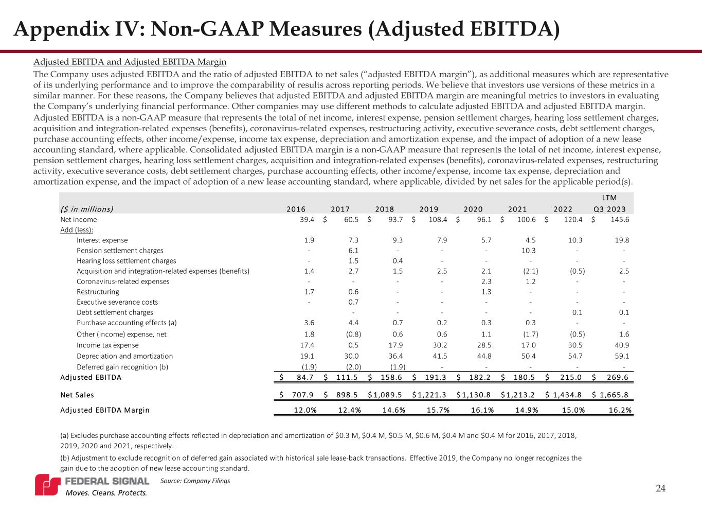 23 Appendix III: Environmental, Social and Governance Initiatives Environmental Products o Continue to search for ways to integrate electrification into our suite of products, with a focus on improved air quality and a reduced carbon footprint o Fully electric sweeper introduced in Q1 2023 at ConExpo trade show o Fully electric Switch-N-Go product introduced in Q1 2023 at NTEA work truck show Resource Consumption o Ongoing energy consumption assessments and adopting energy efficient measures to reduce CO2 emissions and energy intensity o During 2022, our electricity and water consumption intensity were both more than 10% lower than our 2018 baseline, achieving our stated goal early o Launched environmental education and awareness programs to implement best practices o Enhanced measuring and reporting practices and energy consumption audits Social Diversity, Equity, & Inclusion (DEI) o Ongoing DEI training at executive and employee level o Workforce data analysis and various programs promoting diverse cultures and viewpoints found at Federal Signal o 50% of current executive officers are gender diverse Community Engagement o Active participation with local charities, promoting and participating in educational and wellness programs o Volunteering in local communities o Federal Signal and our employees are committed to giving back and improving our surrounding areas at a national and local level Corporate Governance Board Composition o 29% of directors are gender diverse o 43% of directors are considered diverse o Lead independent director is gender diverse ESG Governance o Published 2023 Sustainability Report in Q2 o Completed annual Materiality Assessment o Held Environmental Compliance Oversight Committee review Source: Management and Company Filings