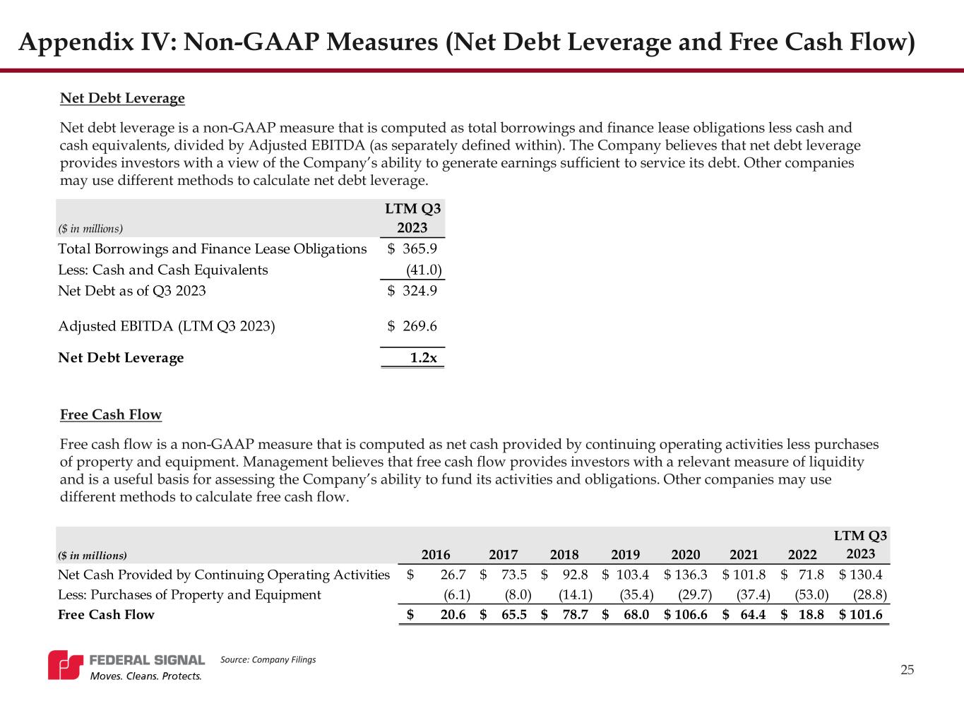 24 Appendix IV: Non-GAAP Measures (Adjusted EBITDA) Source: Company Filings LTM ($ in mil l ions) 2016 2017 2018 2019 2020 2021 2022 Q3 2023 Net income 39.4 60.5$ 93.7$ 108.4$ 96.1$ 100.6$ 120.4$ 145.6$ Add (less): Interest expense 1.9 7.3 9.3 7.9 5.7 4.5 10.3 19.8 Pension settlement charges - 6.1 - - - 10.3 - - Hearing loss settlement charges - 1.5 0.4 - - - - - Acquisition and integration-related expenses (benefits) 1.4 2.7 1.5 2.5 2.1 (2.1) (0.5) 2.5 Coronavirus-related expenses - - - - 2.3 1.2 - - Restructuring 1.7 0.6 - - 1.3 - - - Executive severance costs - 0.7 - - - - - - Debt settlement charges - - - - - 0.1 0.1 Purchase accounting effects (a) 3.6 4.4 0.7 0.2 0.3 0.3 - - Other (income) expense, net 1.8 (0.8) 0.6 0.6 1.1 (1.7) (0.5) 1.6 Income tax expense 17.4 0.5 17.9 30.2 28.5 17.0 30.5 40.9 Depreciation and amortization 19.1 30.0 36.4 41.5 44.8 50.4 54.7 59.1 Deferred gain recognition (b) (1.9) (2.0) (1.9) - - - - - Adjusted EBITDA 84.7$ 111 .5$ 158 .6$ 191 .3$ 182 .2$ 180 .5$ 215 .0$ 269 .6$ Net Sales 707.9$ 898 .5$ 1 ,089.5$ 1 ,221.3$ 1 ,130.8$ 1 ,213.2$ 1 ,434.8$ 1 ,665.8$ Adjusted EBITDA Margin 12.0% 12.4% 14.6% 15.7% 16.1% 14.9% 15.0% 16.2% (a) Excludes purchase accounting effects reflected in depreciation and amortization of $0.3 M, $0.4 M, $0.5 M, $0.6 M, $0.4 M and $0.4 M for 2016, 2017, 2018, 2019, 2020 and 2021, respectively. (b) Adjustment to exclude recognition of deferred gain associated with historical sale lease-back transactions. Effective 2019, the Company no longer recognizes the gain due to the adoption of new lease accounting standard. Adjusted EBITDA and Adjusted EBITDA Margin The Company uses adjusted EBITDA and the ratio of adjusted EBITDA to net sales (“adjusted EBITDA margin”), as additional measures which are representative of its underlying performance and to improve the comparability of results across reporting periods. We believe that investors use versions of these metrics in a similar manner. For these reasons, the Company believes that adjusted EBITDA and adjusted EBITDA margin are meaningful metrics to investors in evaluating the Company’s underlying financial performance. Other companies may use different methods to calculate adjusted EBITDA and adjusted EBITDA margin. Adjusted EBITDA is a non-GAAP measure that represents the total of net income, interest expense, pension settlement charges, hearing loss settlement charges, acquisition and integration-related expenses (benefits), coronavirus-related expenses, restructuring activity, executive severance costs, debt settlement charges, purchase accounting effects, other income/expense, income tax expense, depreciation and amortization expense, and the impact of adoption of a new lease accounting standard, where applicable. Consolidated adjusted EBITDA margin is a non-GAAP measure that represents the total of net income, interest expense, pension settlement charges, hearing loss settlement charges, acquisition and integration-related expenses (benefits), coronavirus-related expenses, restructuring activity, executive severance costs, debt settlement charges, purchase accounting effects, other income/expense, income tax expense, depreciation and amortization expense, and the impact of adoption of a new lease accounting standard, where applicable, divided by net sales for the applicable period(s).